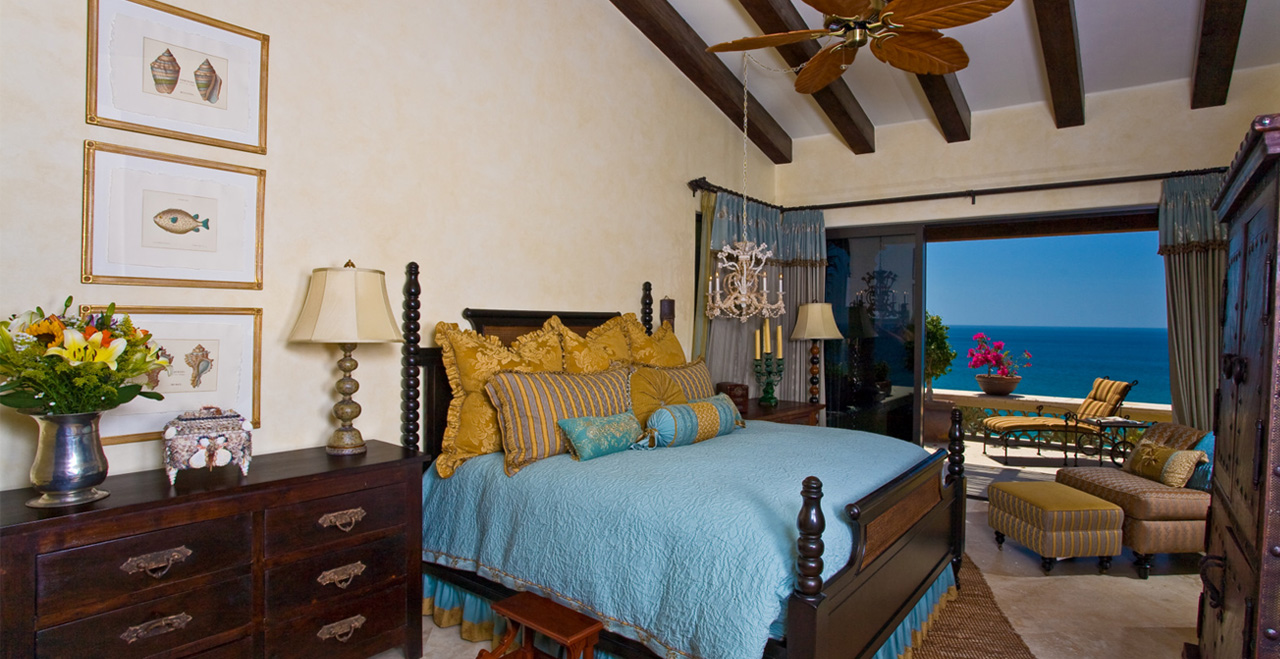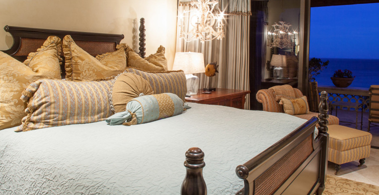 The design team was able to begin working their magic while Suenos del Mar was still under construction meaning our signature footprint was there from Day One. Our team hand-selected the tiles to be used throughout, and added dramatic details to the living area including wood beams and a built-in entertainment cabinet to conceal the large HDTV. We also added French doors to both sides of the dining area, allowing for the sounds of the courtyard fountain on one side and wonderful ocean views on the other.