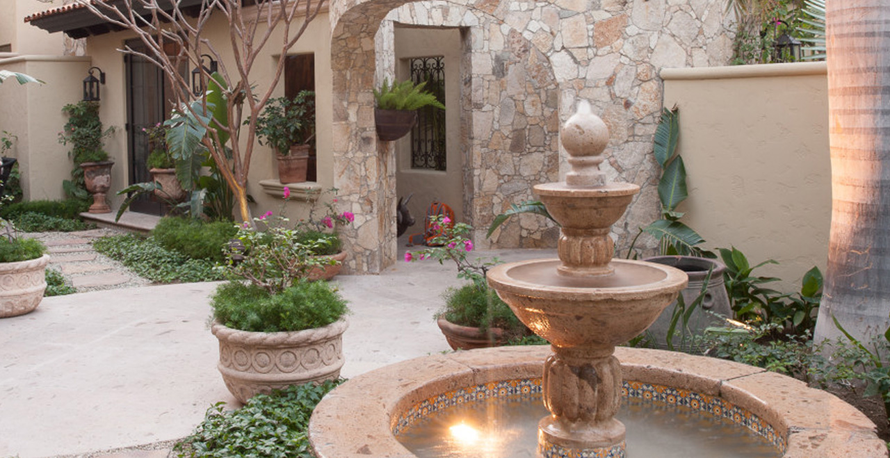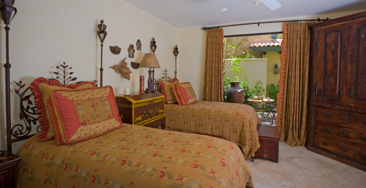 The Courtyard Suite: In this flexible, garden-side room on the lower level of the main house, two twin beds can combine to create one king. Regardless of its configuration, the Signature bed provides custom fabrics and bedding, double pillow-top mattresses, down/feather pillows, and intricate iron headboards. The Spanish-style décor includes a handcrafted armoire, which holds an HDTV, and hand-painted furniture. A sliding glass wall opens to the courtyard with a sitting area and the burbling sounds of the fountain morning coffee is never more luxurious than at the bistro table in this courtyard. An en-suite bathroom in this suite boasts a large walk-in shower for when the coffee mug has been drained and it’s time to begin your day in Los Cabos.