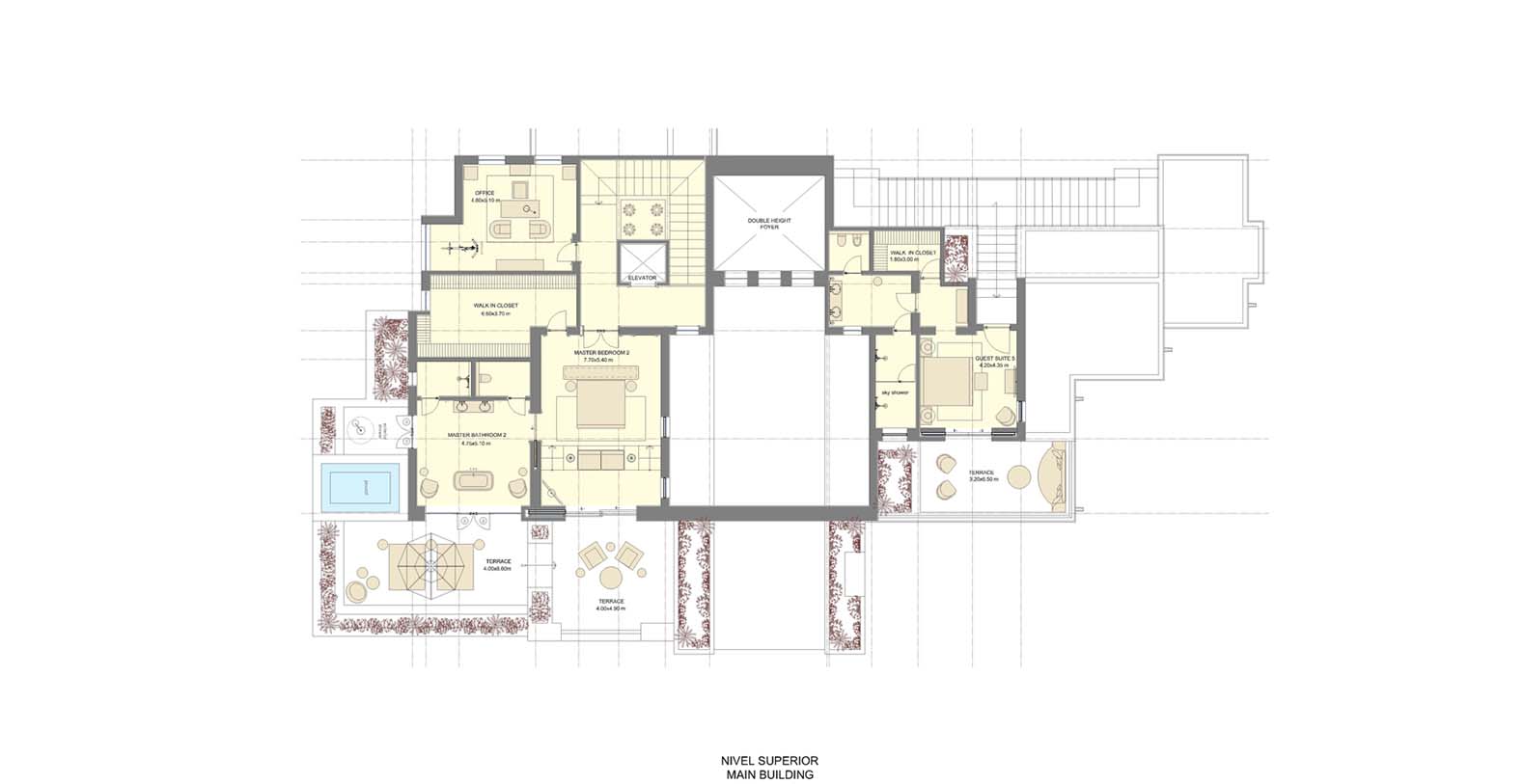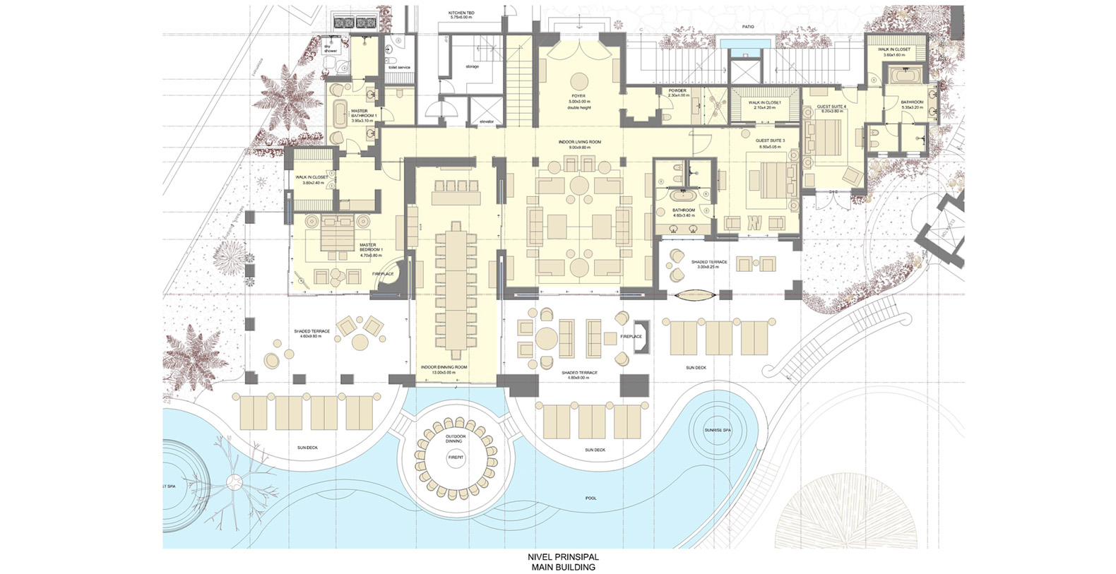 The villa can easily accommodate up to 20 people as it has two large and eight regular-size bedrooms, each with an ensuite bathroom, a toilet and a walk-in wardrobe. The two large bedrooms each have an adjacent private terrace — one with a fireplace and the other with a swimming pool. The latter bedroom also features a study. The villa has several dining areas that can accommodate all the guests. They may gather at a big table in the spacious hall or have a fire-lit dinner in a special sitting area inside the pool.