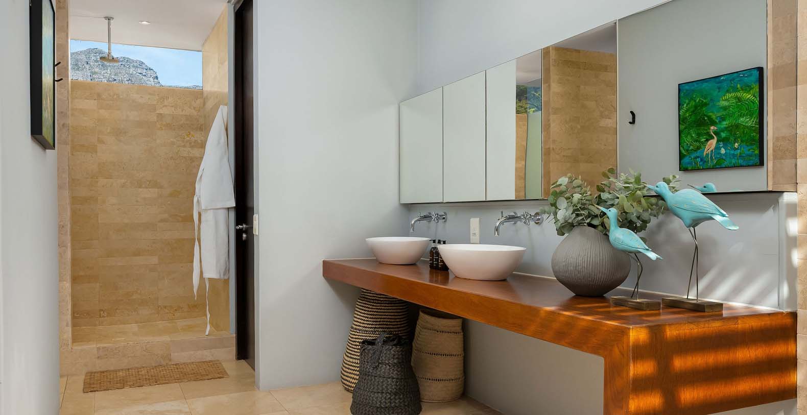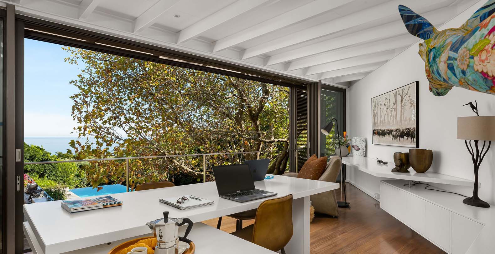 This villa is is an amazing 5 bedroom and 6 bathroom villa situated over 3 levels with access to the different level via stairs. The upper level has bedrooms 1-4 all en-suite, the middle level has all the living areas, a study, guest toilet, as well as the pool. Our lower level with outside stairs and separate entrance has bedroom 5, en-suite. In addition the study is in another building up a flight of stairs with full bathroom, for your convenience. Within the open living space there is a wonderful wide doors opening up to pool patio, mountain views. Nearby we have the exceptional dining room with a 10 seat capacity, if you have more there are extra chairs throughout the house. Our Kitchen and Scullery are state of the art after the very retro redesign you'll find everything you need and more. The owner wasted no time turning this into a perfect pleasure. We as well have what some call a Media or TV room with outside dining area and a large 75" television for your viewing movies or television shows with your friends and family, as well there is a guest bathroom. Our outside study has a large desk, sea and mountain views and an in-suite shower.