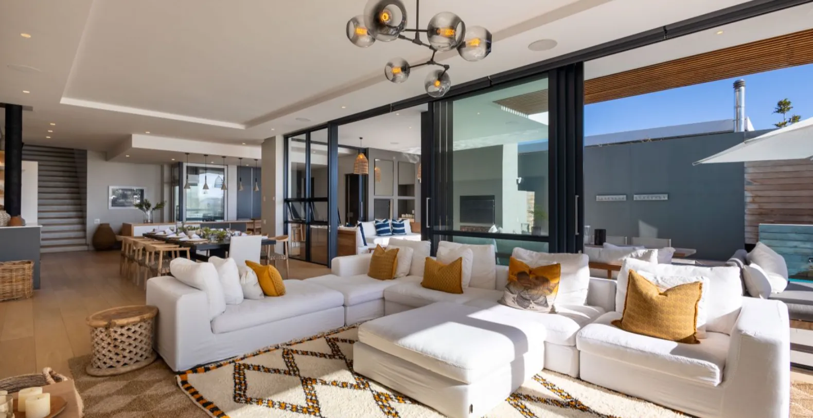 Designed for modern, effortless living, the villa unfolds across three levels connected by an elegant glass-made staircase and an internal elevator for convenience. Each space flows seamlessly into the next, with expansive glass doors framing panoramic views and creating a harmonious connection between the indoors and outdoors. The lower level hosts the heart of the home — an open-plan living area centered around a stylish kitchen with a large island, top-of-the-line appliances, a Thermomix, and dual wine fridges. A scullery with a dishwasher, washing machine, and additional fridge-freezer keeps the main kitchen pristine, while a ten-seater dining table and indoor fireplace make this area ideal for year-round entertaining. The adjoining lounge offers plush seating, surround sound, and floor-to-ceiling windows that open onto a covered terrace.