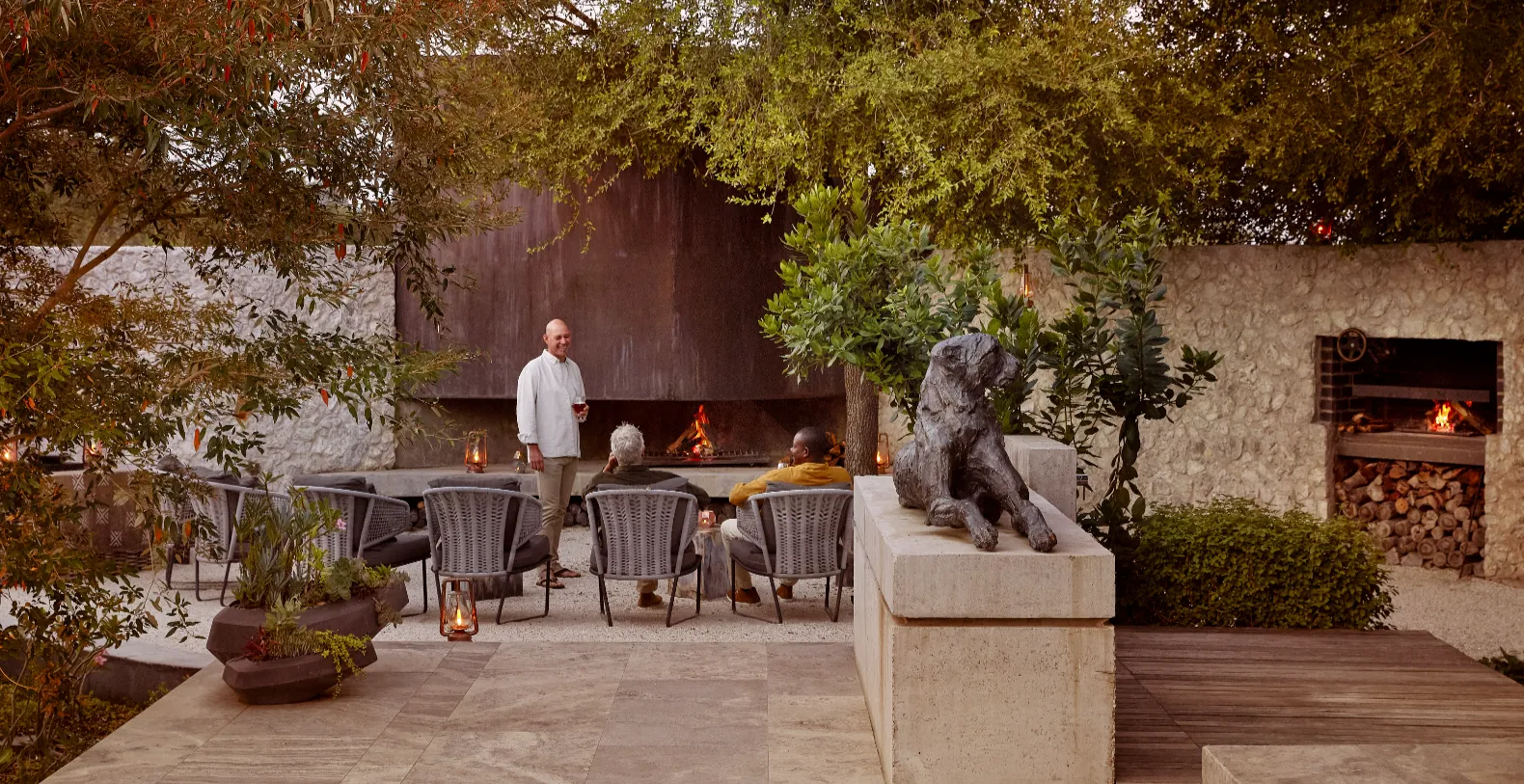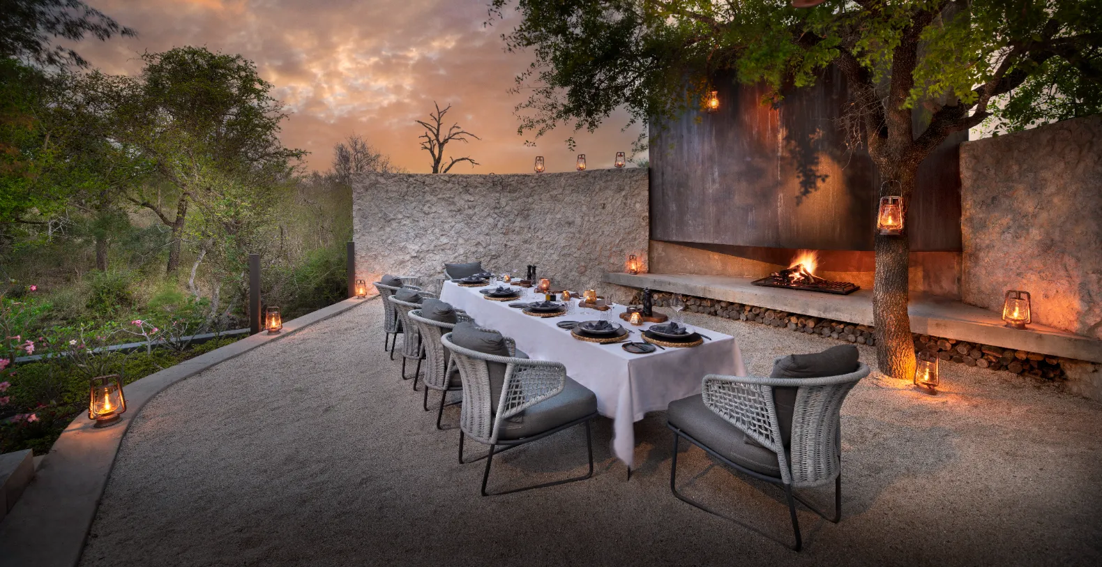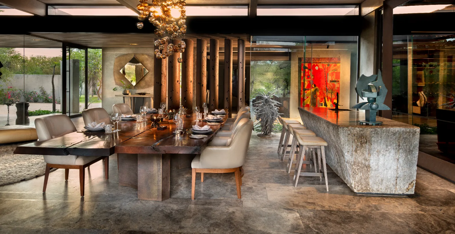 The villa is thoughtfully arranged into two distinct parts: a shared living pavilion and four private guest suites. The central shared space brings everyone together and features elegant formal and entertainment lounges, indoor dining areas, a fully equipped chef’s kitchen, a curated wine gallery, and seamless access to the swimming pool deck. Outdoors, guests can gather around the boma for atmospheric fireside dinners under the stars, surrounded by the sights and sounds of the bush.