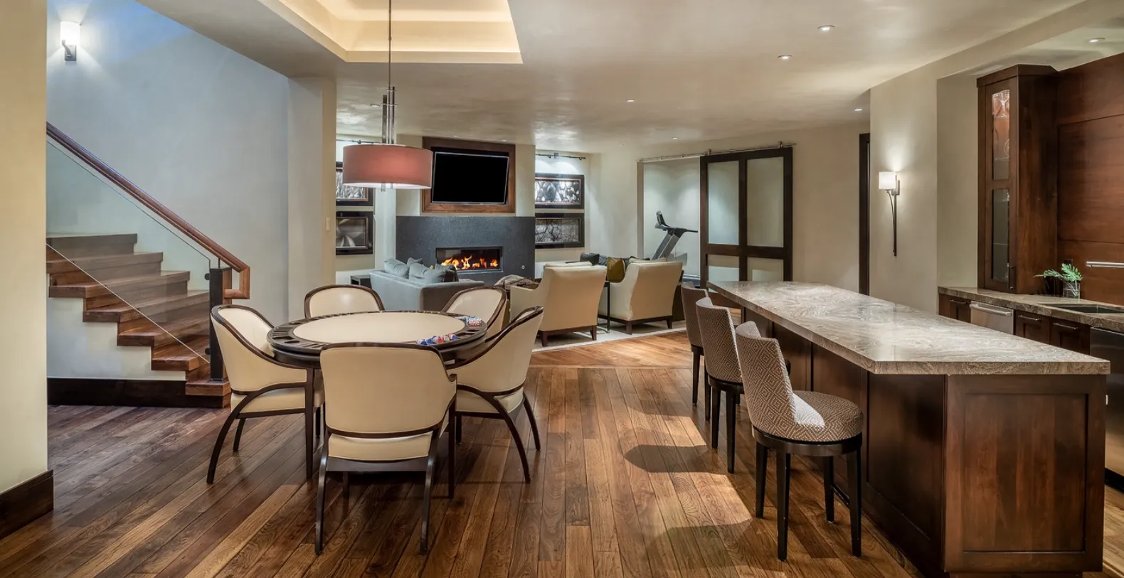 The main level hosts four generously sized guest suites, each with its own ensuite bathroom, creating a comfortable and private retreat for family and friends. A refined library adds a quieter space for relaxation balancing the home’s social areas. On the lower level, the chalet transforms into an entertainment haven, complete with a fully equipped gym, a plush media room, a stylish bar, and a bunk room ideal for younger guests or groups traveling together. The chalet accommodates up to 16 guests across its ensuite bedrooms, including four suites with king-size beds, one suite with a queen-size bed, and a bunk room featuring a twin-over-full bunk configuration, making it ideal for multi-generational families, ski groups, or luxury retreats with friends. Multiple fireplaces throughout the home enhance the cozy mountain atmosphere, while state-of-the-art audio and visual systems ensure seamless entertainment in every setting.