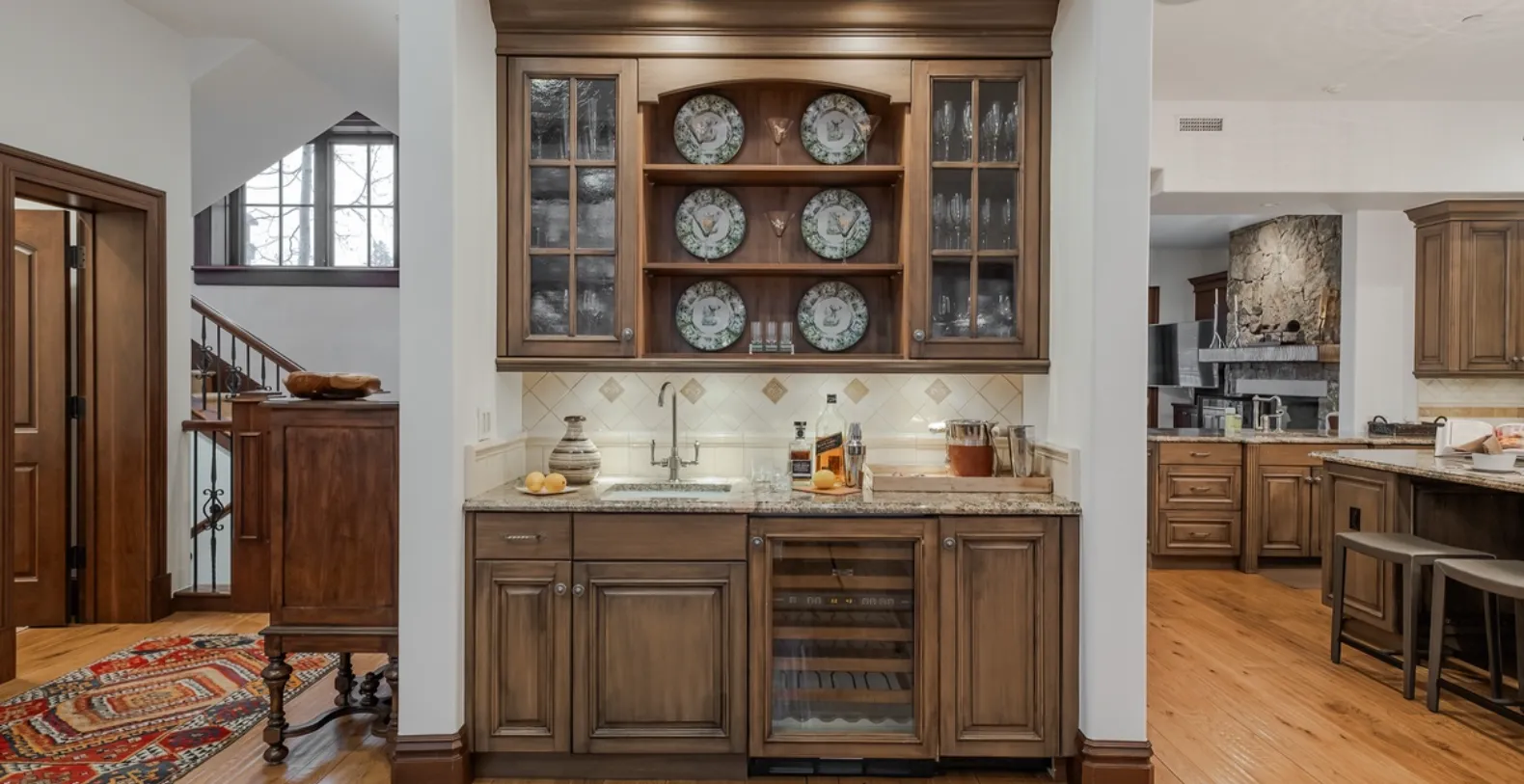 This spectacular multi-level home showcases refined mountain architecture with stone and wood accents, vaulted ceilings, rich hardwood floors, and a dramatic rock fireplace that anchors the main living space. The great room is designed for both relaxation and entertaining, with comfortable seating, large windows that frame forest and village views, and a warm, inviting atmosphere ideal for gathering after a day on the slopes or trails.