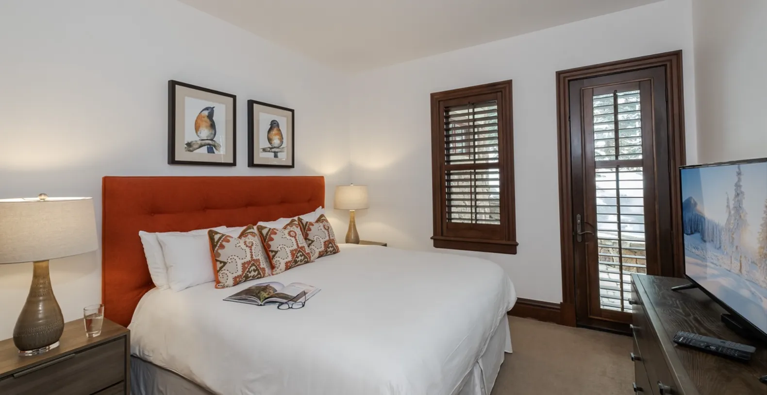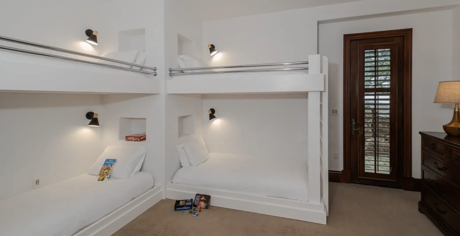 The lower level is designed with families and groups in mind and offers its own ski entry complete with boot dryers for added convenience. This level also features a laundry room, a billiards table, and a spacious entertainment area with ample seating. Direct access to the attached two-car garage makes arrivals and departures seamless. Three guest bedrooms are located on this level, including a king bedroom with an ensuite bathroom and walk-in shower, a twin bedroom with an ensuite bath and shower/tub combination, and a bunk room with two sets of twin bunk beds and an ensuite bathroom featuring a soaking tub and walk-in shower. The upper level is dedicated to the home’s two premier suites. Both the primary and junior primary suites feature king-size beds, flat-screen televisions, and luxurious ensuite bathrooms.