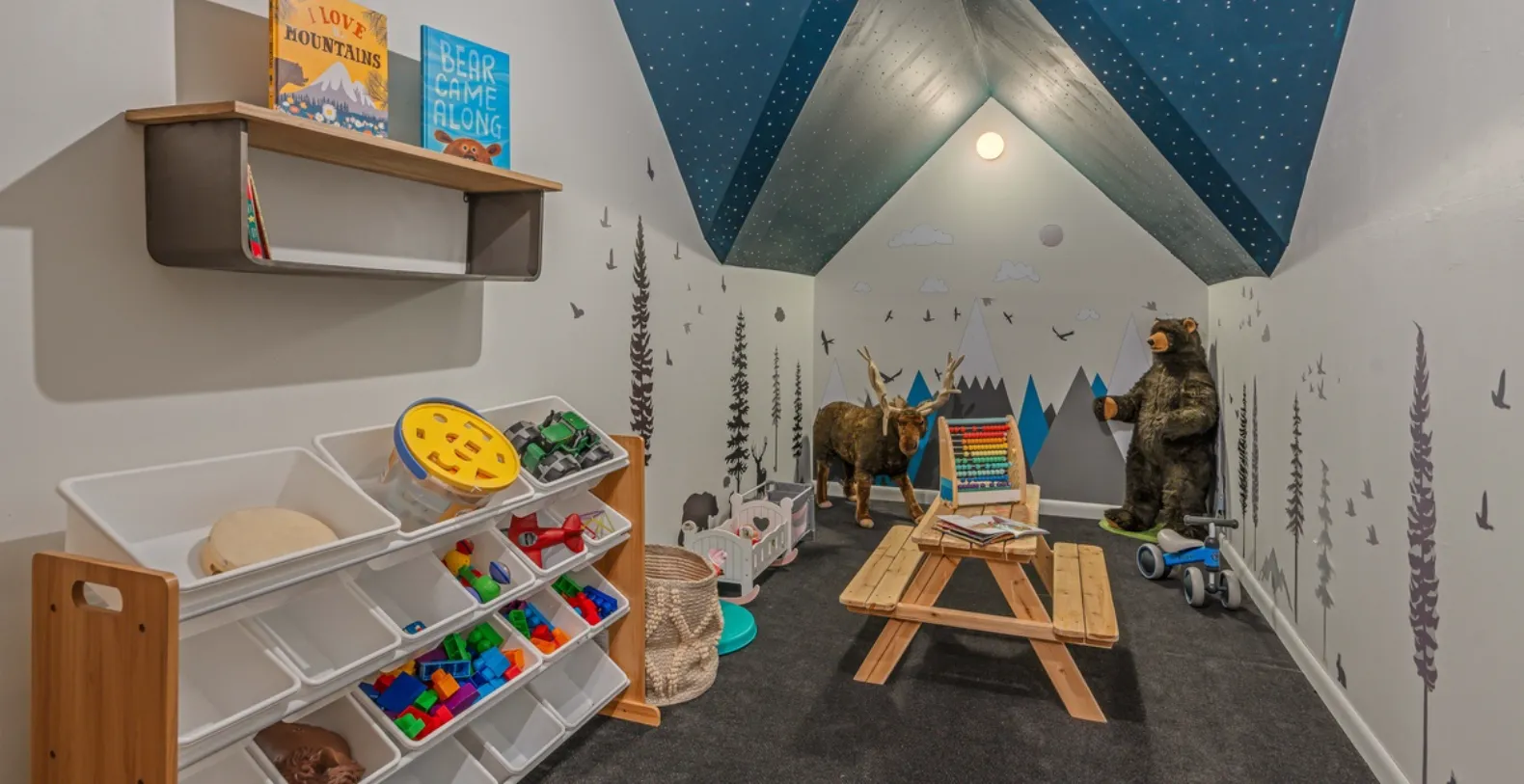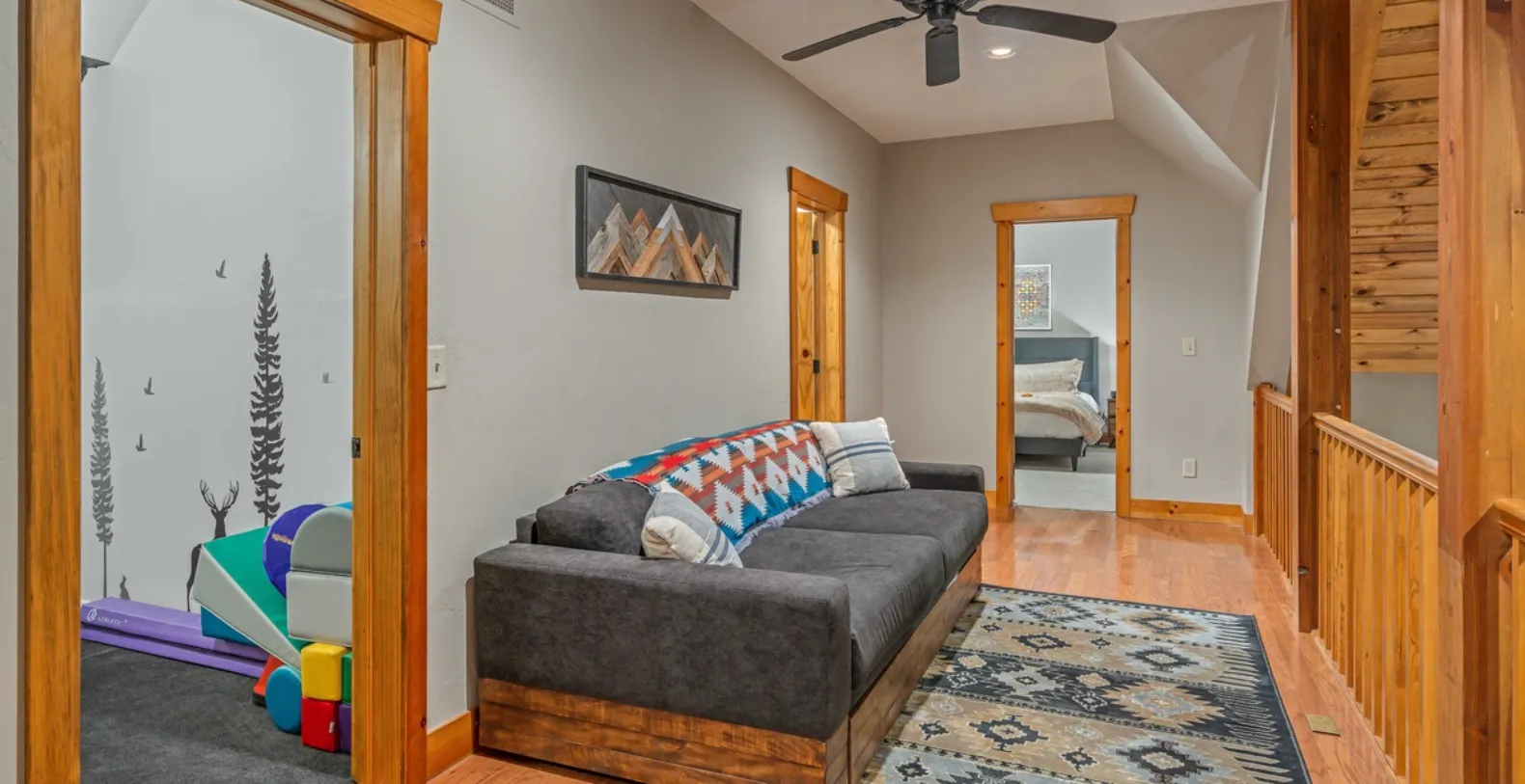 Starlit Pines Lodge offers a well-considered bedroom layout that provides both comfort and privacy. The serene primary suite is located on the main level and overlooks the surrounding forest, creating a peaceful retreat at the end of the day. This spacious bedroom features a king bed, large smart TV, and a luxurious ensuite bathroom with double vanity, deep soaking tub, and separate shower. Two additional king bedrooms are located on the upper level and two more bedrooms are located on the lower level of this vacation home. Families traveling with children will appreciate the home’s thoughtful lower-level accommodations. Here, a king bedroom with TV shares a bathroom with a bunk room featuring two twin-over-full bunk beds, making it ideal for kids and teens. Younger guests will be especially drawn to the charming playroom filled with games, toys, and books, creating a fun and safe environment just for them.