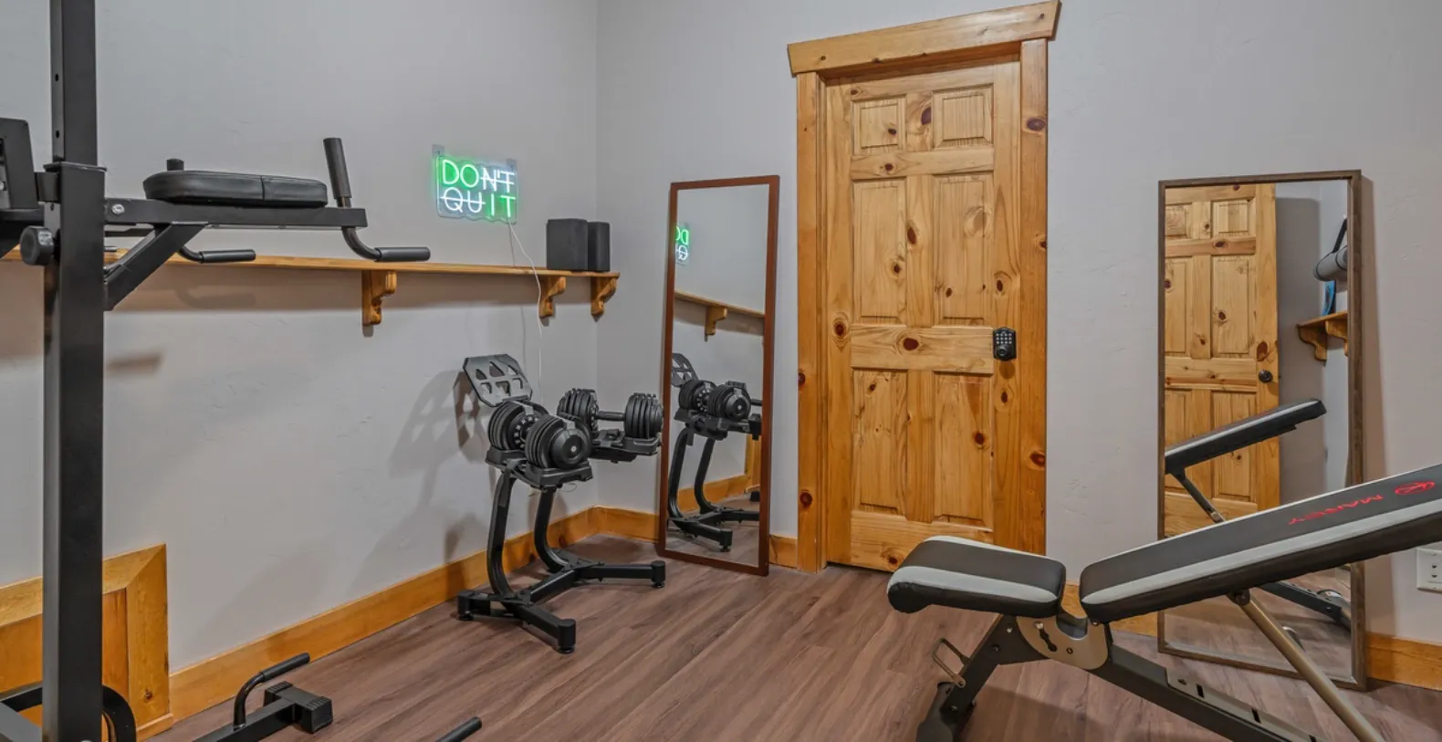 Beyond sleeping spaces, Starlit Pines Lodge truly shines in its amenities. The home includes a game room, fitness room, and steam room, offering options for entertainment, wellness, and relaxation regardless of the season. For guests who need to stay connected or work remotely, a private closed-door office with a large desk is located on the main level, providing a quiet and comfortable workspace.