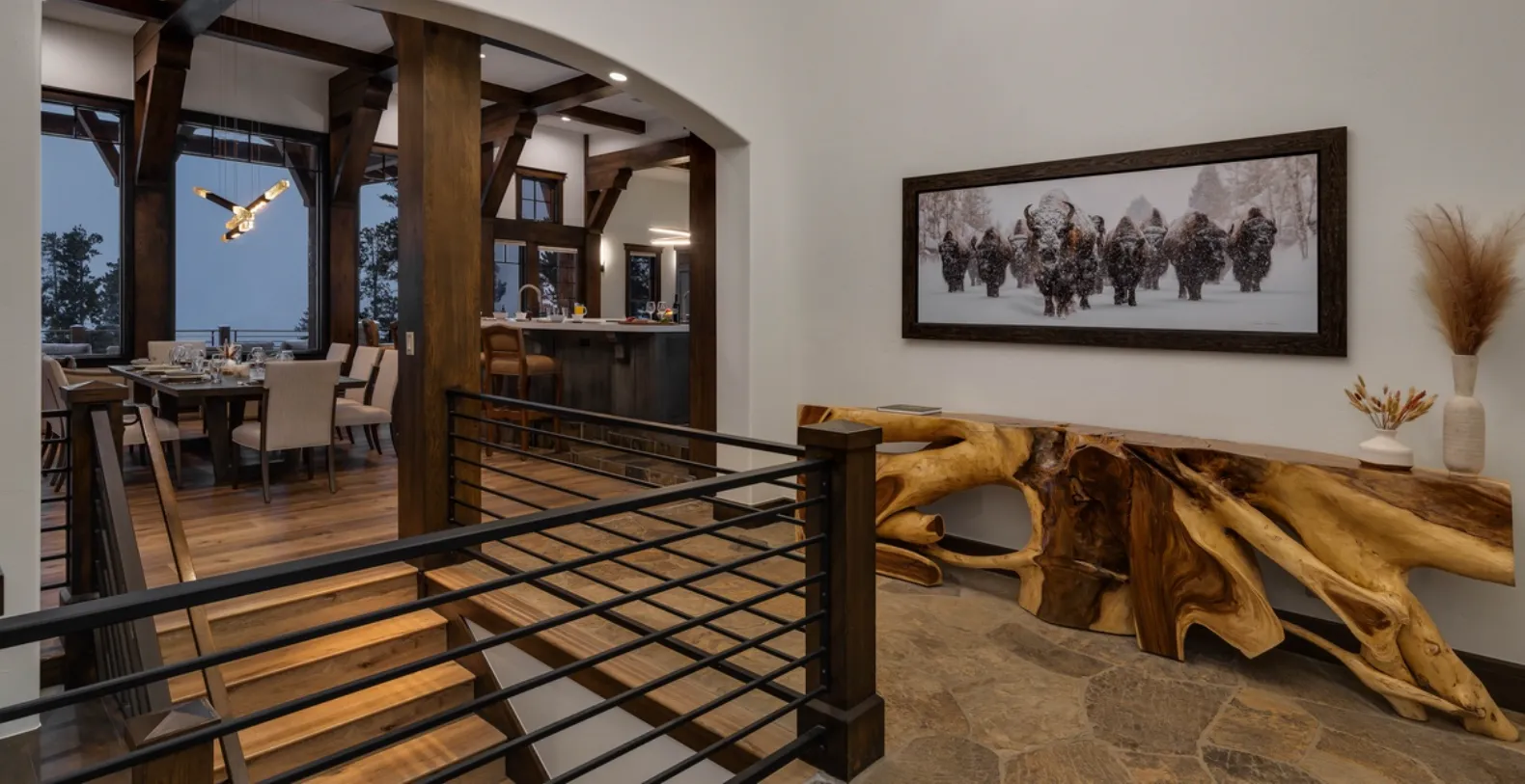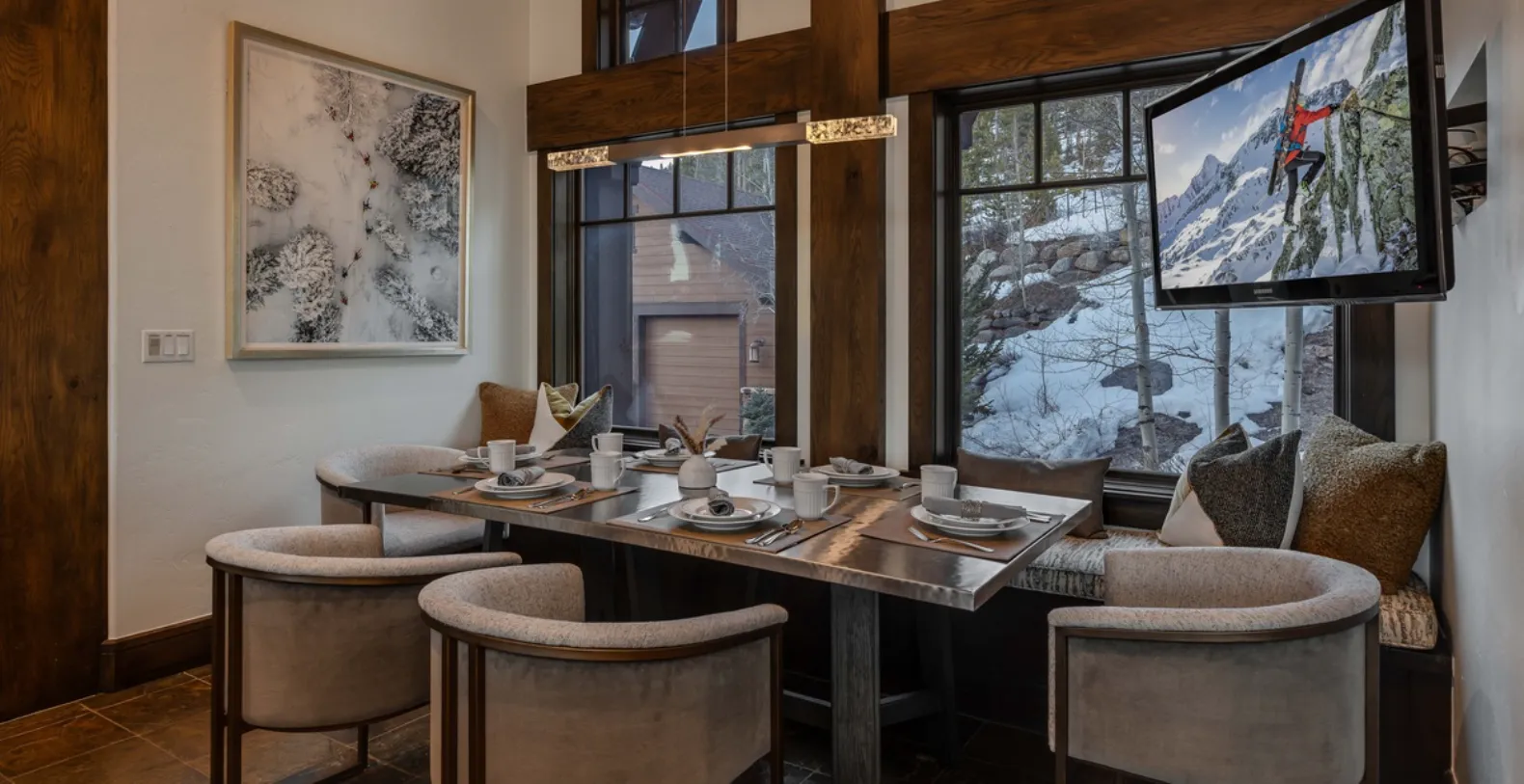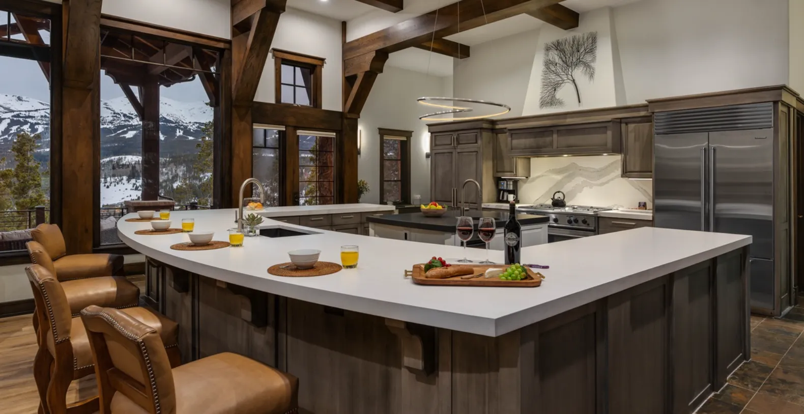 The main living level is a showpiece of modern mountain architecture, featuring soaring ceilings, dramatic exposed beams, wide-plank hardwood floors, and curated contemporary décor. Floor-to-ceiling windows frame breathtaking views and fill the space with natural light. The open-concept layout seamlessly connects the living area, dining space, and gourmet kitchen, making it ideal for entertaining and gathering after a day on the slopes or trails.