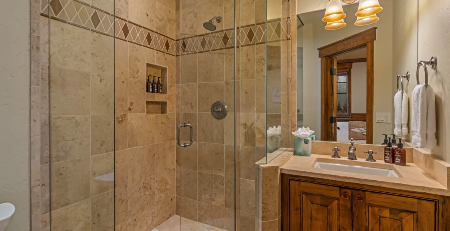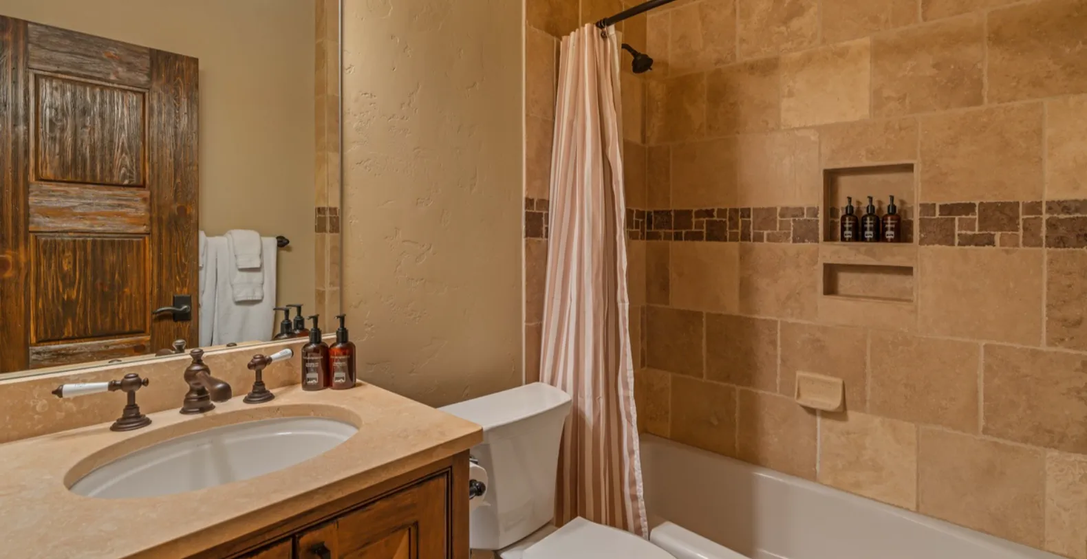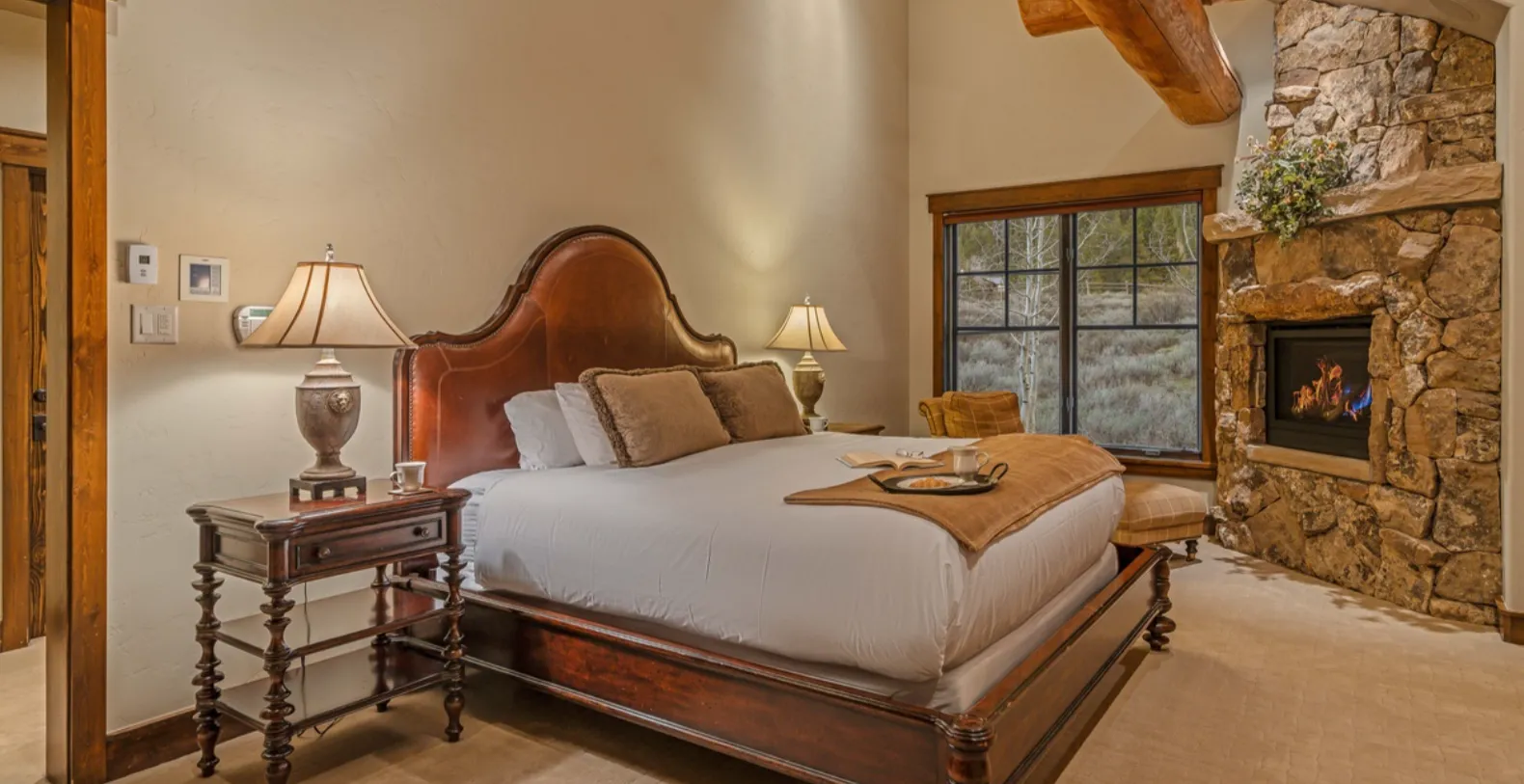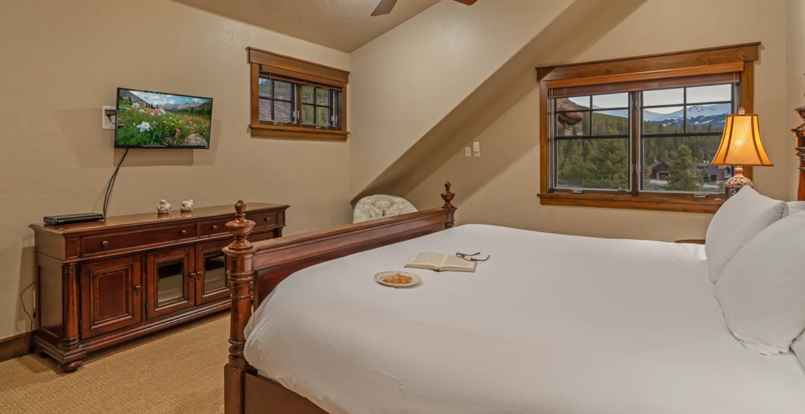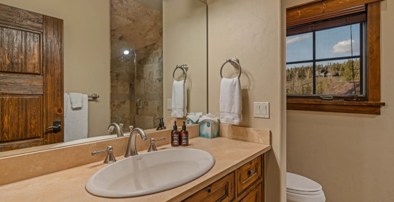 Monte Video offers four beautifully appointed bedrooms and four and a half bathrooms, ensuring comfort and privacy for all guests. The primary king suite is located on the main level and serves as a private sanctuary, complete with a king bed, TV, gas fireplace, private balcony, and a luxurious ensuite bathroom featuring dual vanities, a jetted soaking tub, and a separate walk-in waterfall shower. The upper level hosts an additional king suite alongside a loft that overlooks the great room. The loft includes a queen sleeper sofa and TV, making it an excellent setup for families traveling with children. Two additional guest bedrooms are located on the lower level, providing a quiet and private retreat for additional guests.
