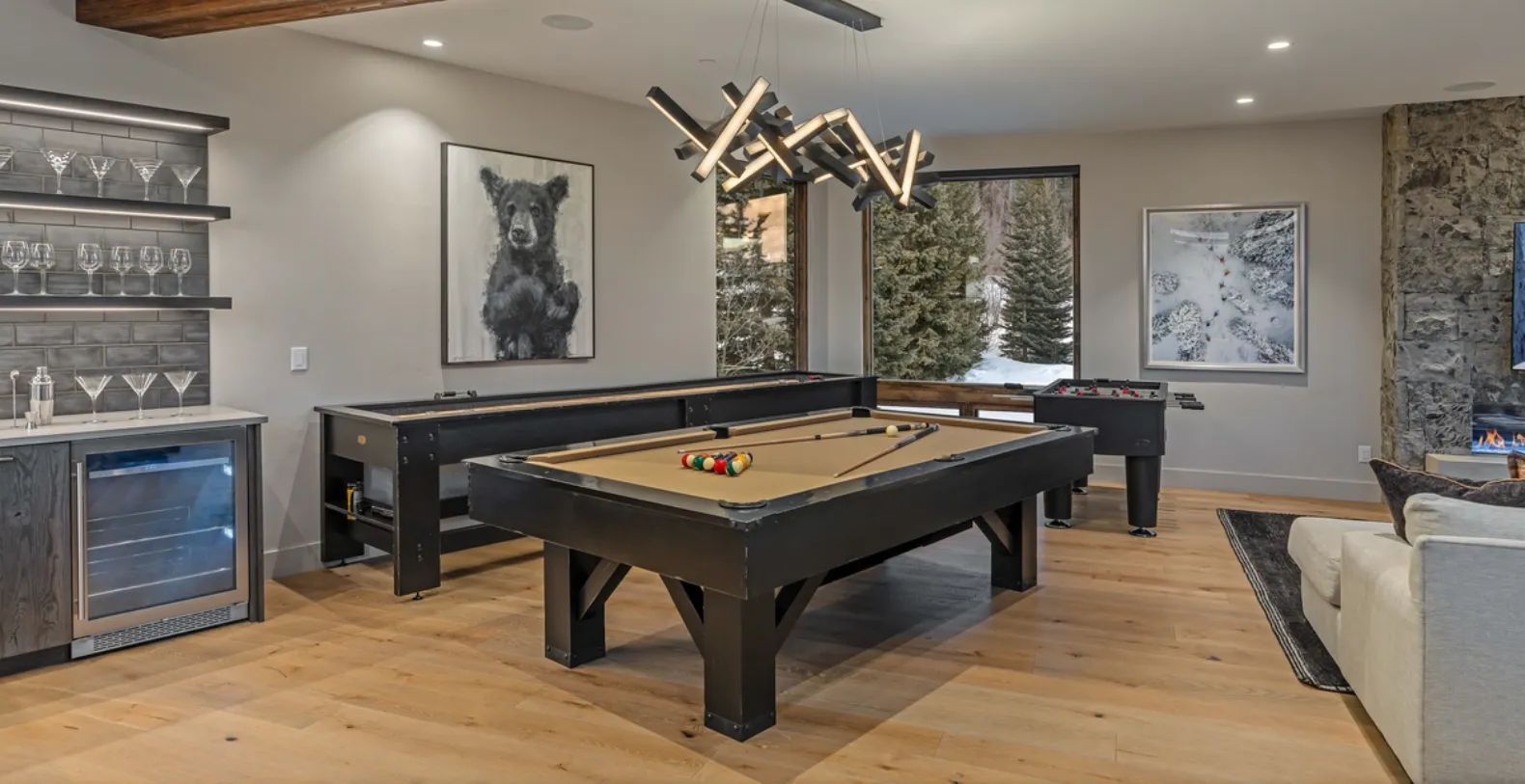 The upper level is designed for entertaining and taking in the jaw-dropping mountain views. A beautiful rec room features a large granite slab island with a built-in bar fridge and seating for 10+, a billiards table, A foosball, a wet bar, a gas fireplace, a large sectional sofa, and a TV.