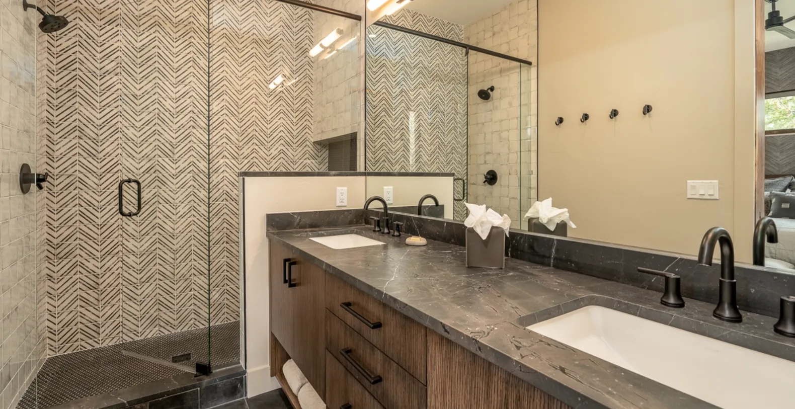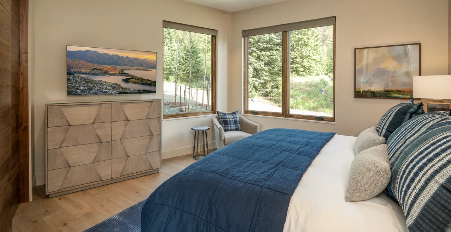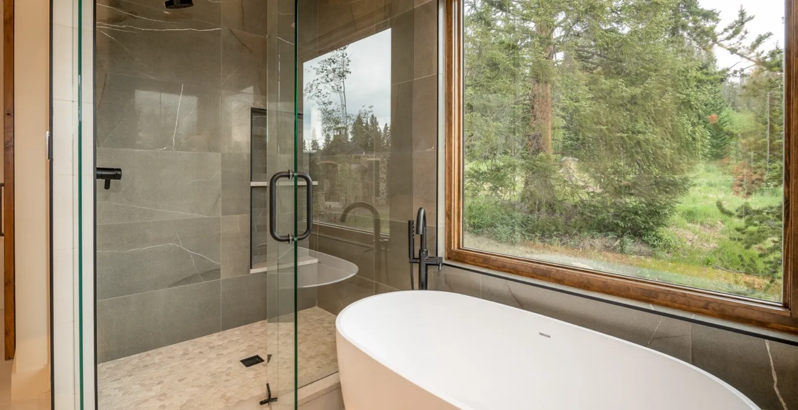 A few steps bring you to the uppermost level where the professionally-equipped kitchen, breakfast nook, great room, and dining area come together under vaulted ceilings. The common areas of The Bear’s Den are designed as an inviting alpine retreat and at the heart of the home, expansive living spaces with dramatic floor-to-ceiling windows frame the surrounding pine forest and snow-dusted peaks, flooding the interiors with natural light throughout the day. The chef’s kitchen is both stylish and highly functional, featuring an oversized marble island with ample seating, professional-grade stainless steel appliances, and custom wood cabinetry. Adjacent to the kitchen, a spacious dining area comfortably accommodates group meals, with large windows and direct access to outdoor terraces. Expansive views of the Breckenridge Ski Resort and the National Forest can be enjoyed through the wrap-around floor-to-ceiling windows. The centerpiece of the space is the oversized 3-sided glass fireplace. Two decks, each featuring a private hot tub and a gas fire pit are accessible through the uppermost level – enjoy stargazing while soaking in the hot tub after the sun sets on a beautiful day in Breckenridge.