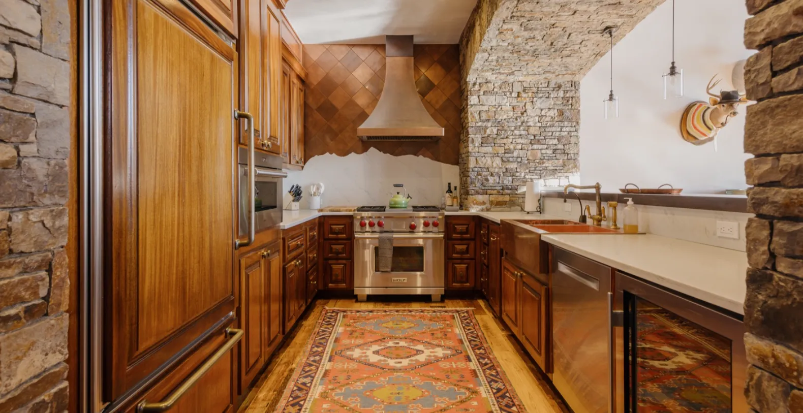 The grand open-concept living area welcomes you with soaring vaulted ceilings, exposed wooden beams, and expansive floor-to-ceiling windows that frame breathtaking mountain panoramas. The great room’s impressive stone fireplace anchors the space, creating an inviting gathering spot where you can relax after a day on the slopes. Designed for culinary inspiration, the gourmet kitchen features top-of-the-line appliances, custom cabinetry, and a breakfast bar perfect for morning coffee or après-ski cocktails. The adjoining dining area, framed by natural stone archways and warm lighting, provides an elegant setting for shared meals with family and friends.