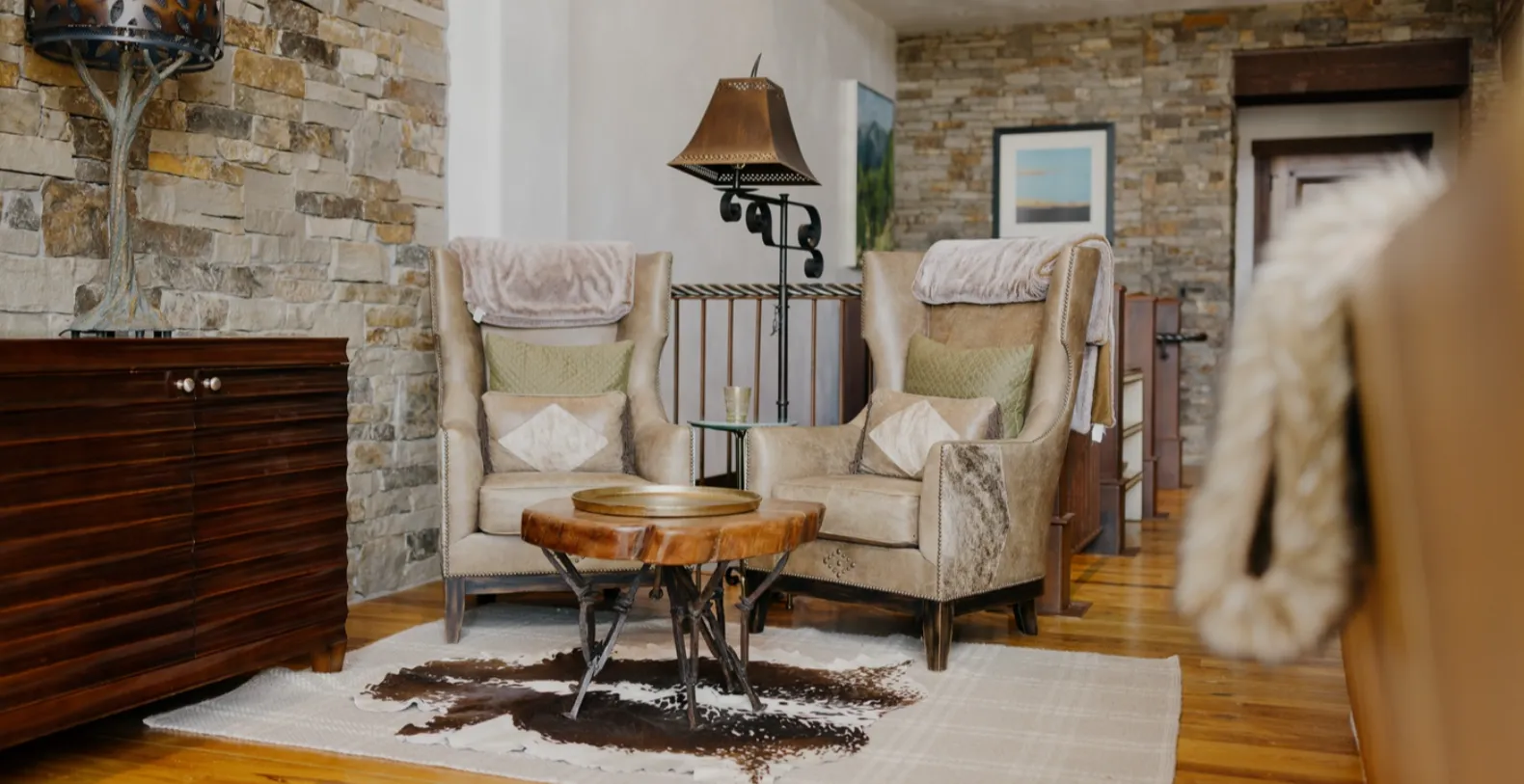 Each of the three bedrooms is thoughtfully designed for rest and relaxation. Two bedrooms offer sumptuous king beds and cozy fireplaces, while the third includes two queen beds—ideal for families or groups. Soft textures, mountain-chic décor, and large windows allow nature to flow seamlessly indoors.