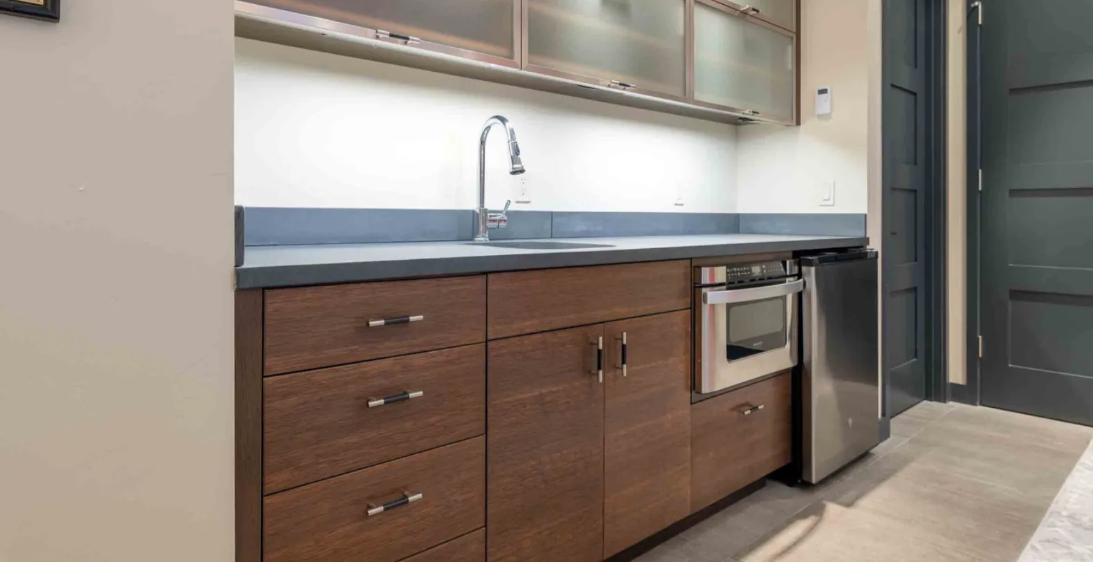 The chalet offers five well-appointed bedrooms, providing plenty of space and flexibility for different group types. Four of the bedrooms feature king-size beds, while the fifth is an overbuilt bunk room that works especially well for children or younger guests. The primary suite is thoughtfully designed as a private retreat, complete with a king bed, TV, couch, kitchenette, and an ensuite bathroom with a shower and tub combination, offering added comfort and independence within the home.