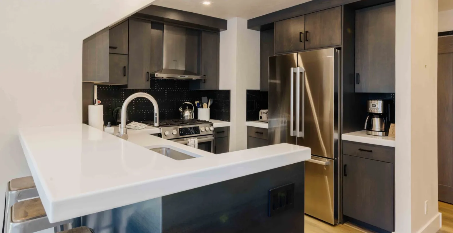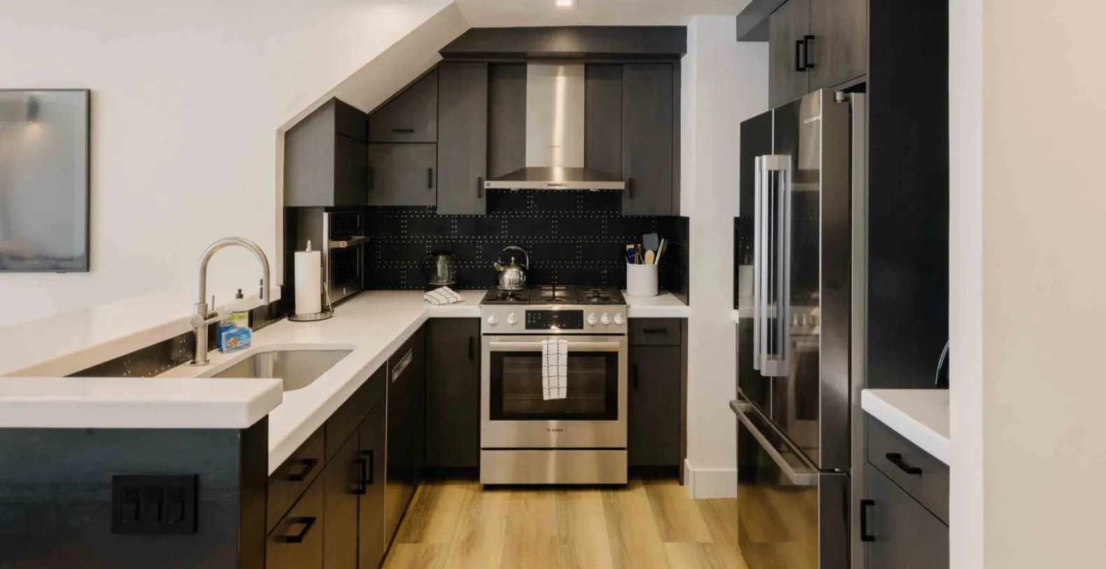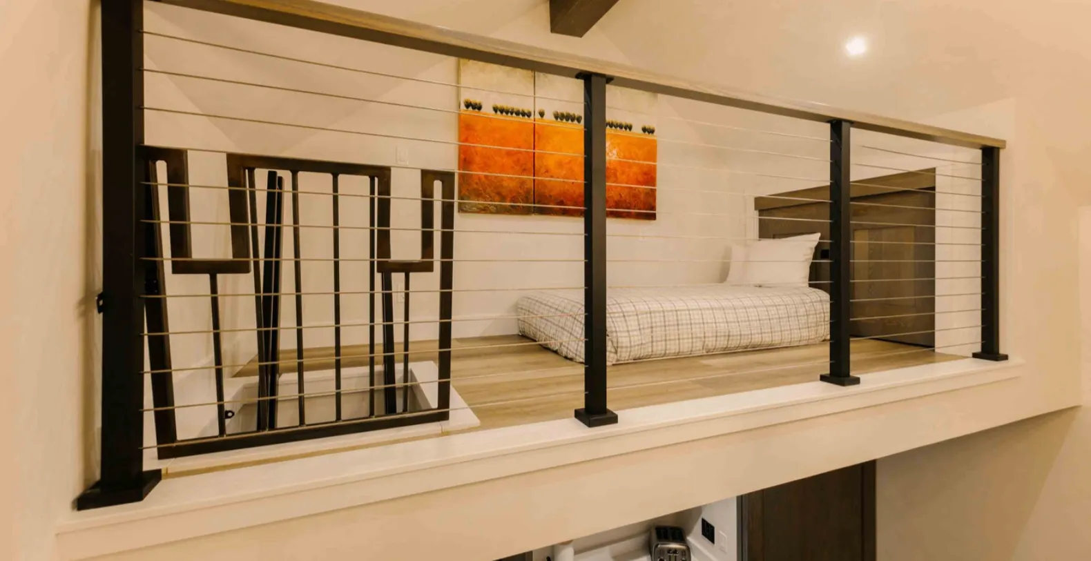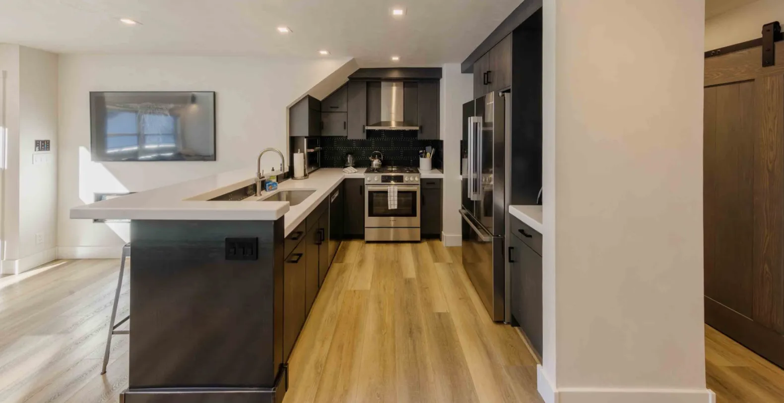 The living room flows seamlessly into the contemporary kitchen, finished with clean white countertops, dark cabinetry, and high-quality stainless-steel appliances. The layout makes it effortless for everyone to gather, cook together, or share meals around the adjacent dining area. Just beyond, a lofted sitting room and bedroom space lead you to the private patio, where calming river-facing views create the perfect backdrop for unwinding in every season.