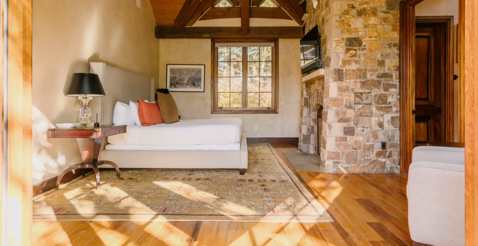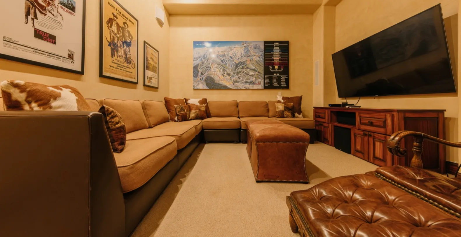 Designed with soaring vaulted ceilings, exposed wooden rafters, and an abundance of natural light, this luxury 3-bedroom residence delivers a welcoming sense of warmth from the moment you arrive. The great room serves as the heart of the home, where a grand stone fireplace adds an extra touch of elegance. Plush seating invites relaxed evenings by the fire, while the open layout creates an effortless flow between the living, dining, and kitchen areas. The gourmet kitchen blends rich wood cabinetry with stonework and premium appliances, making it ideal for everything from quick breakfasts to chef-prepared dinners. A second living area on the lower level offers a cozy retreat of its own, complete with a large sectional, oversized TV, and ski-inspired artwork—perfect for movie nights or children’s downtime.