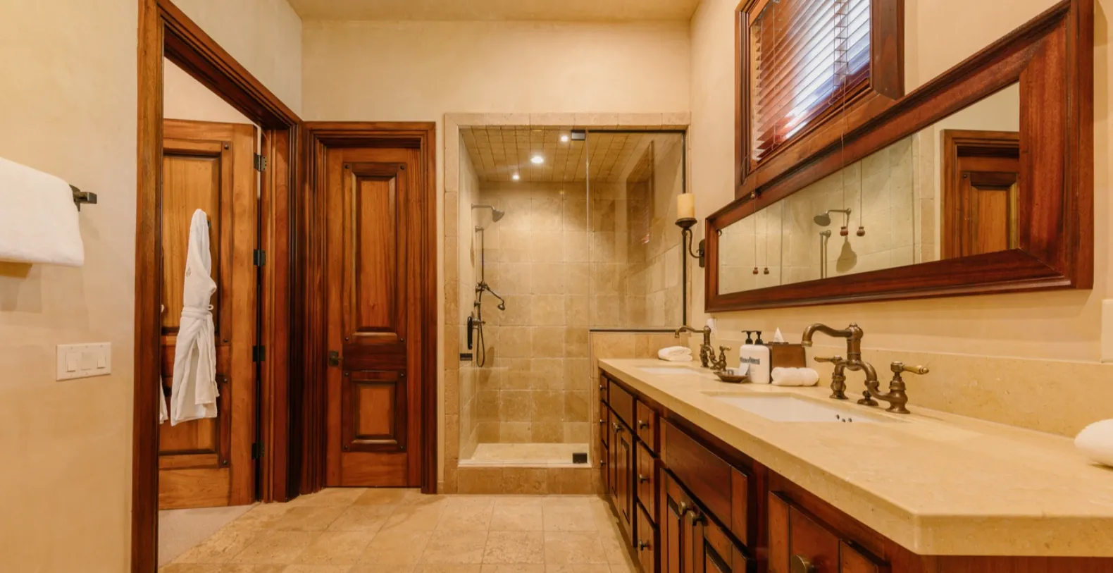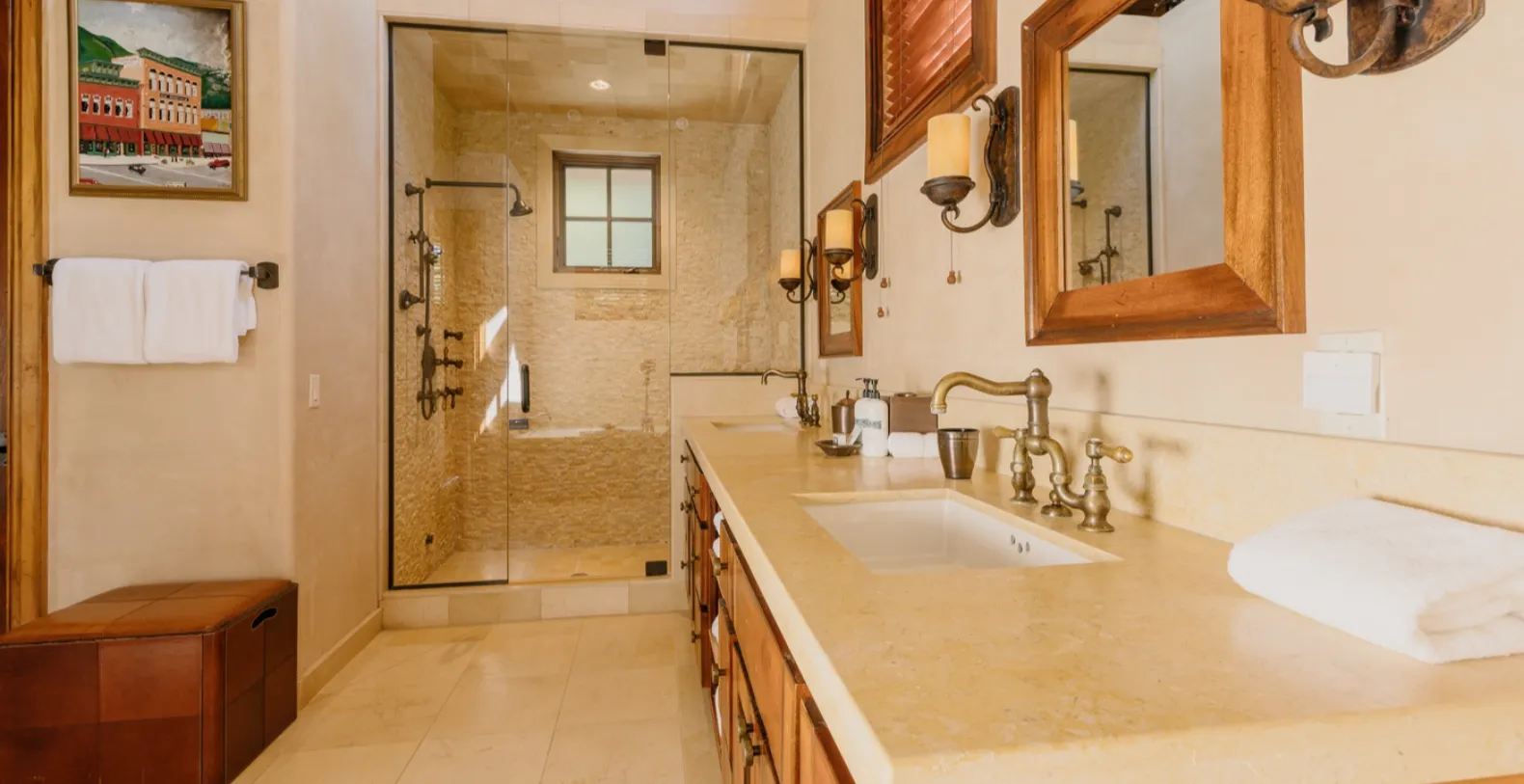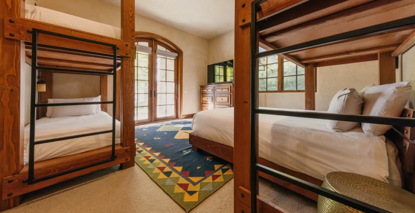 Four Bears Hideaway features three well-appointed bedrooms, each offering its own peaceful ambiance. Two master suites include plush king beds, high ceilings, and ensuite bathrooms designed with refined mountain style—double vanities, stone detailing, and spacious walk-in showers. The third bedroom is a welcoming bunk room with two sets of custom-built bunks, comfortable bedding, and ample space for families or groups traveling together.