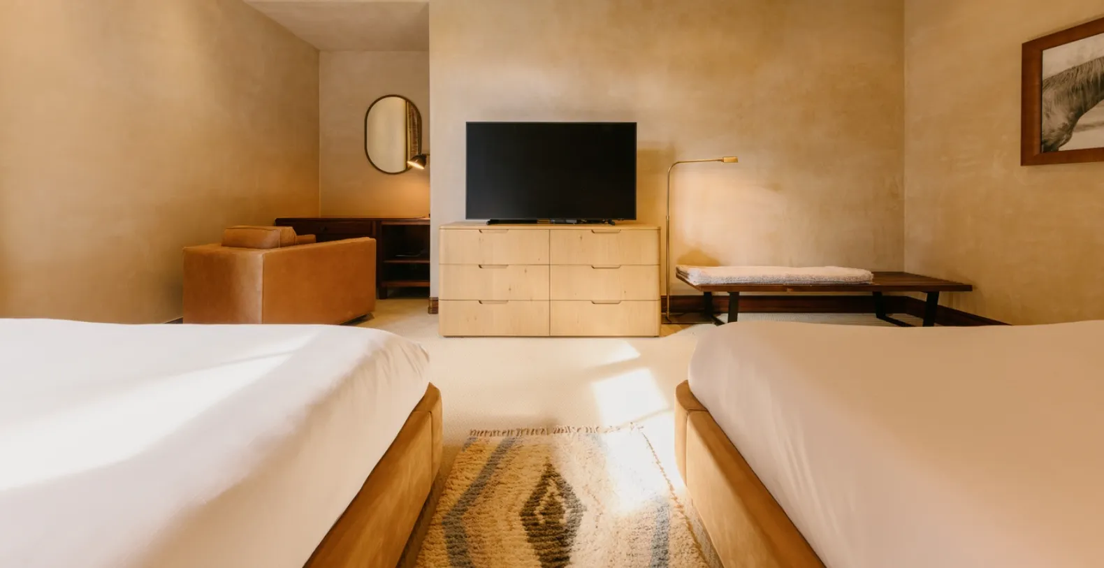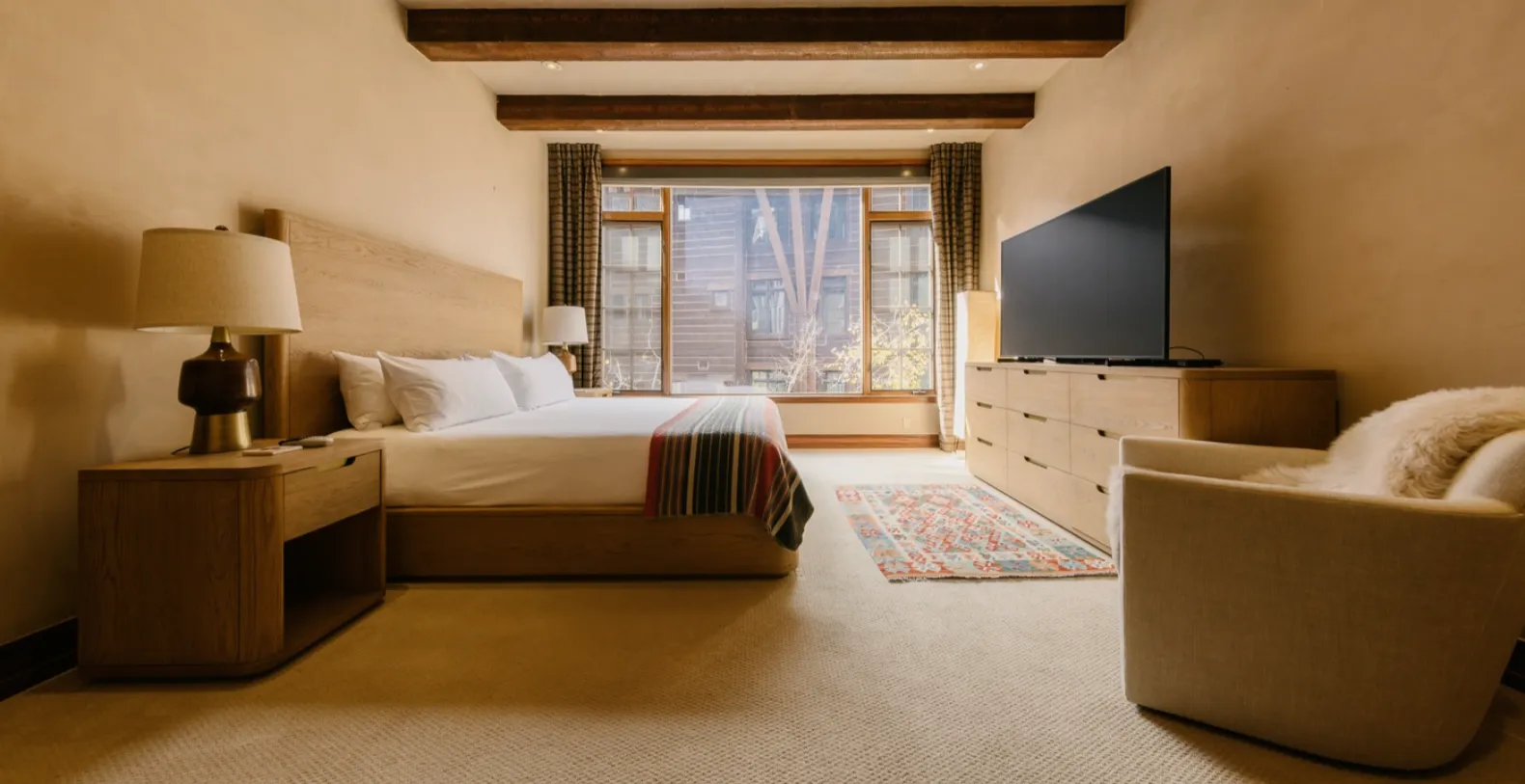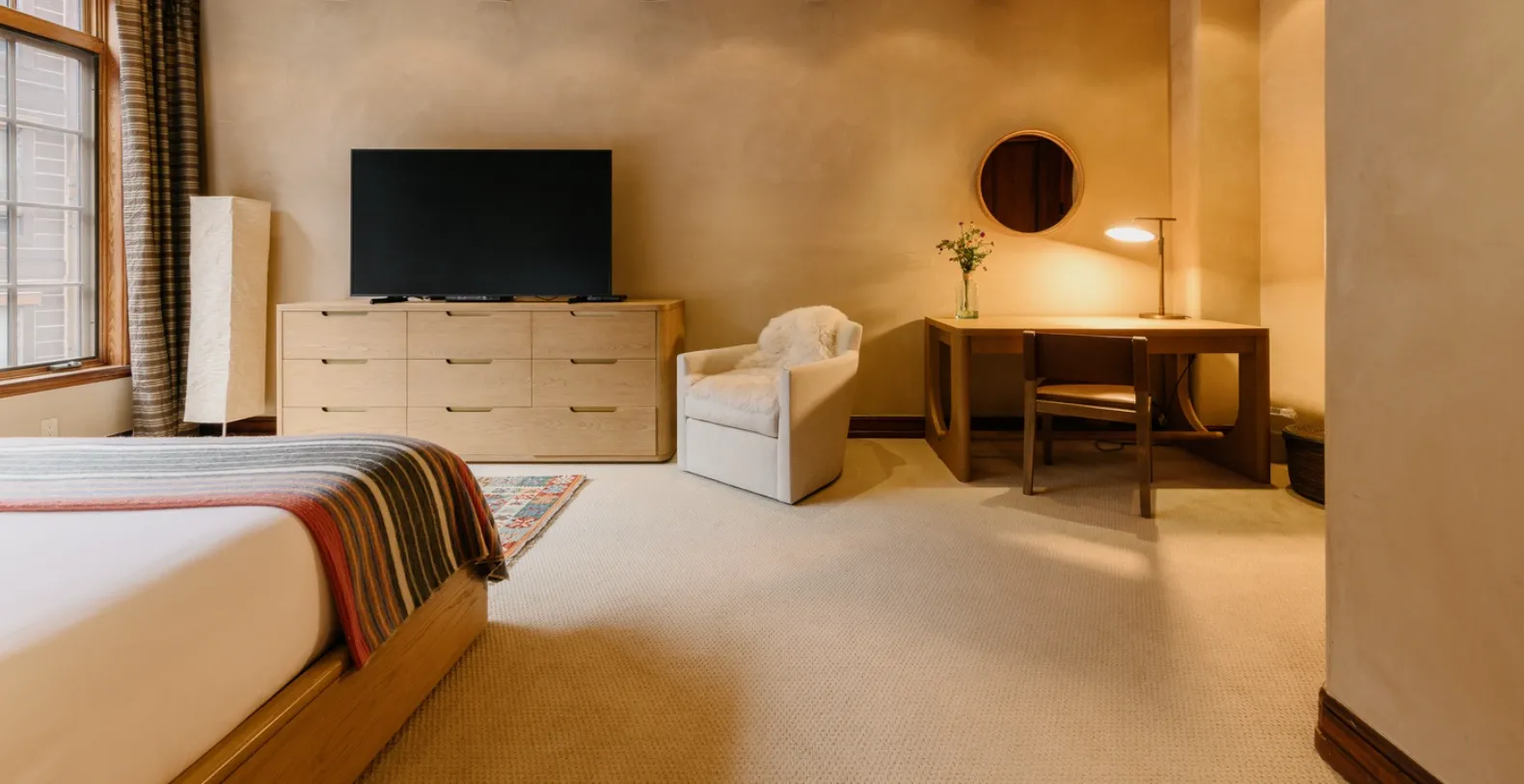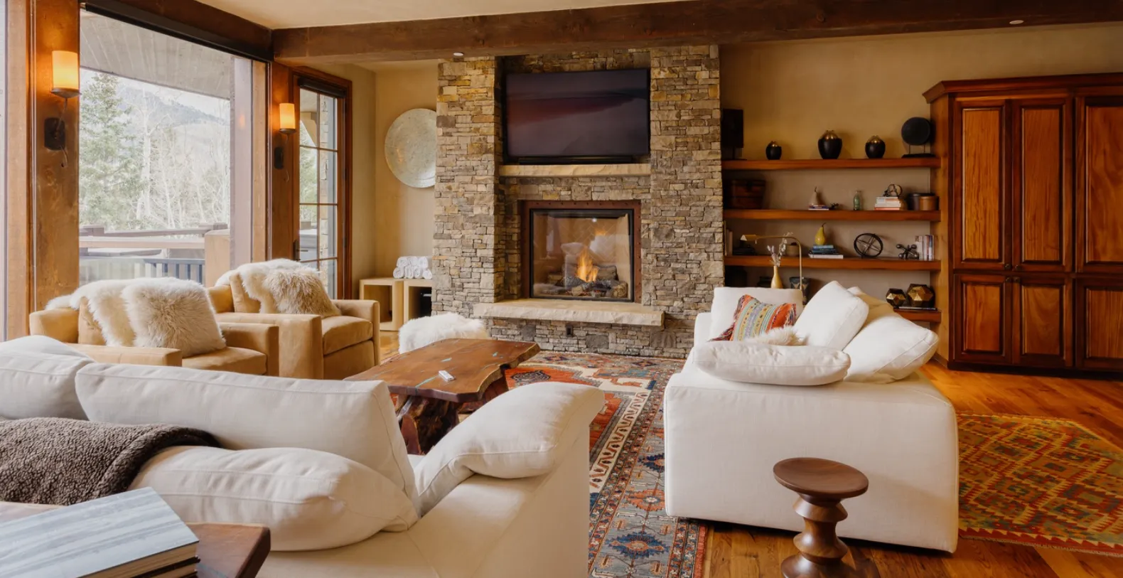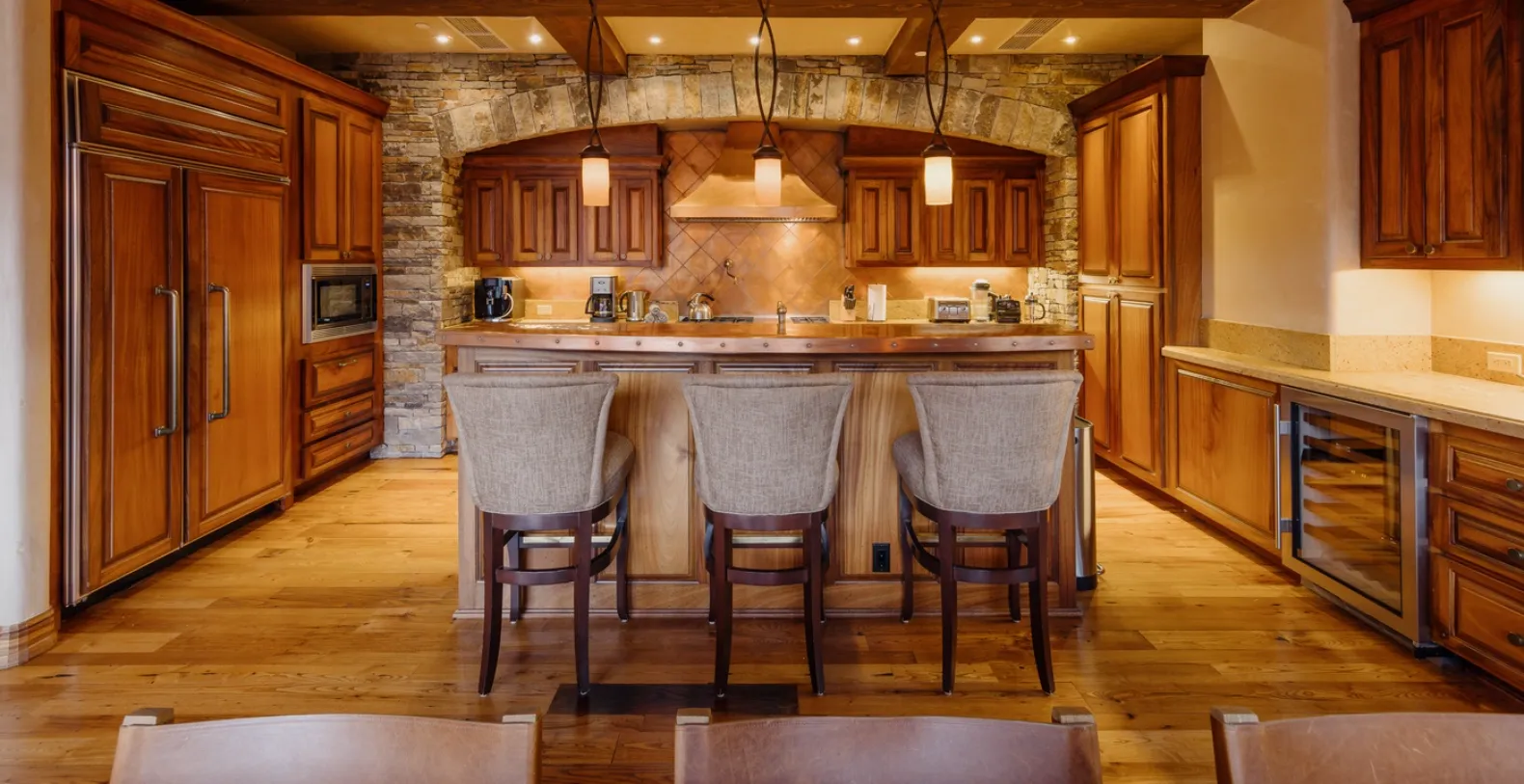 The residence offers three beautifully appointed bedrooms. Two primary suites feature king-size beds, spa-inspired ensuite bathrooms, luxurious linens, and fireplaces or generous seating nooks that create a serene retreat after adventurous days. The third bedroom, perfect for families or friends, includes two queen beds and a quiet workspace for those who may need to stay connected during their stay.