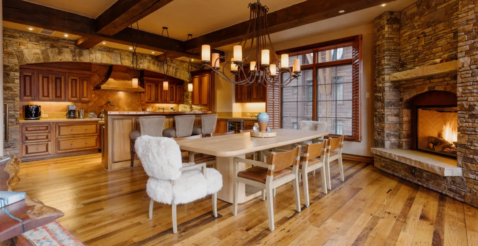 Mount Wilson Horizons boasts an open-concept great room centered around a dramatic stone hearth. Sunlight pours through floor-to-ceiling windows, illuminating comfortable seating areas and drawing the eye toward panoramic views of Wilson Peak and the rolling greens of the Telluride Golf Course. Adjacent to the living space, the dining area and gourmet kitchen form a cozy gathering hub, complete with a breakfast nook warmed by its own fireplace, rich wood cabinetry, and premium appliances ideal for entertaining or relaxed mountain meals.