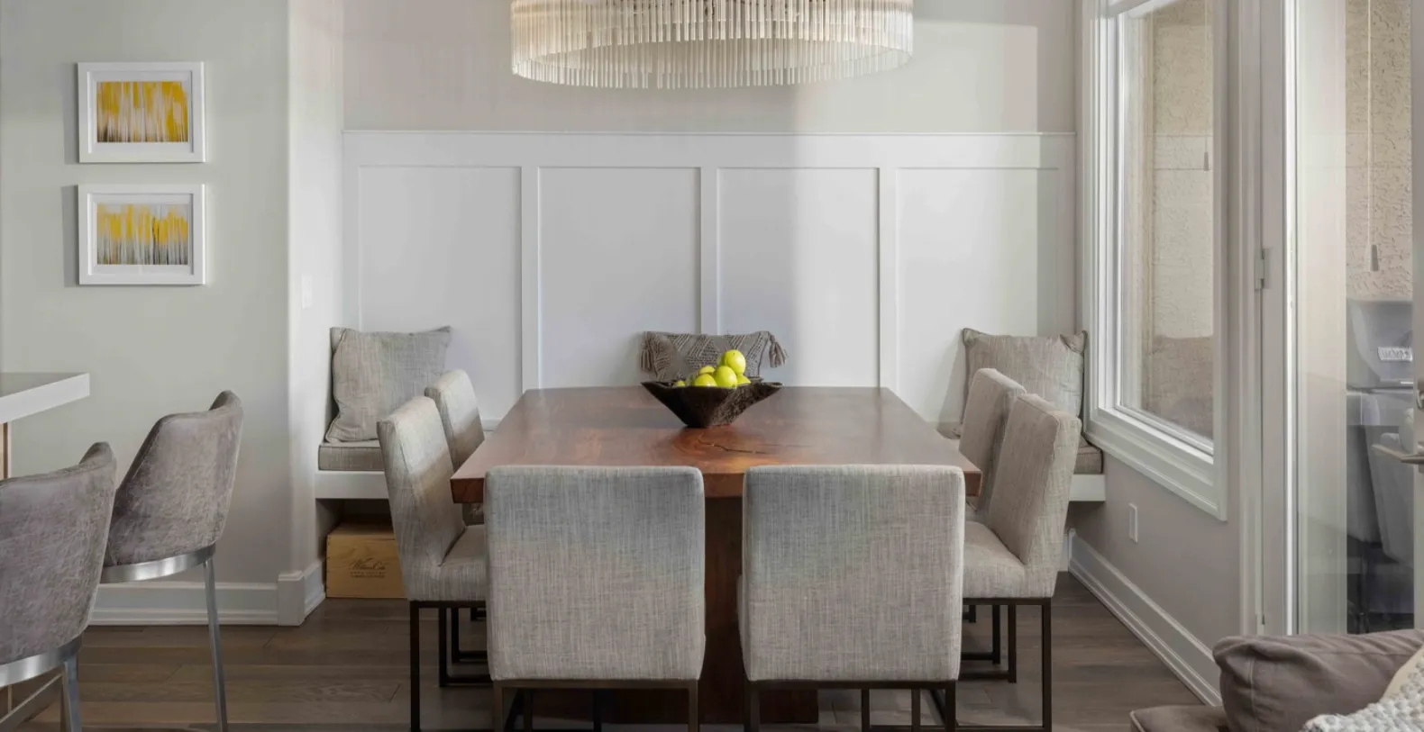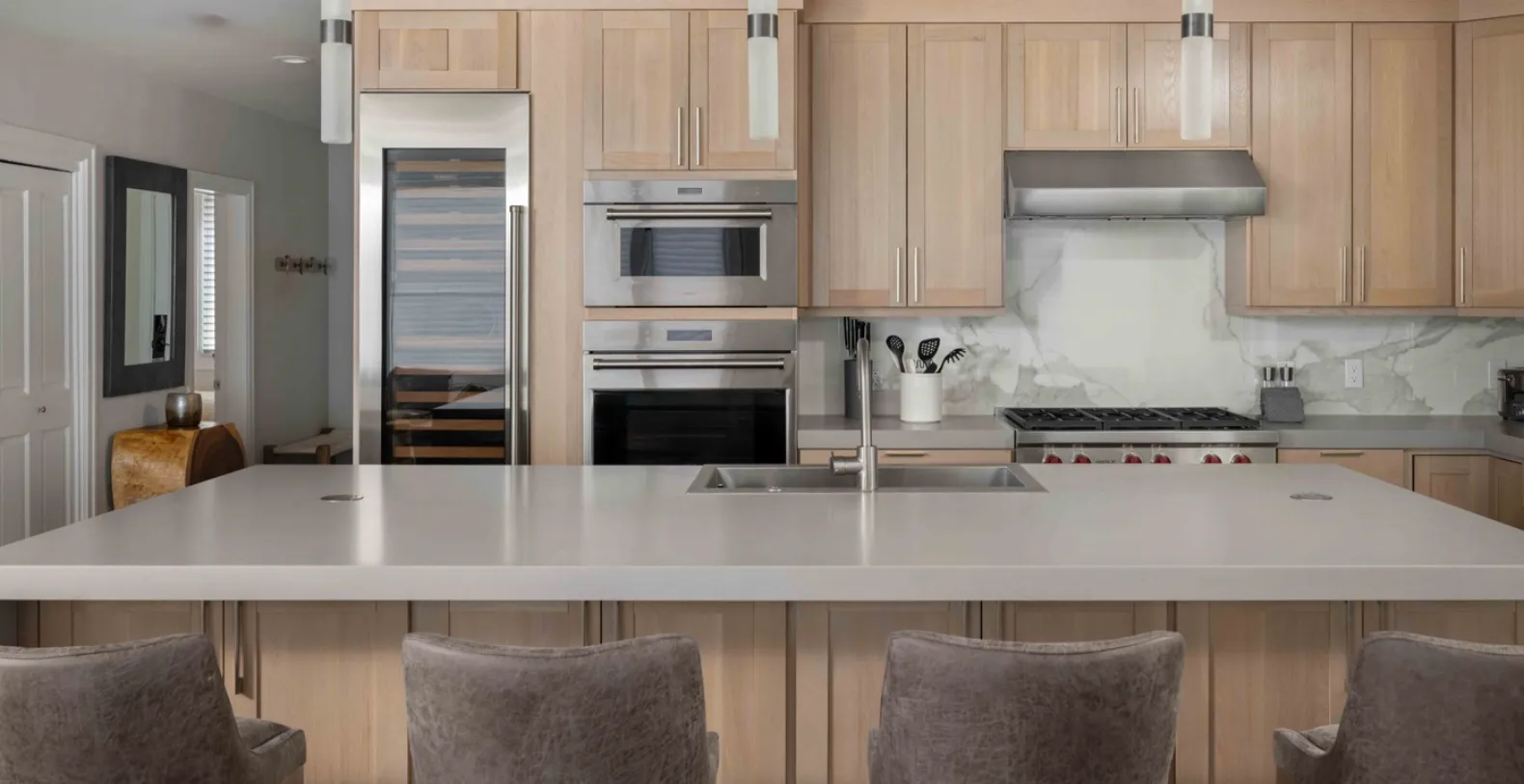 To the left of the living area, the kitchen and dining spaces flow together effortlessly. The chef’s kitchen features stainless steel appliances, a Wolf range, a spacious island with seating for four, and a dedicated wine cooler. The dining area pairs a solid wood table with both chair and bench seating, creating a relaxed yet refined atmosphere beneath a contemporary glass chandelier. From here, step onto the balcony to grill dinner, sip morning coffee, or take in the alpenglow as the sunrise illuminates the peaks.