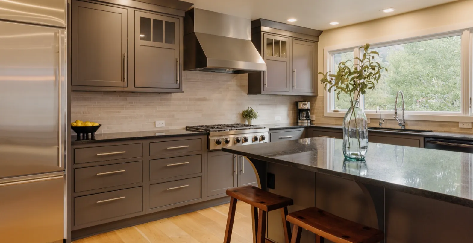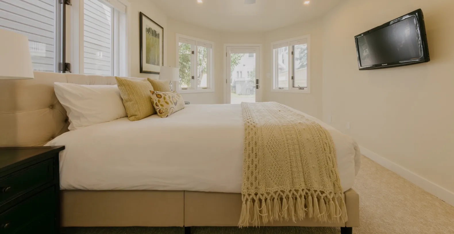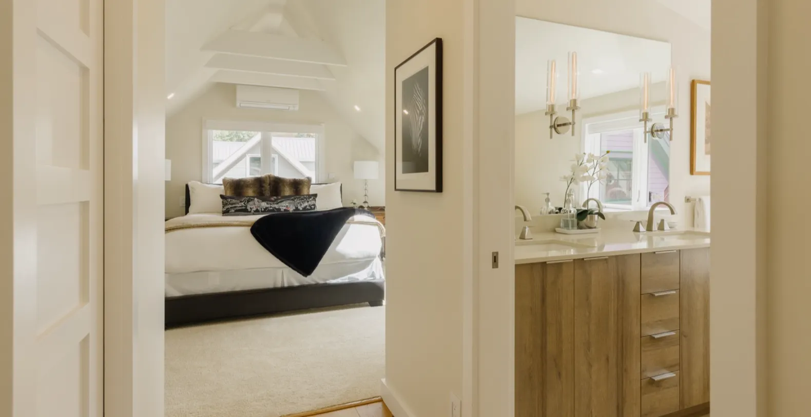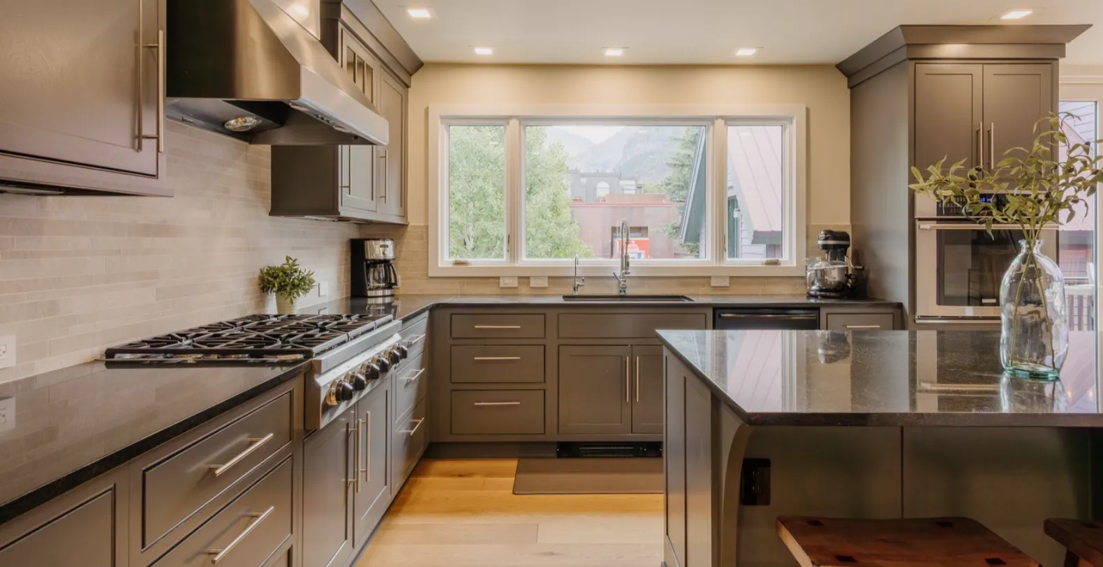 Spread across s 2,414 sq. ft., Smugglers Hideaway feels bright, airy, and inviting the moment you step inside. Vaulted ceilings and oversized windows flood the open-concept living area with natural light, while warm wood tones, contemporary finishes, and plush furnishings create a relaxed ambience. The main living room is perfect for unwinding after exploring town, with comfortable seating, scenic views, and direct access to one of the home’s furnished outdoor terraces.