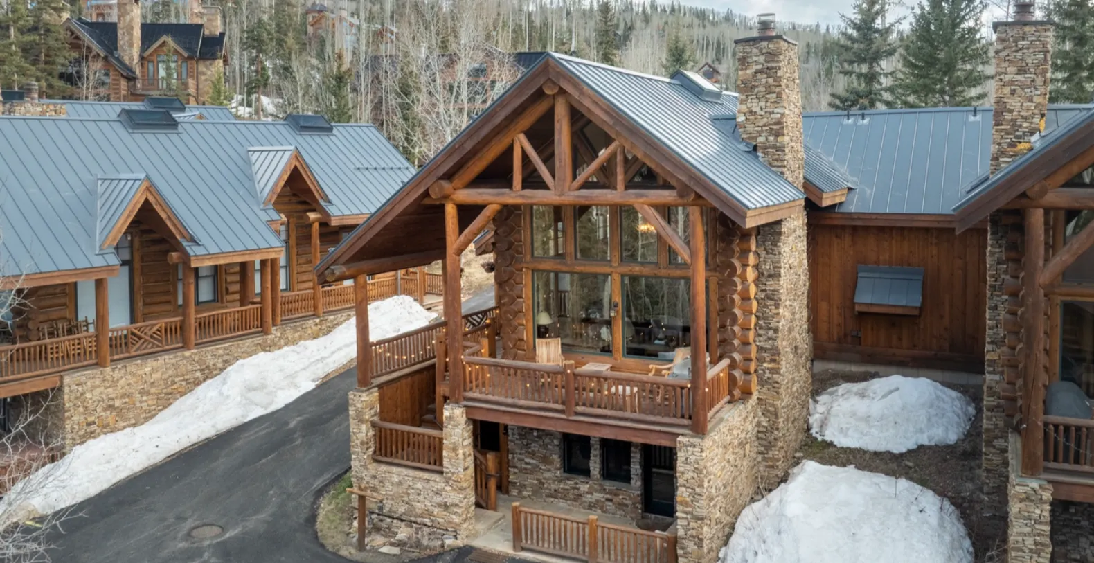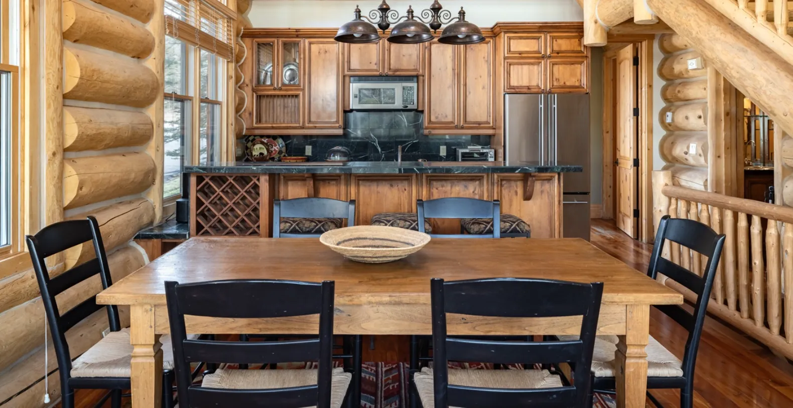 Crafted with oversized logs, hand-laid stone, and expansive floor-to-ceiling windows, the home balances rustic mountain character with the comfort of a thoughtfully designed interior. The main living room is centered around a striking stone fireplace, creating a cozy atmosphere after a day on the slopes or hiking trails. Large windows frame the surrounding aspens and evergreens, filling the room with natural light and offering peaceful forest views. Adjacent to the living area is a dining table for six and additional bar seating at the kitchen counter, making it easy for everyone to gather.