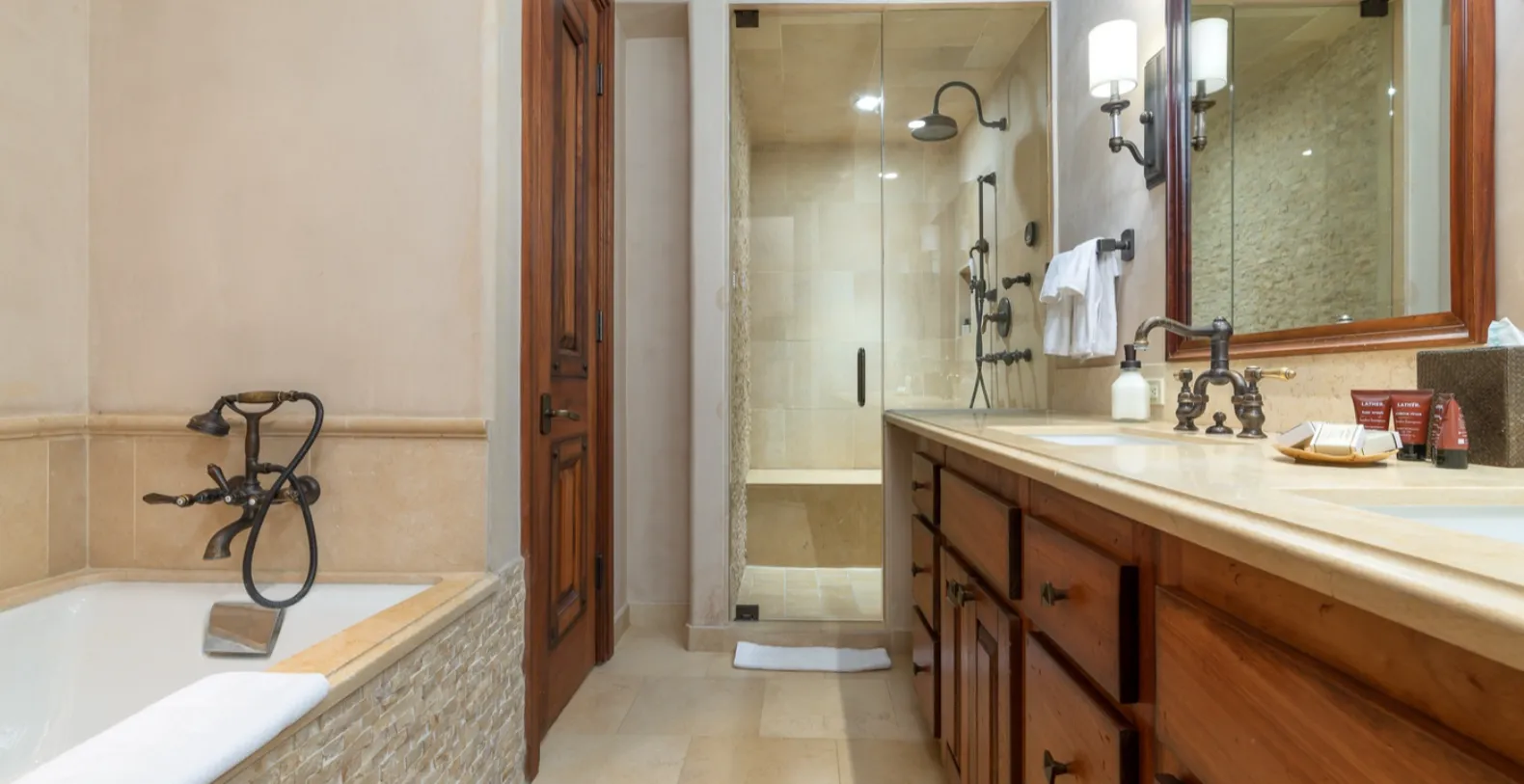 All three bedrooms are located on the lower level, offering quiet, restful spaces for relaxation. Each bedroom features its own private ensuite bathroom, ensuring comfort and privacy for every guest. The main bedroom is especially luxurious, with a large ensuite featuring a soaking tub and walk-in steam shower.