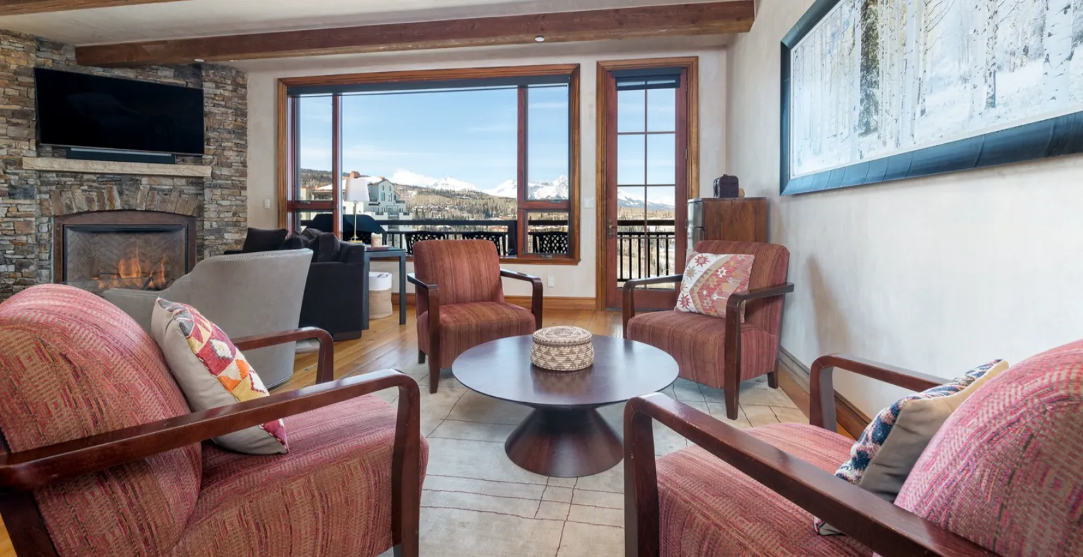 This Mountain Village condo is a warm and welcoming alpine vacation retreat perfectly positioned in the heart of the village. Step inside and you’re greeted by a bright, open-concept living space designed for comfort and connection. Large picture windows frame panoramic mountain vistas, filling the home with natural light. The living room features plush seating around a stone-clad gas fireplace and a large TV—an inviting spot to unwind after a day on the slopes. Just beyond, sliding doors lead to the balcony, where you can breathe in the crisp mountain air and admire the stunning scenery.