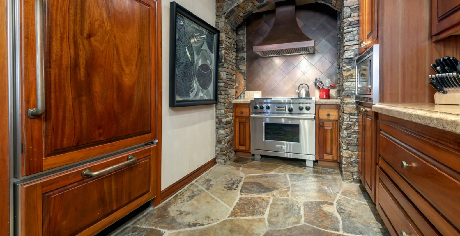 The living room, dining area, and kitchen flow seamlessly together, creating a social atmosphere ideal for families and groups. Share meals or play games around the round dining table with seating for eight. The kitchen blends classic and contemporary, combining rich wood cabinetry and stone accents with modern stainless-steel appliances and ample counter space.