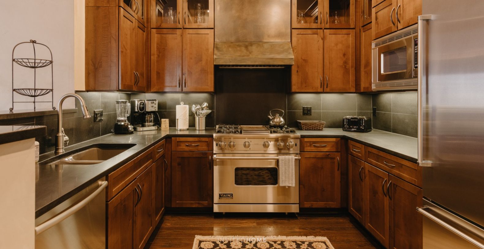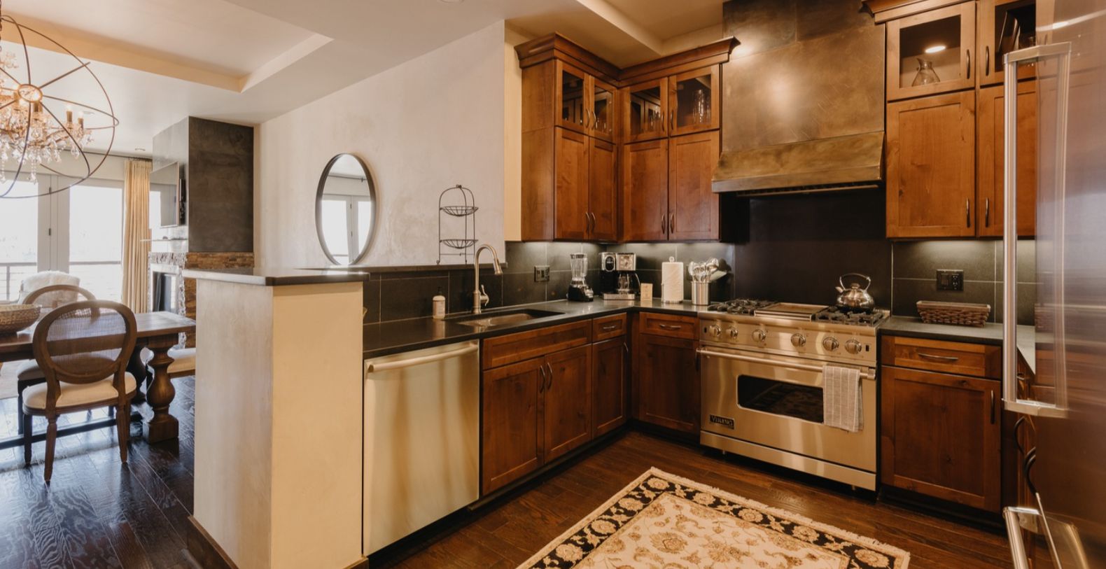 In the kitchen, modern lighting and sleek design complement the traditional wood cabinets, and the stainless steel appliances provide an exceptional environment cooking. The Master Bedroom takes luxury to a new level, with king-size bed complete with a tufted headboard, a gas fireplace, and access to the balcony. In the attached Master Bathroom, there’s a large tub and a walk-in, frameless glass shower for rejuvenating after a day on the mountain. The guest bedroom features unique sliding barn-style doors, and is located near a shared bathroom with single sink and a shower/tub combination.