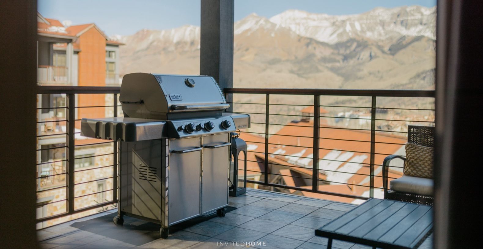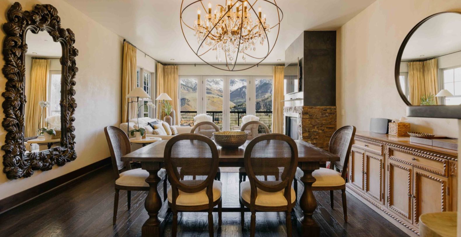 The open-concept space encompasses the dining area as well, which features a table set for six guests beneath a lavish chandelier. From the balcony, you’ll have unobstructed views of the rugged Dallas Divide and down valley below. Here you’ll find a grill and outdoor seating that let you cook and relax while admiring the truly staggering mountain backdrop.