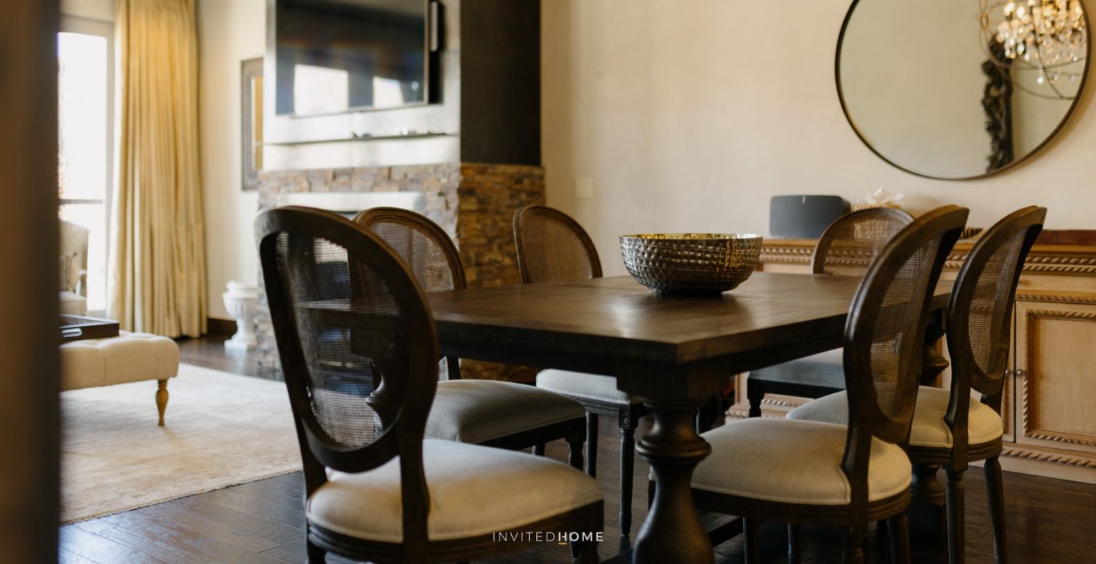 Alpenglow at Cassidy Ridge is a gorgeous vacation home with luxury design, spacious living areas and easy ski access. The main living area is fit for royalty, with cascading drapes, French country armchairs, and a view of the iconic ridgeline that can’t be beat. In the center of it all there’s gas fireplace, and above it, a large flat screen TV.