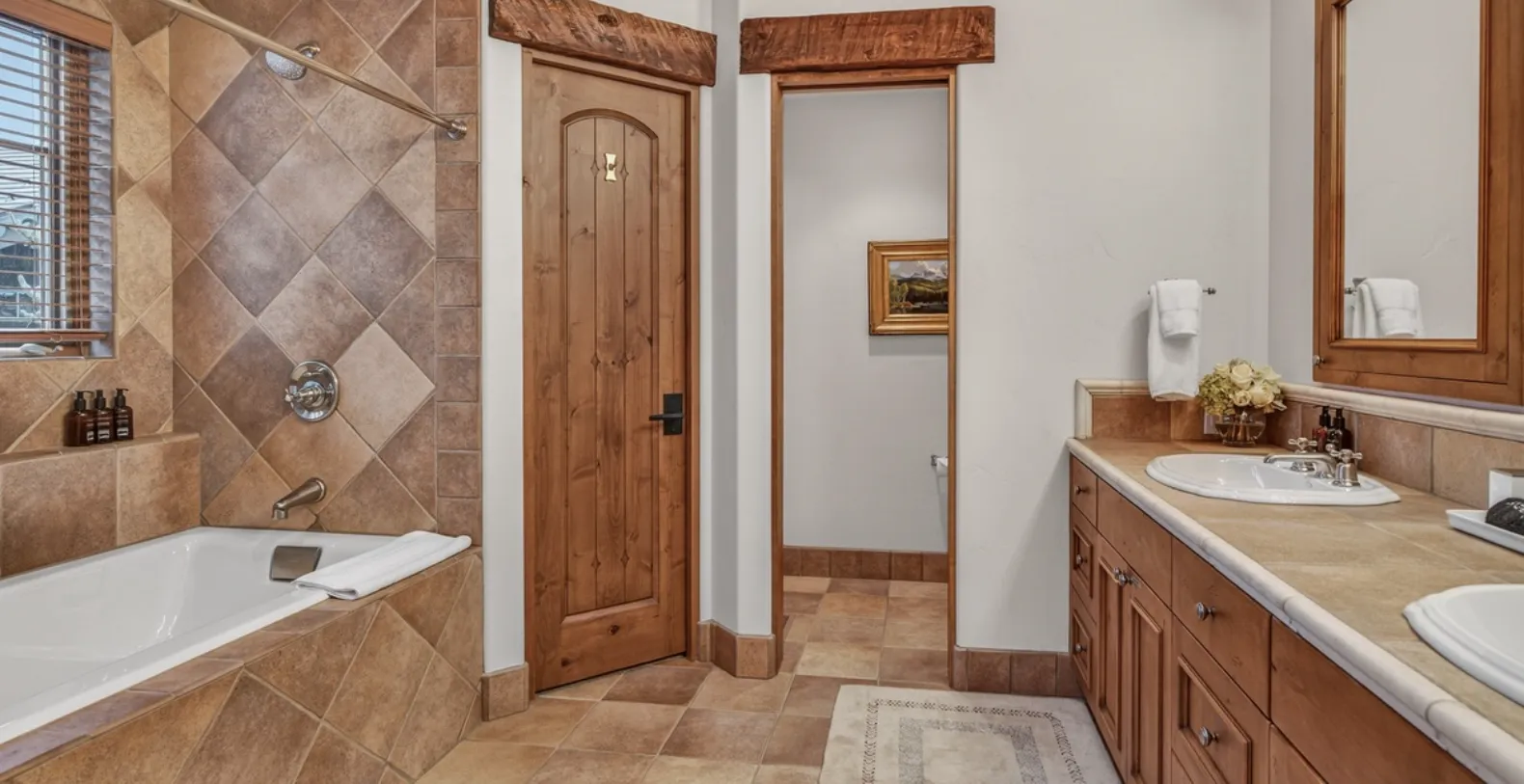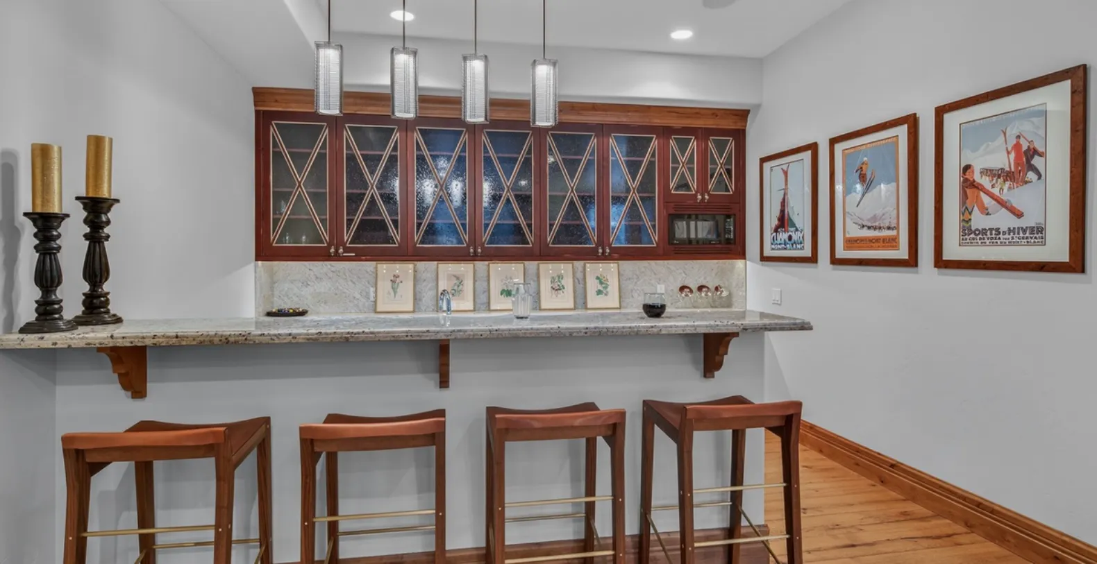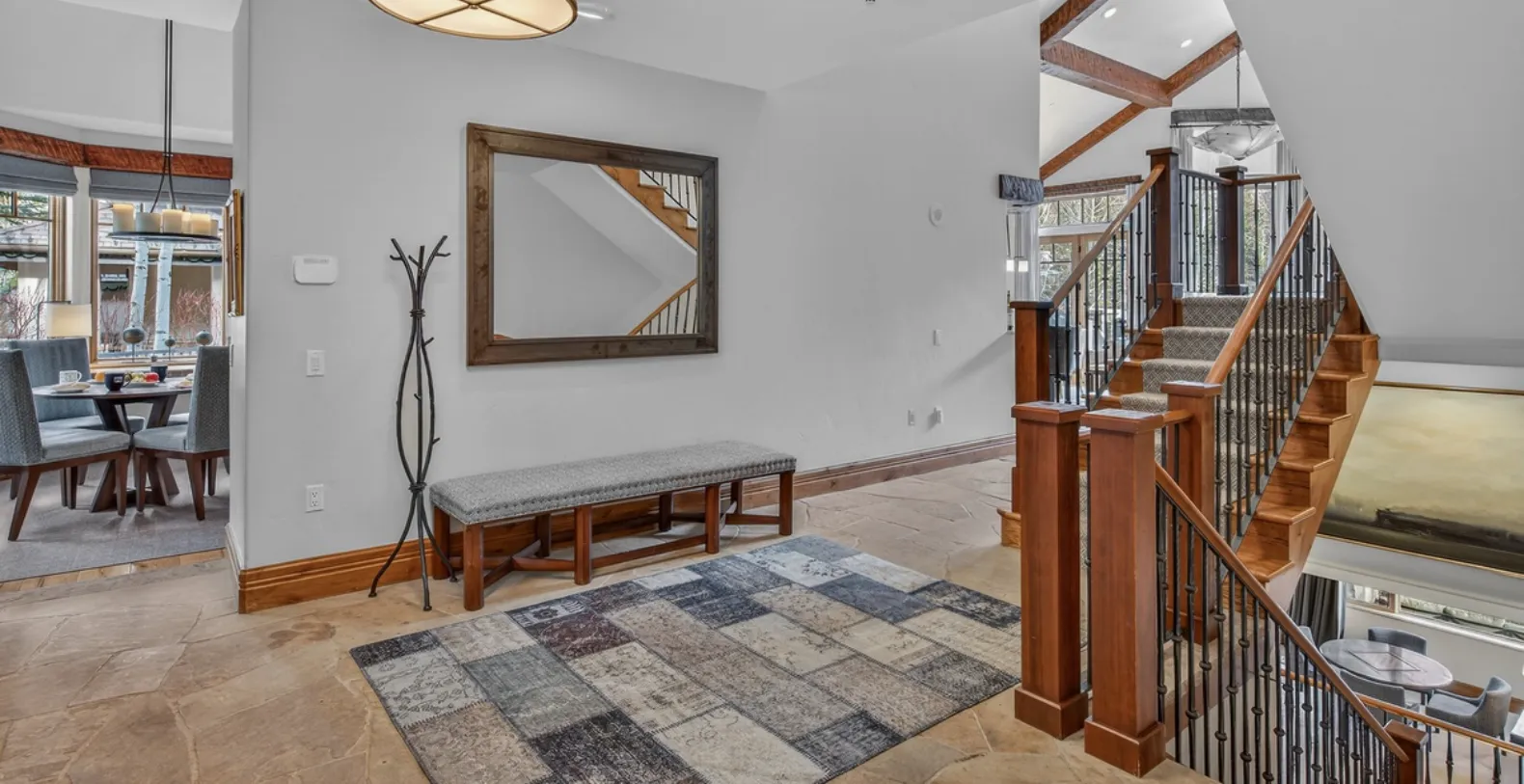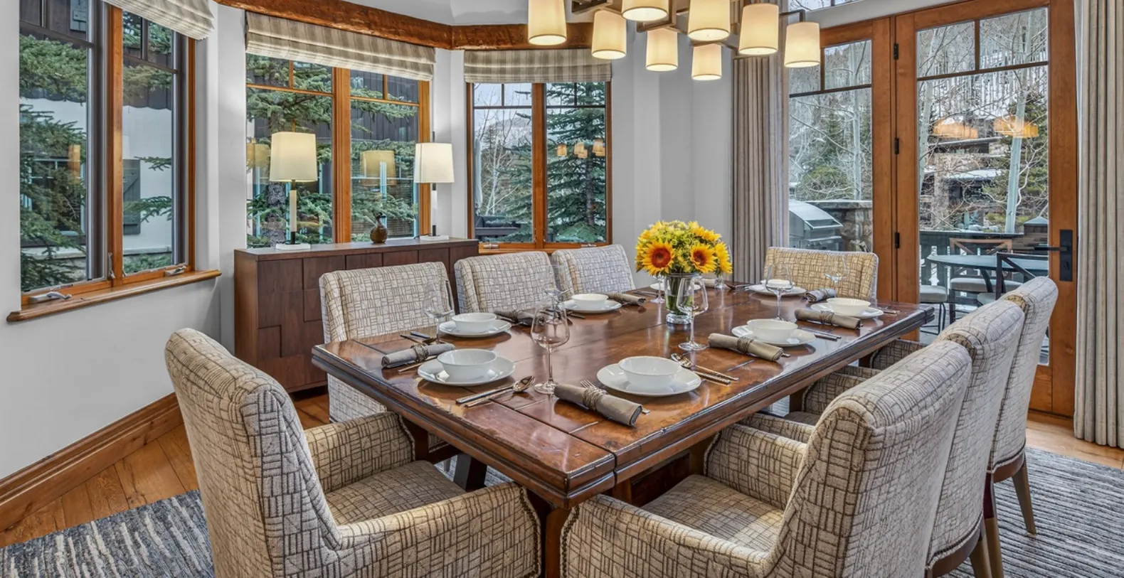 Upon entering the home, guests are immediately greeted by serene views of Gore Creek framed through the great room’s floor-to-ceiling windows. The open-concept main level is thoughtfully designed for both relaxation and entertaining, seamlessly connecting the living, dining, and kitchen areas. The living room is anchored by a dramatic stone gas fireplace and a large flat-screen TV, creating a warm and inviting space to unwind after a day on the slopes or exploring the village. The gourmet kitchen is a true highlight for guests who enjoy cooking and gathering. It features generous counter space, a six-burner Wolf gas stovetop, and dual ovens, making it equally suited for casual breakfasts or celebratory dinners. Just off the kitchen, the dining area comfortably seats six to eight guests, while the breakfast nook provides seating for four and the kitchen counter offers additional bar seating for two.