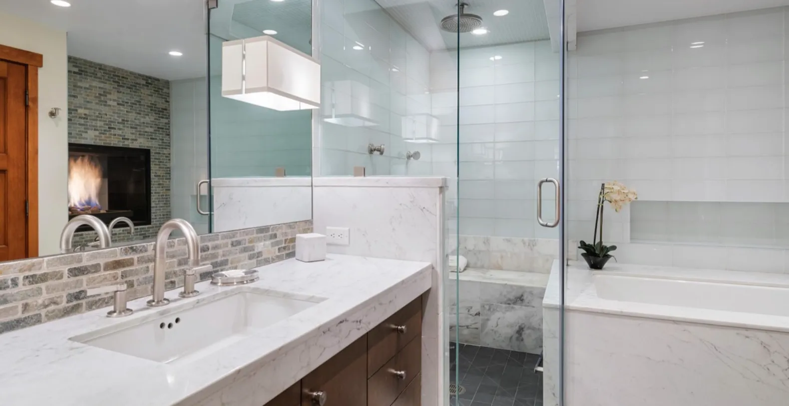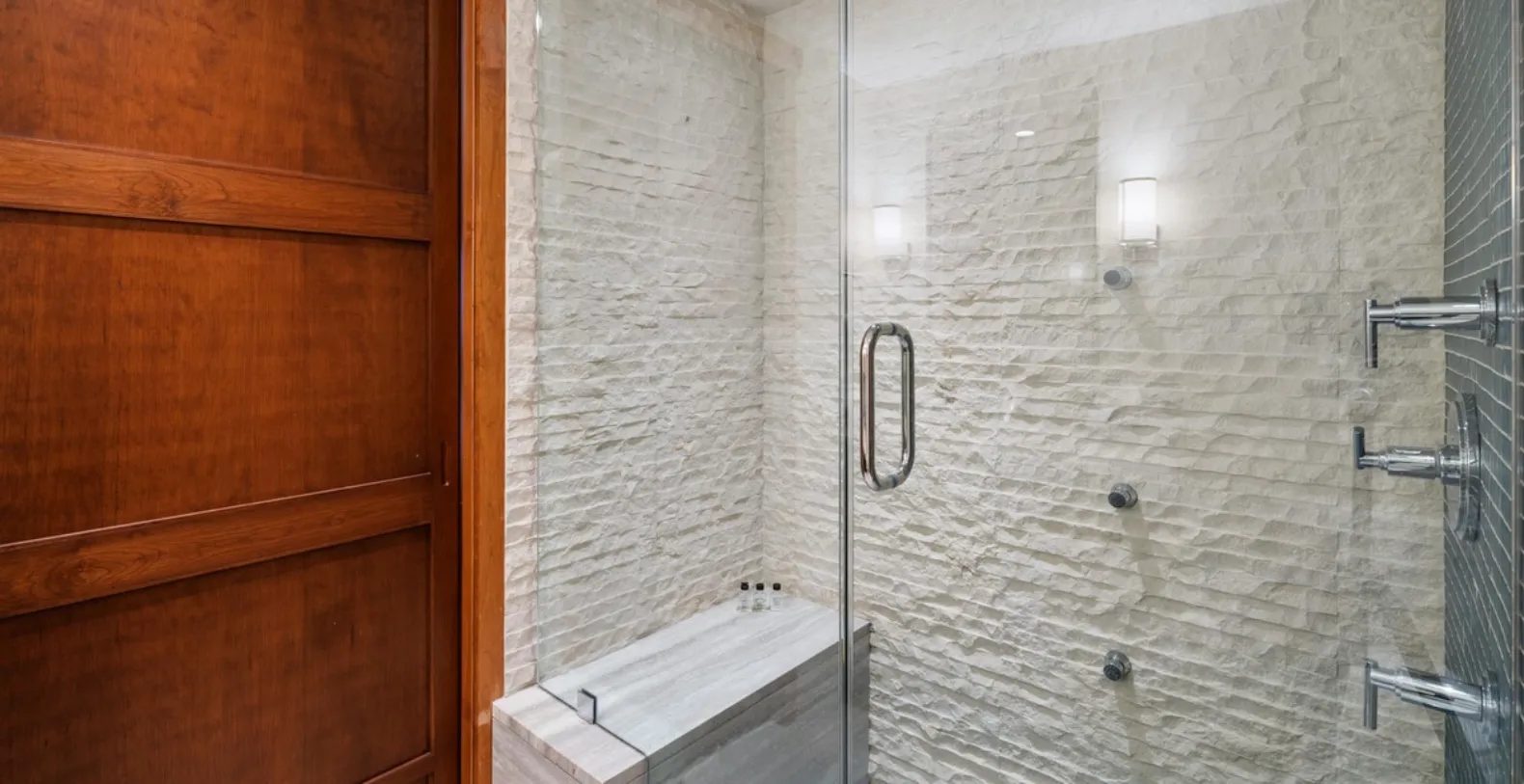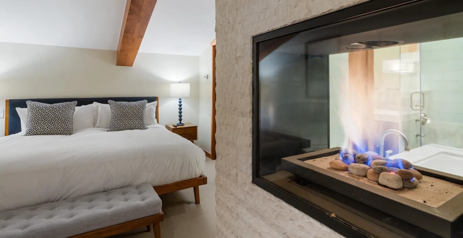 Chalet Schuss accommodates up to six guests across three well-appointed bedrooms, each designed for privacy and comfort. The primary suite features a king-size bed and a gas fireplace that opens to both the bedroom and the ensuite bathroom, where a soaking tub and separate shower create a spa-like retreat. The second bedroom offers a queen bed with its own ensuite bathroom, complete with a tub and shower. The third ensuite bedroom features a split king that can be configured as two twins, making it especially well suited for children or flexible group arrangements.