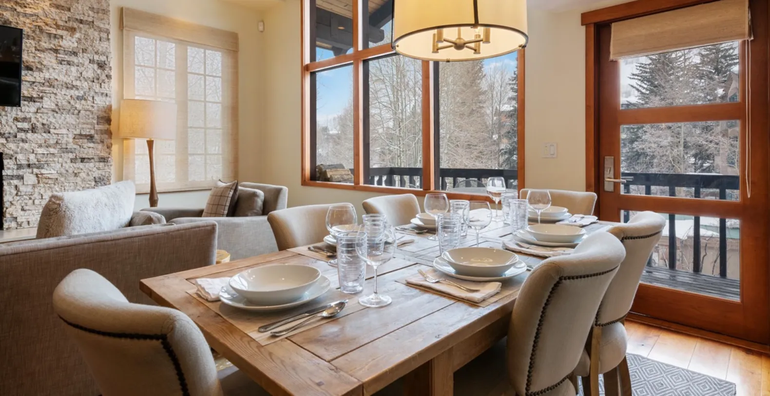 The open-concept layout allows everyone to gather comfortably, whether lounging in the living area or preparing meals in the thoughtfully designed kitchen. Fully equipped and beautifully appointed, the kitchen features a generous island with seating for four, allowing the chef in your group to stay connected while cooking. Adjacent to the kitchen, the dining area seats six, making it perfect for shared breakfasts before hitting the slopes or cozy dinners after a day outdoors. Just off the great room, a private balcony with a gas grill offers an ideal setting for casual al fresco meals or a quiet moment overlooking the creek.