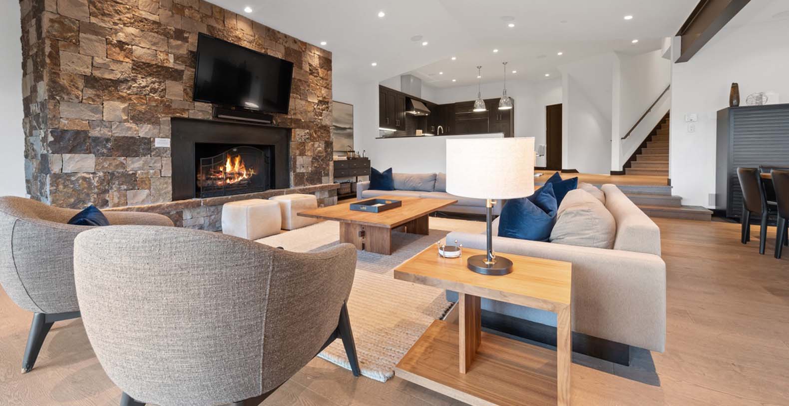 This home is on four levels. When you enter through the front door, there is a large entryway. Heading downstairs from here, there is a small office/entertainment room on the third level. The next level down is the main level with the kitchen, living area, dining area and primary suite. The remaining three bedrooms and the family room, as well as the hot tub, are on the lower level. There is an elevator in the residence for guests’ convenience.