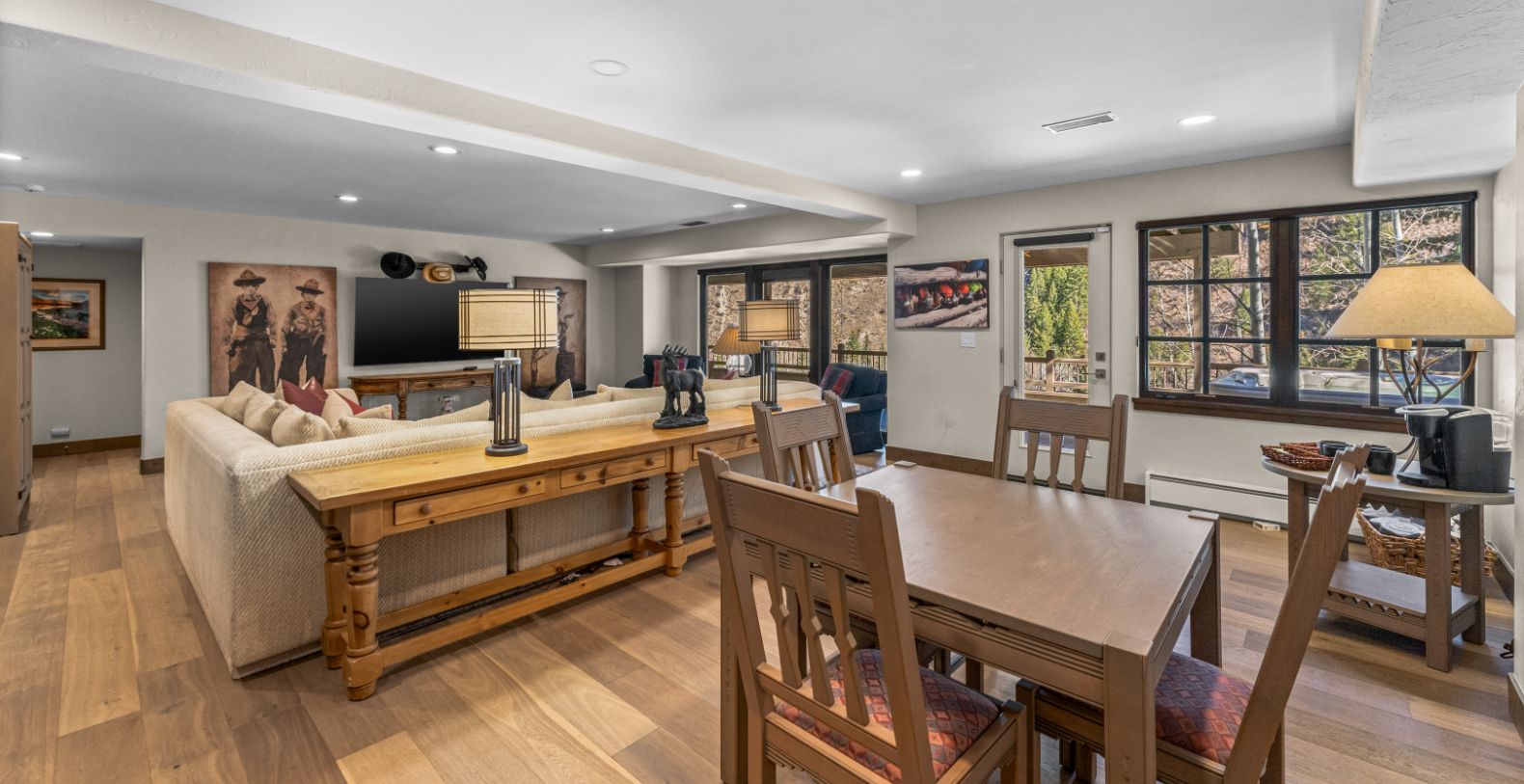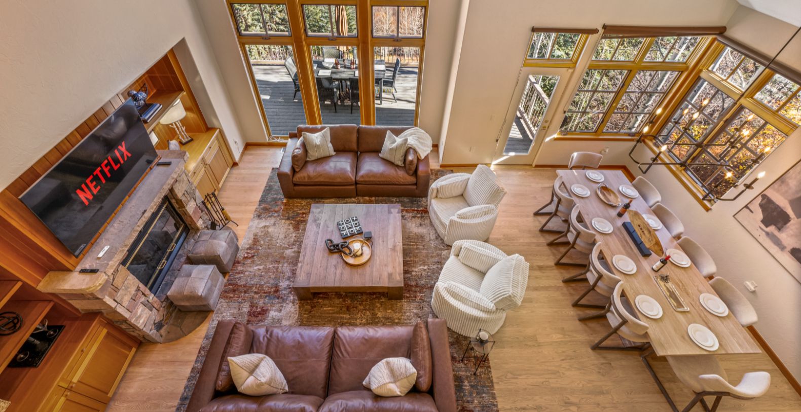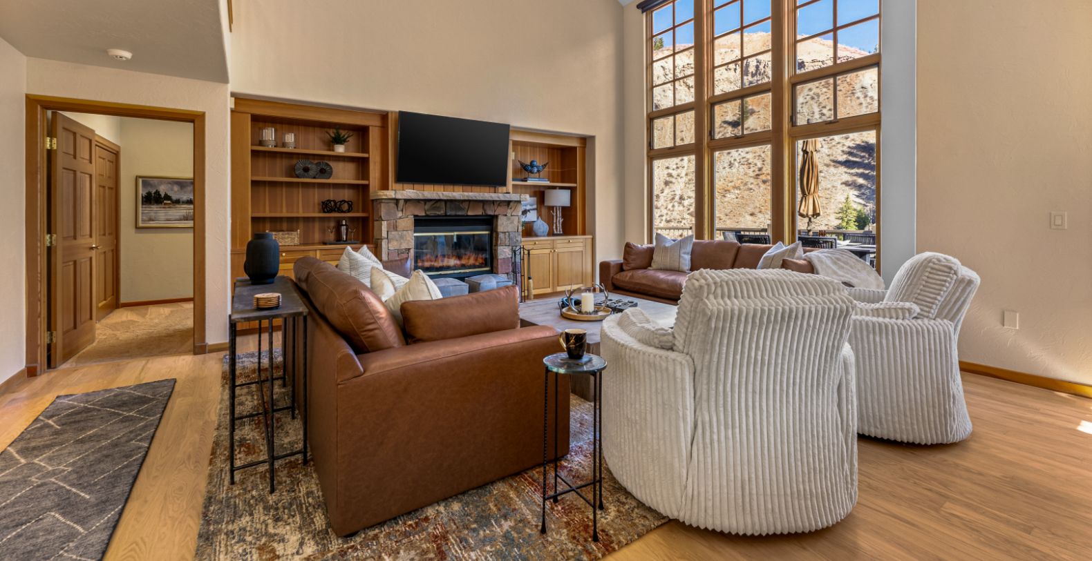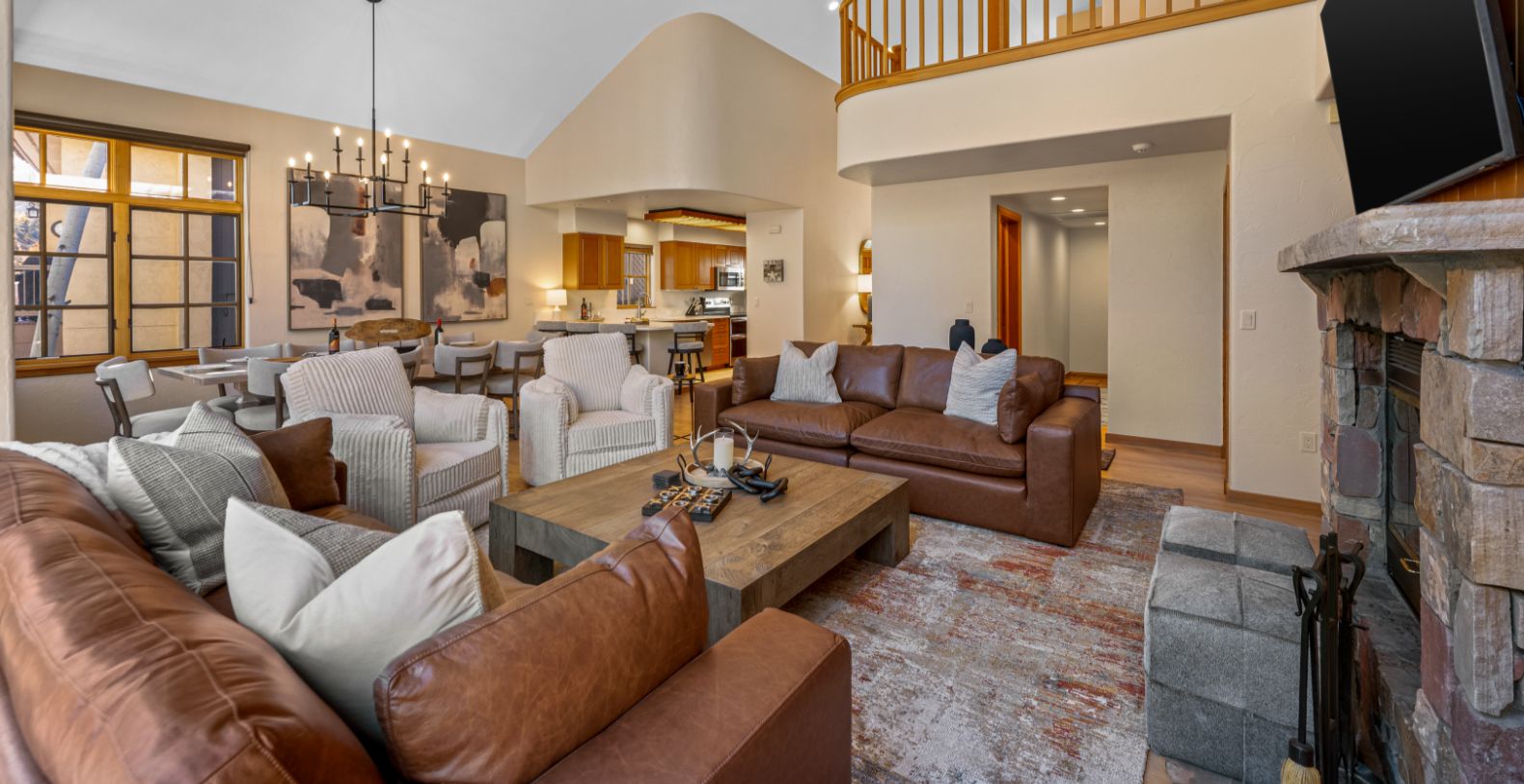 From the moment you enter, an impressive open floor plan unfolds, highlighted by vaulted ceilings and expansive windows that frame the dramatic Rocky Mountain landscape. Natural light fills the main living area, where refined furnishings, warm wood finishes, and a stone fireplace create an inviting atmosphere for gathering after a day on the slopes or trails. The home is thoughtfully designed for both relaxation and entertaining, with generous living spaces that flow effortlessly from indoors to outdoors.
