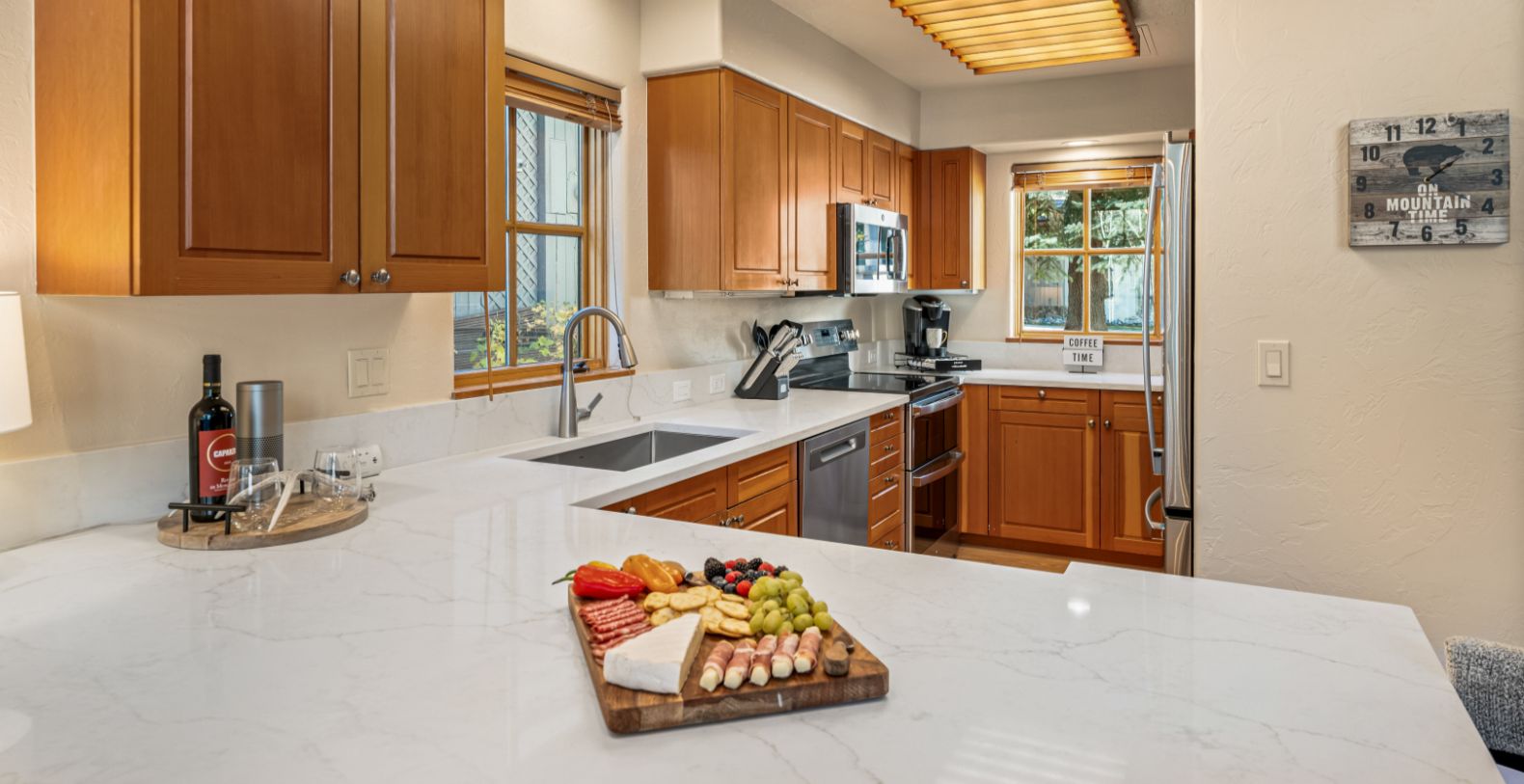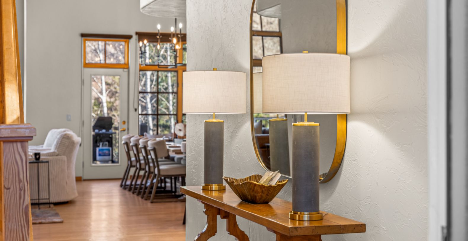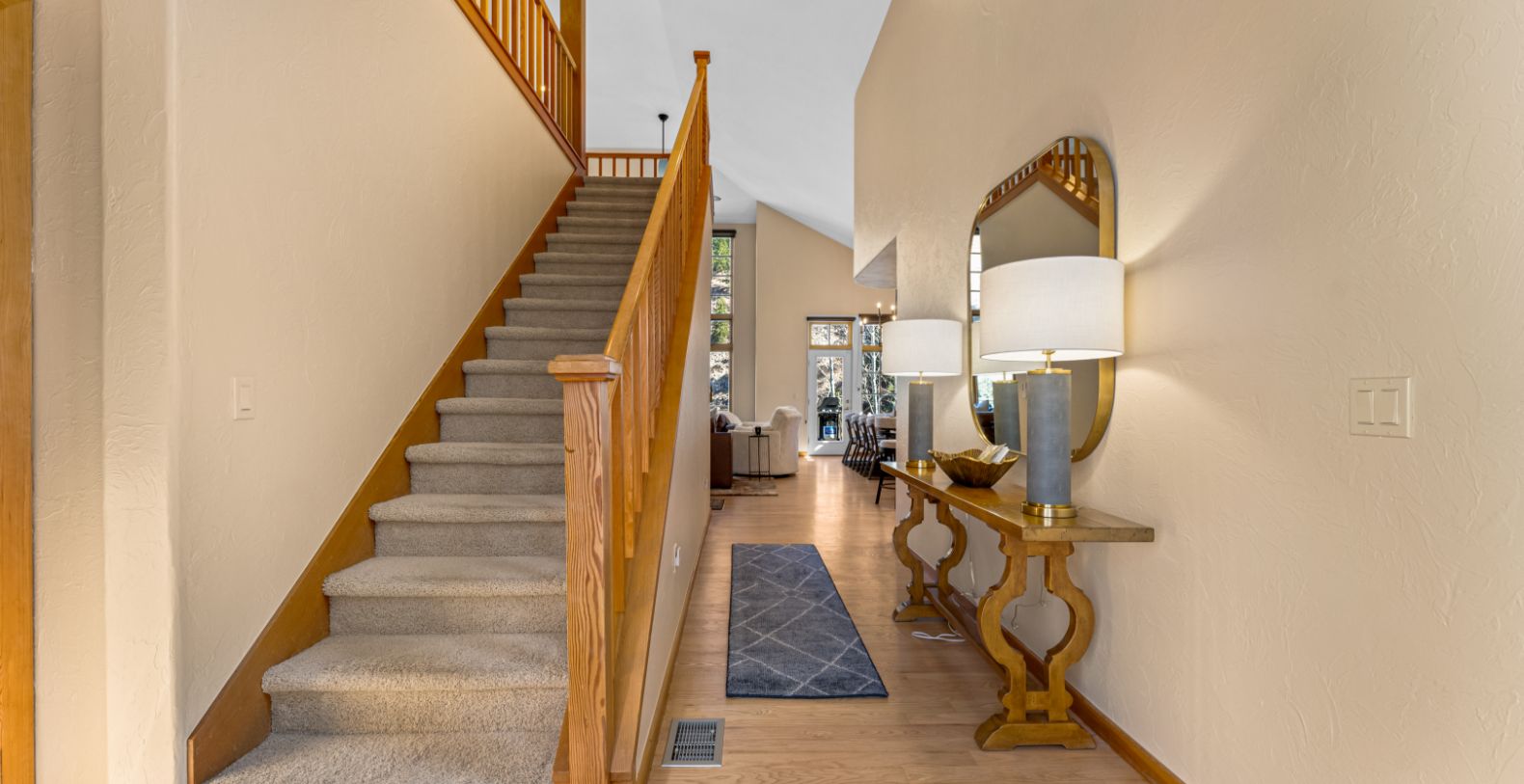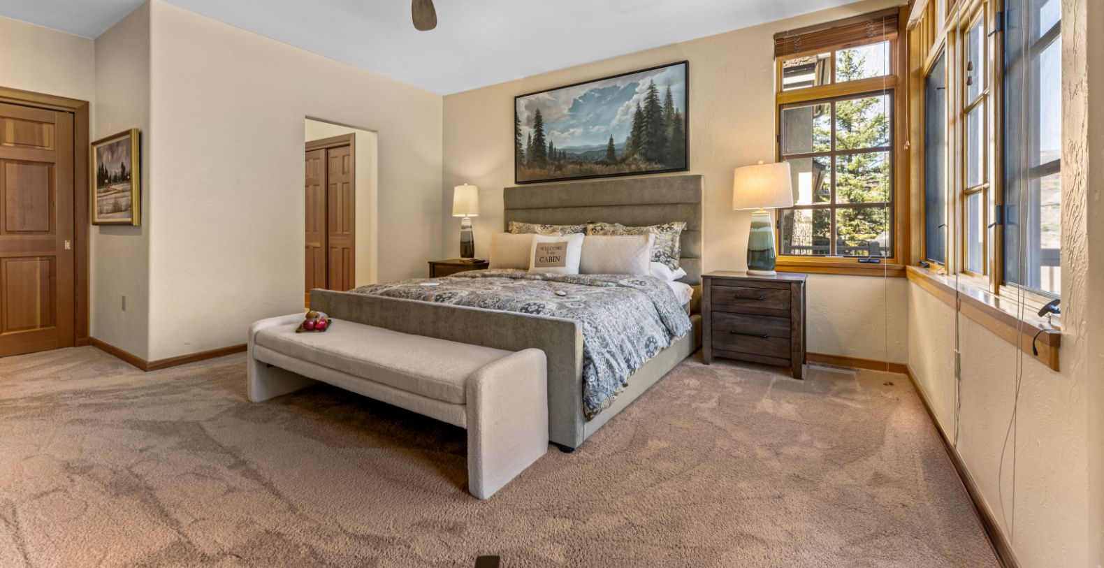 From the moment you enter, an impressive open floor plan unfolds, highlighted by vaulted ceilings and expansive windows that frame the dramatic Rocky Mountain landscape. Natural light fills the main living area, where refined furnishings, warm wood finishes, and a stone fireplace create an inviting atmosphere for gathering after a day on the slopes or trails. The home is thoughtfully designed for both relaxation and entertaining, with generous living spaces that flow effortlessly from indoors to outdoors.
