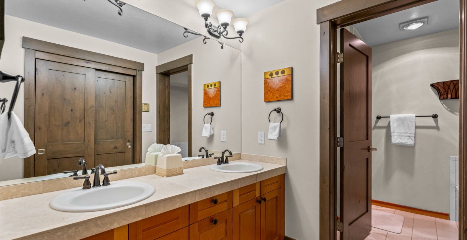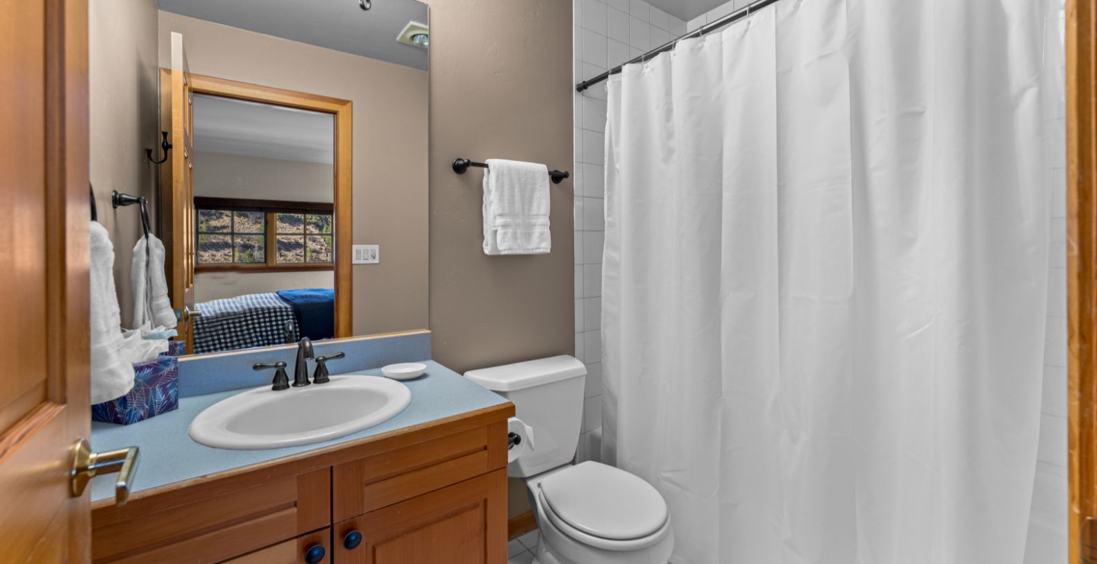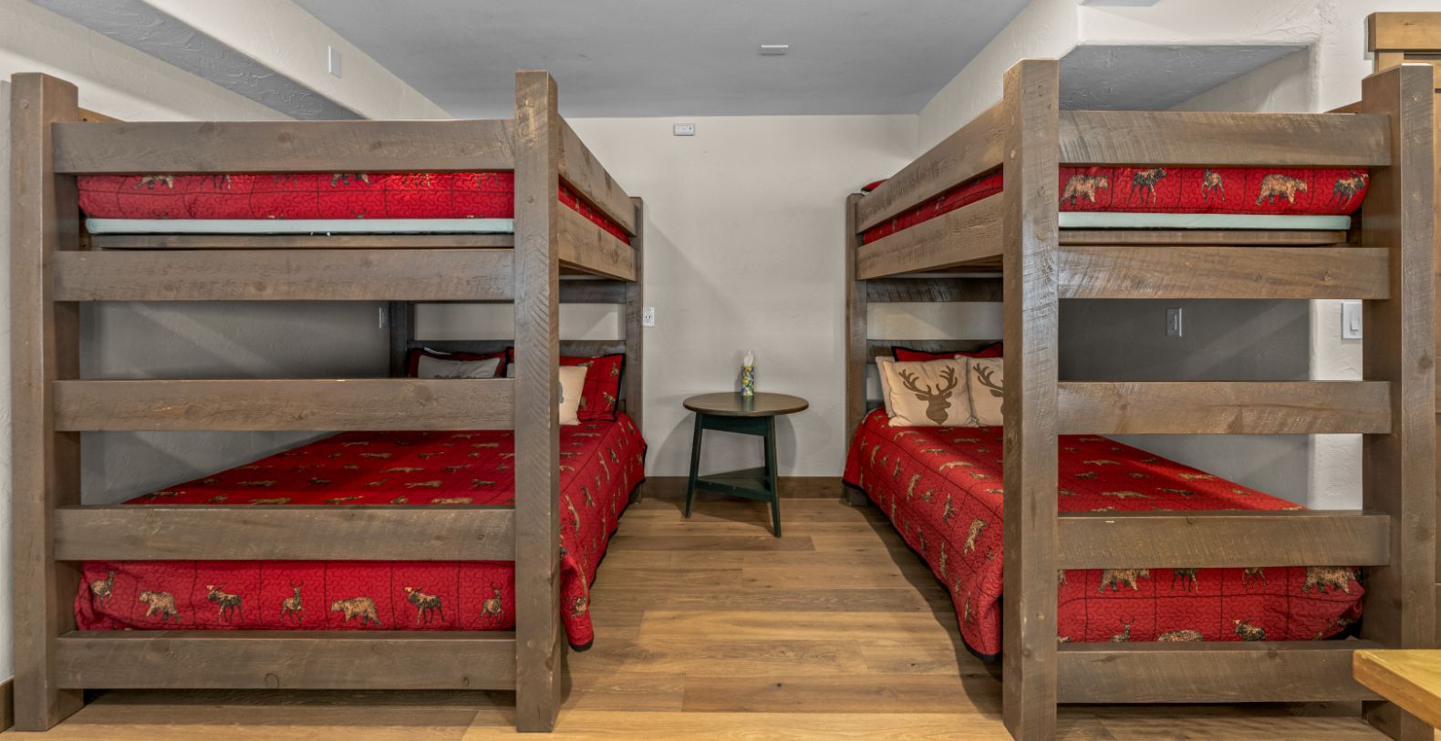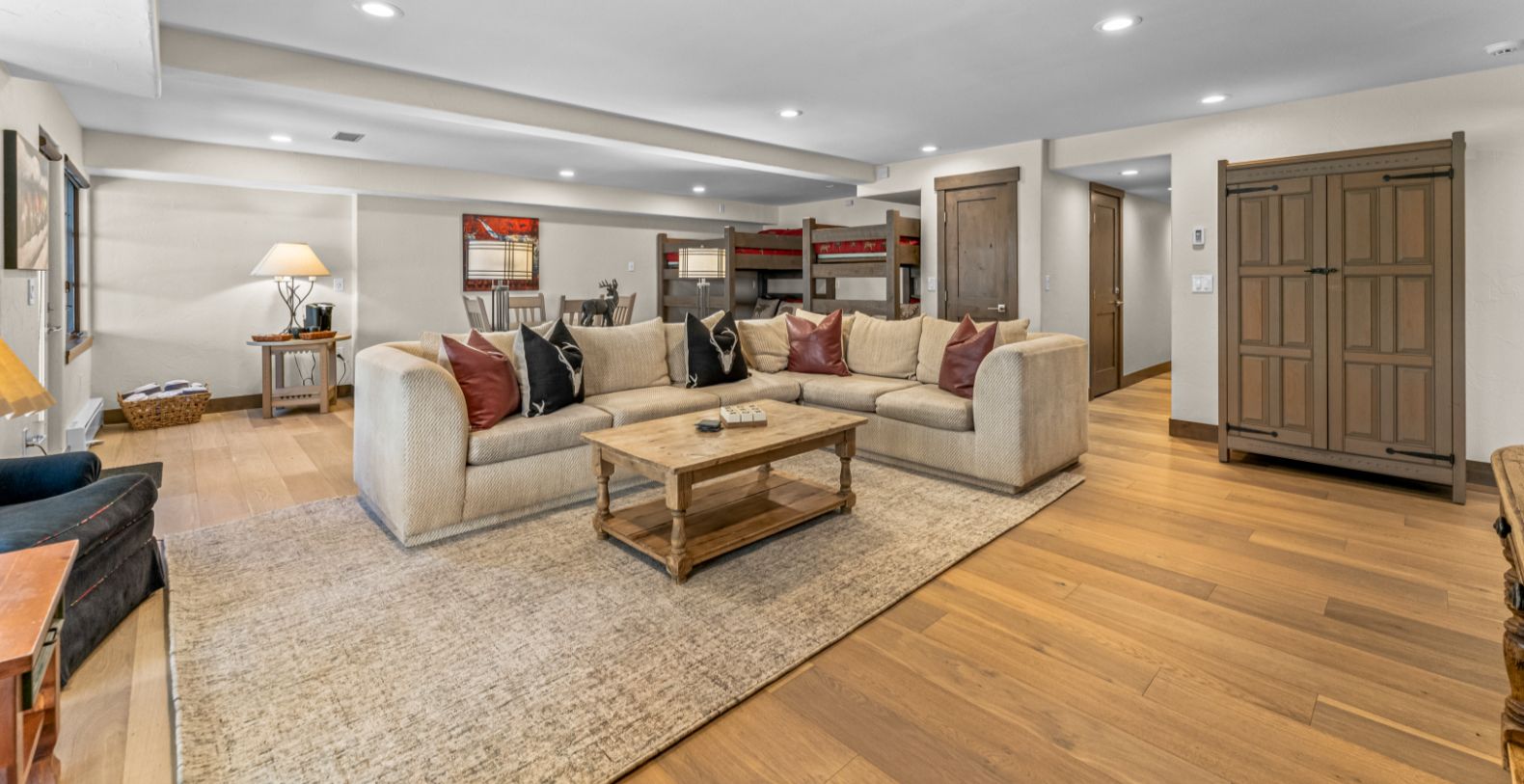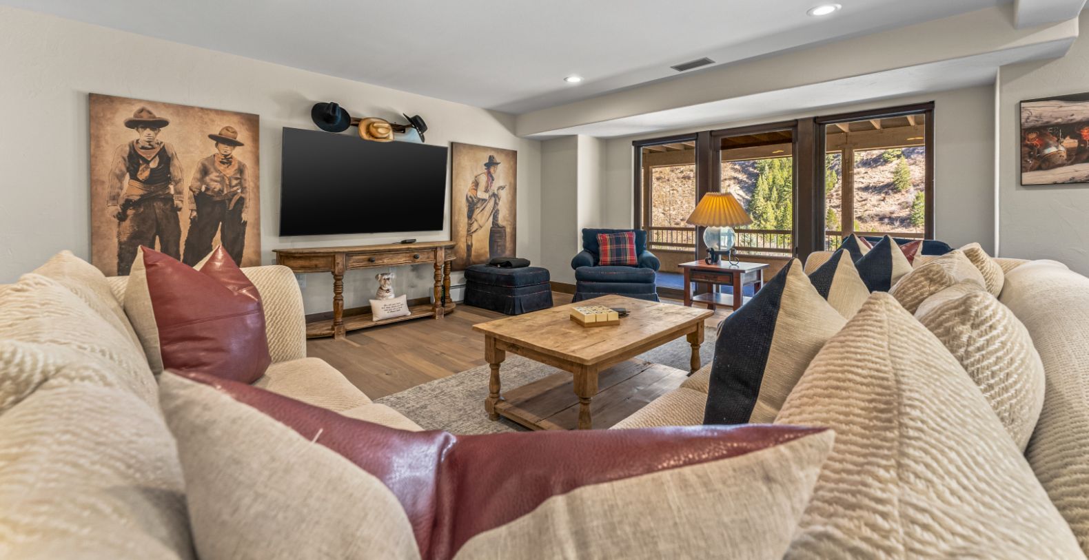 Rocky Mountain Views offers five spacious bedrooms and five full bathrooms, ensuring privacy and comfort for every guest. The home is fully stocked with hotel-grade towels and premium shampoo, conditioner, and body wash for a true luxury stay. A large secondary living area on the terrace level adds flexibility and fun, featuring two sets of bunk beds and a full bathroom, making it ideal for children, teens, or extended family. This additional lounge space is perfect for movie nights, games, or relaxing away from the main living area.