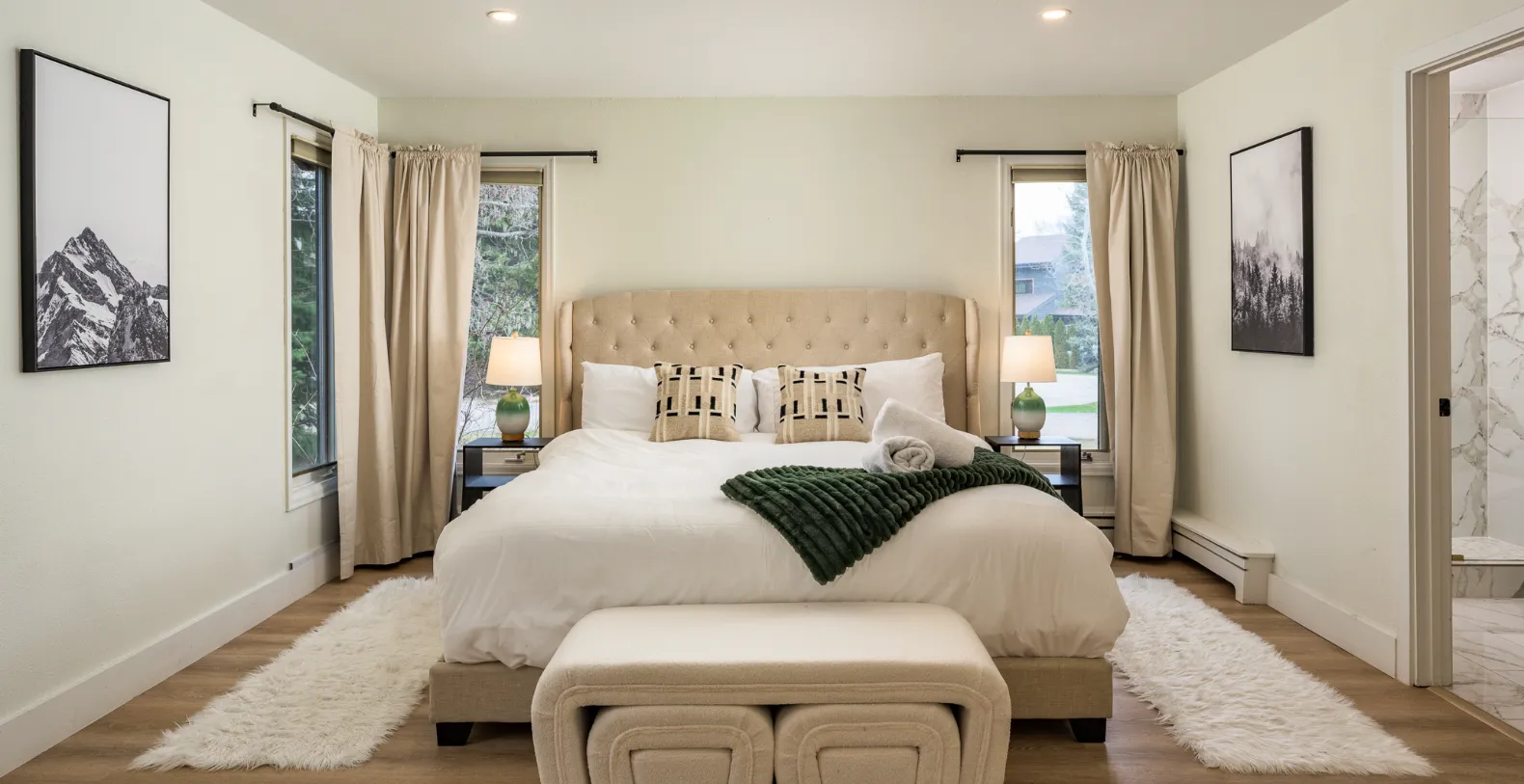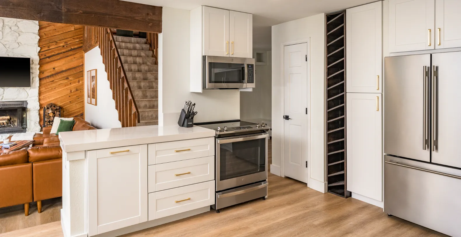 Designed with large groups in mind, this custom home comfortably accommodates up to 14 guests across five spacious bedrooms and 3.5 bathrooms. The main living area is welcoming and expansive, centered around a striking stone fireplace and plush seating that invites everyone to gather after a day on the slopes. The open-concept layout flows seamlessly into the dining and kitchen areas, making this home ideal for shared meals and social moments. A massive dining table seating up to 12 guests anchors the space, perfect for holiday dinners, celebratory evenings, or relaxed après-ski gatherings. The fully equipped kitchen offers modern appliances, generous counter space, and everything needed to prepare meals for large groups, whether you are cooking together or bringing in a private chef.