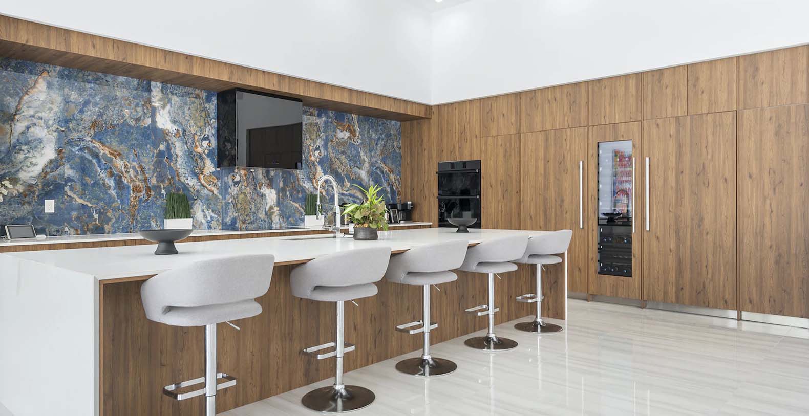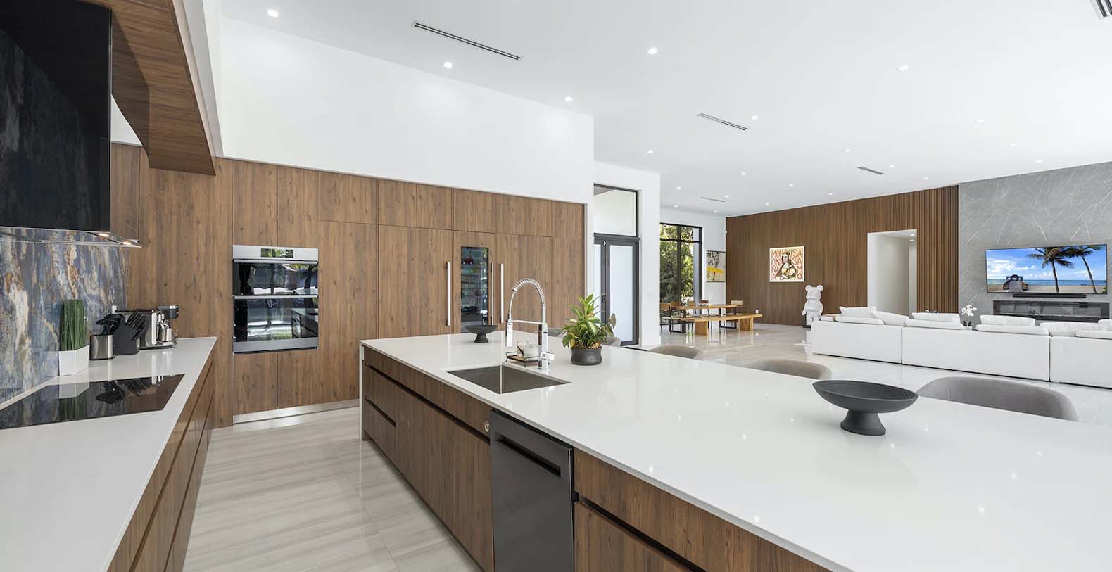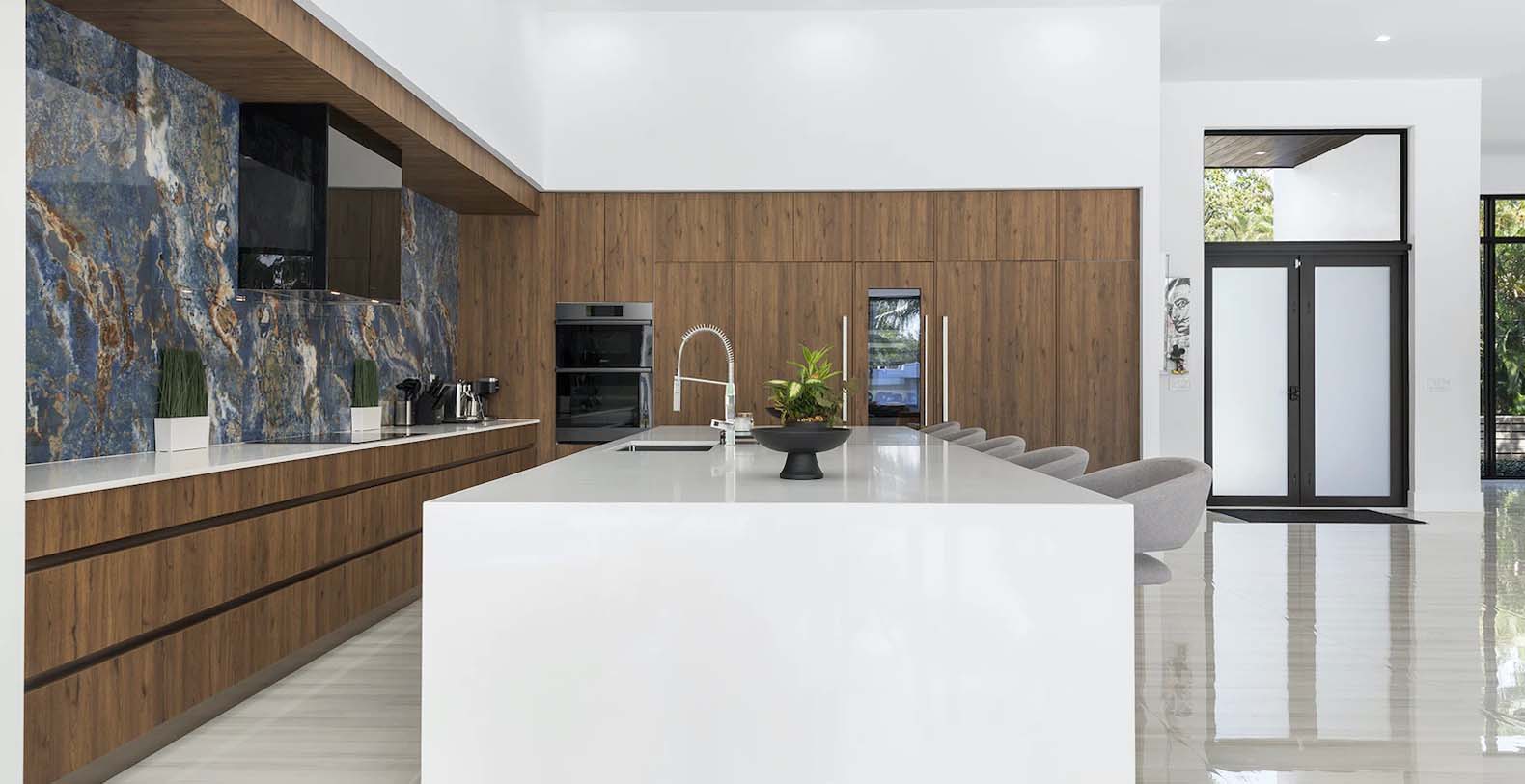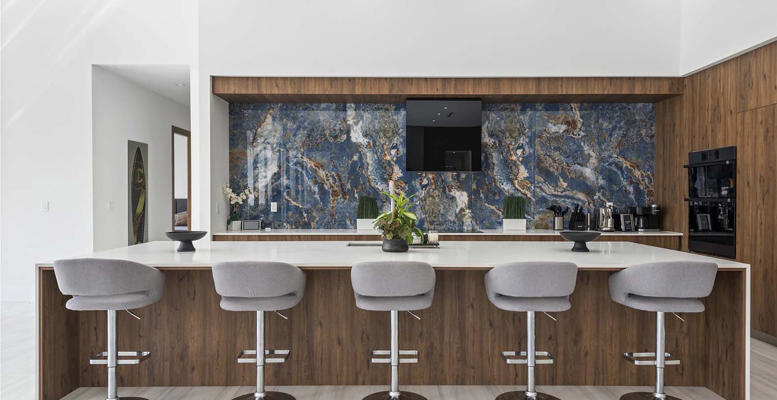 The house really does lend to a great floor plan for entertaining with open layout so you can seamlessly see from one end of the house to the other. The kitchen is pure luxury with it's incredible design, large island which invites you to sit and speak to the chef and high end appliances. Featuring a built in oven, beautiful and seamless countertop range, as well as a hidden refrigerator, wine chiller, and so much more. This kitchen is a designers dream and from the moment you see it, truly you will fall in love. The movement of the backsplash granite in barracuda blue mixed with the white quartz countertops and mix of contemporary light woods and finishes, this is a masterpiece. You also have a very rustic yet modern dining table which is perfect for 8-10 guests with more room to eat at the bar.