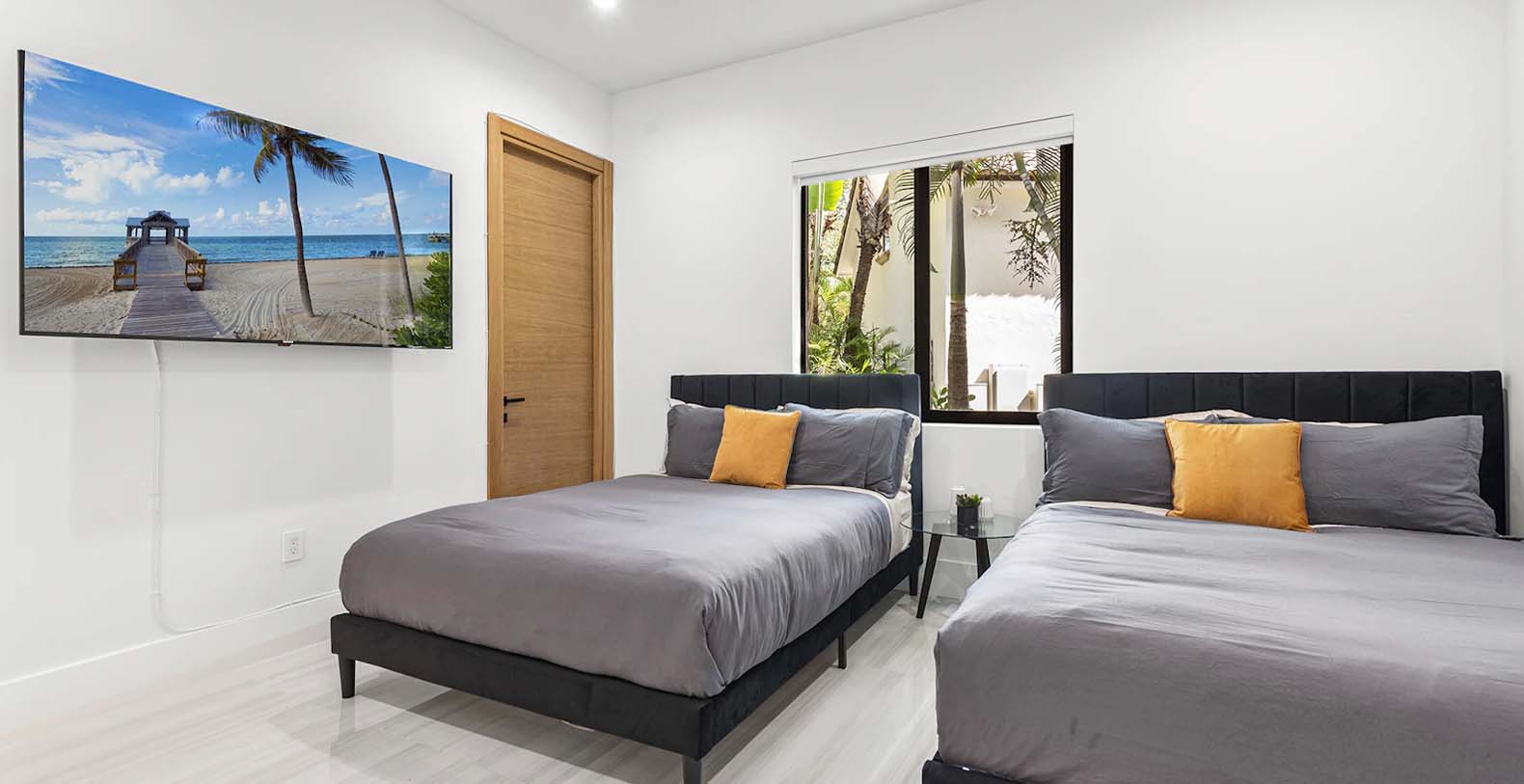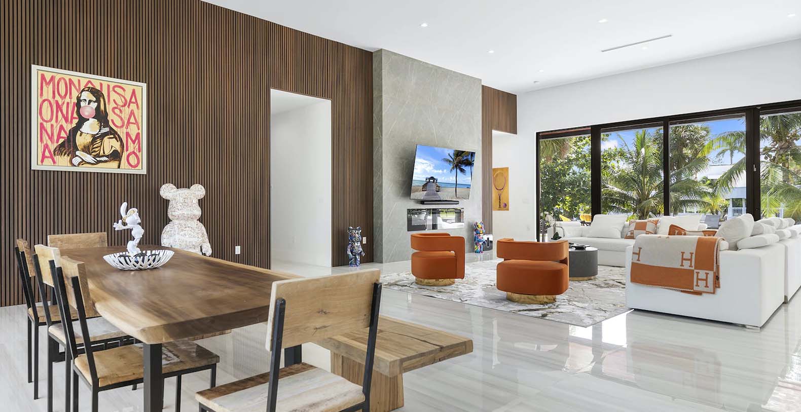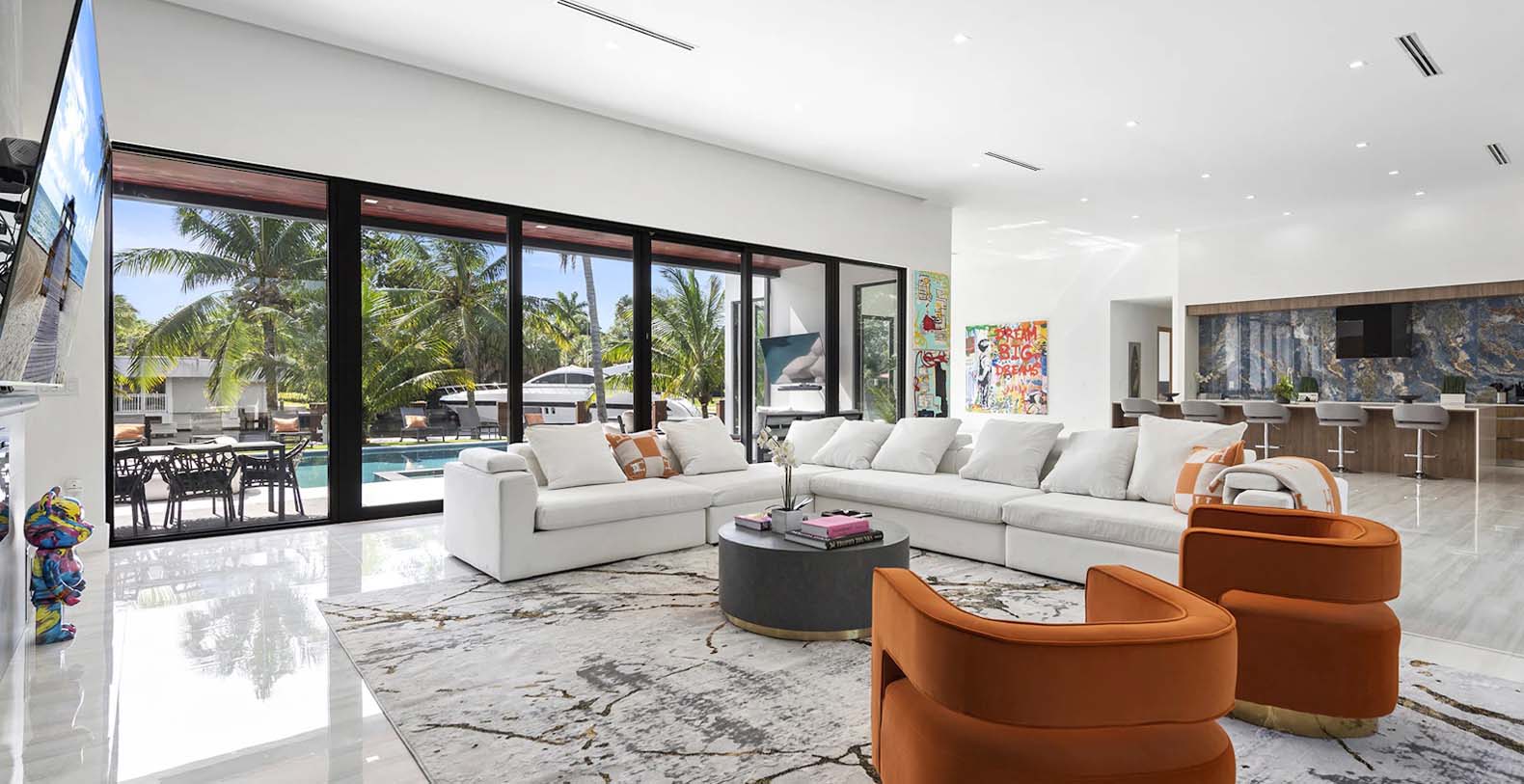 The Joy of Summer is really the epitome of what a vacation rental should be, located in Fort Lauderdale this hits every mark. This beautiful home is refreshing and modern, providing the eye at every point the magic of design and art. There is really nothing quite as beautiful, as when and owner and designer curate a beautiful masterpiece that makes everything beautiful. Giving this feeling of great luxury as you walk through the home and see bright open concept and glass windows that open the house up to natural beautiful Florida Sunshine that breaths through the house so wonderfully. The living area is very large with plush soft sofas that you can melt into while enjoying your big screen television.