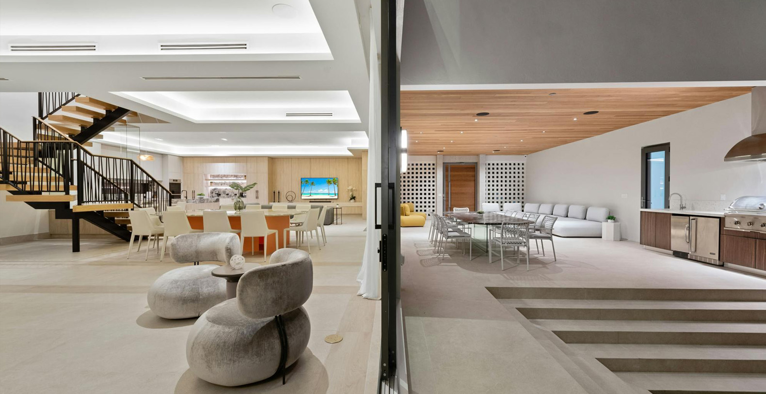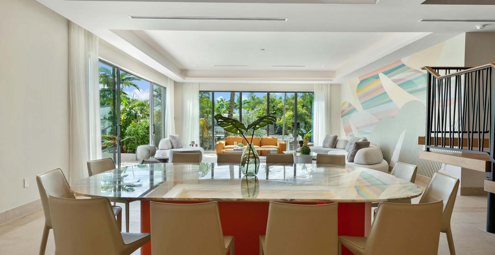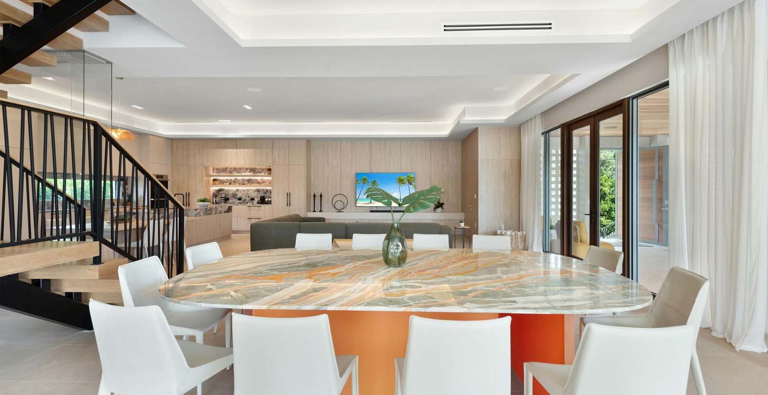 Water Lily is a beautiful vacation rental with amazing water frontage and luxury interior in Miami Shore, Florida. This property does tick all of the boxes from the inside out, blending design and unique features that make staying here relaxing. The moment you walk in you'll find the house is inspired by comfort and style, with lots of great large sofas and chairs throughout. The light from the large glass sliding doors warm the large living space and frame the beautiful indoor and outdoor feeling the house enjoys The stairway floats above as a feature in the center of the large living and dining areas.