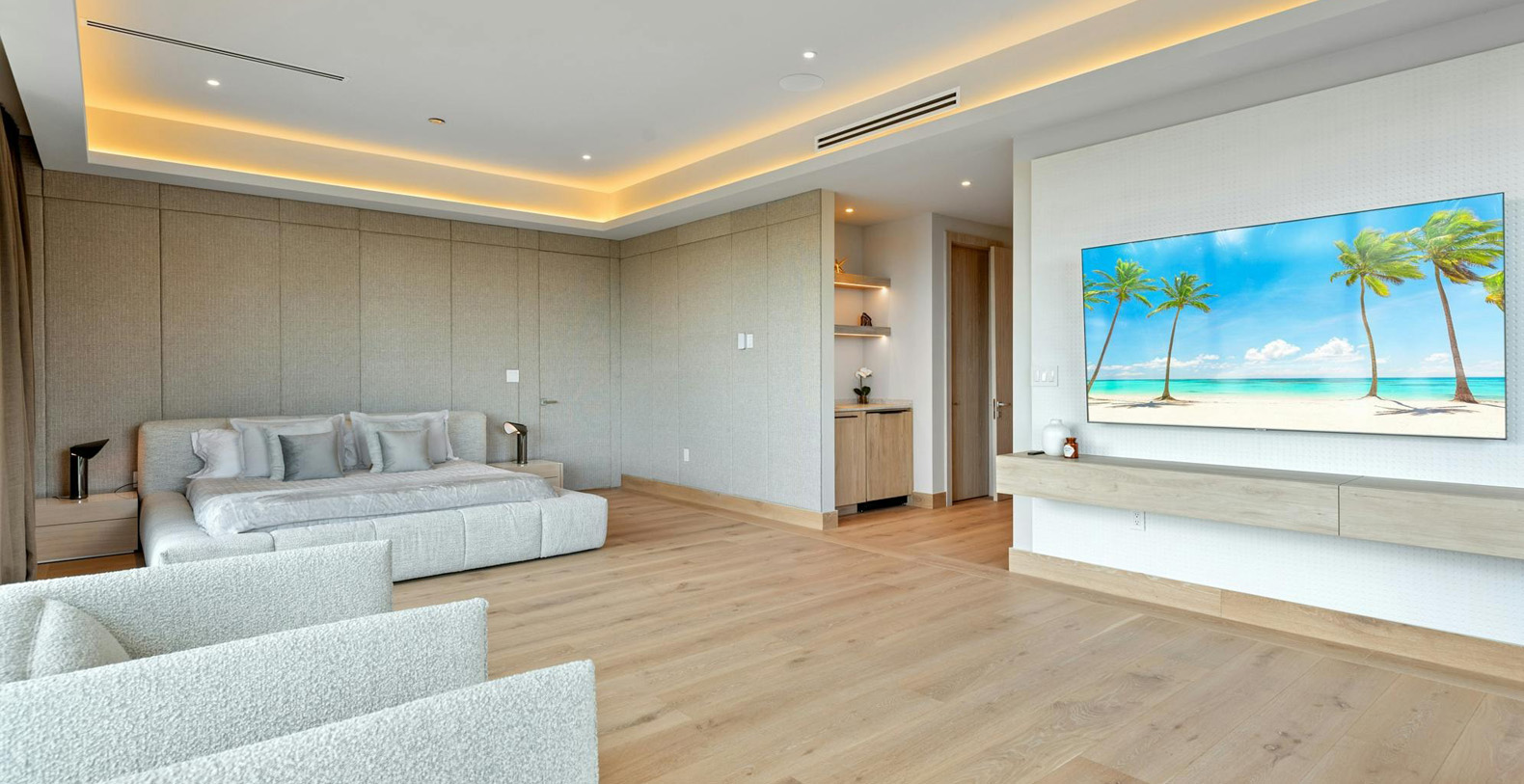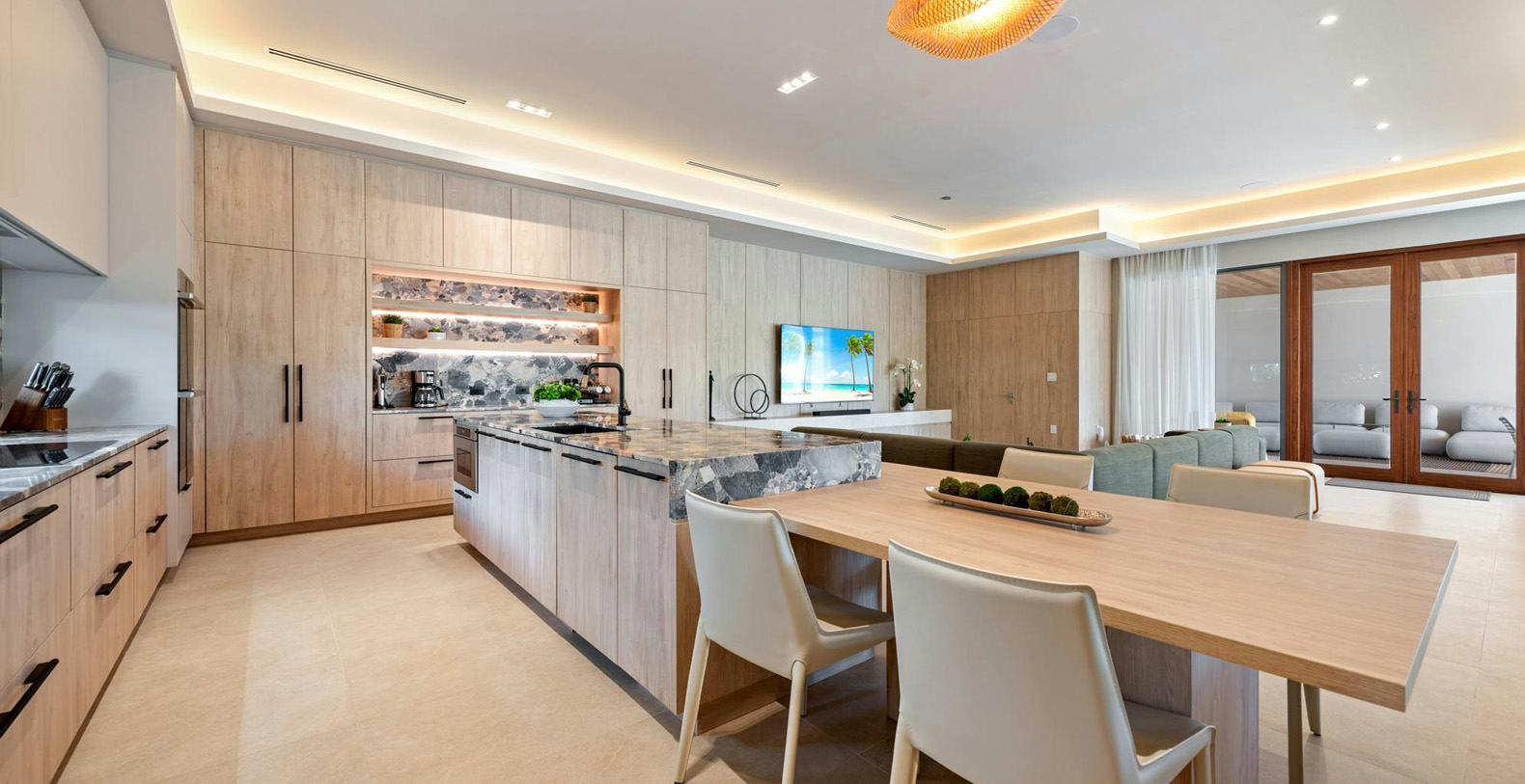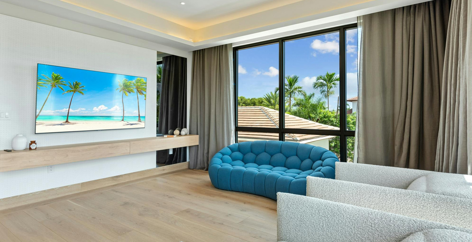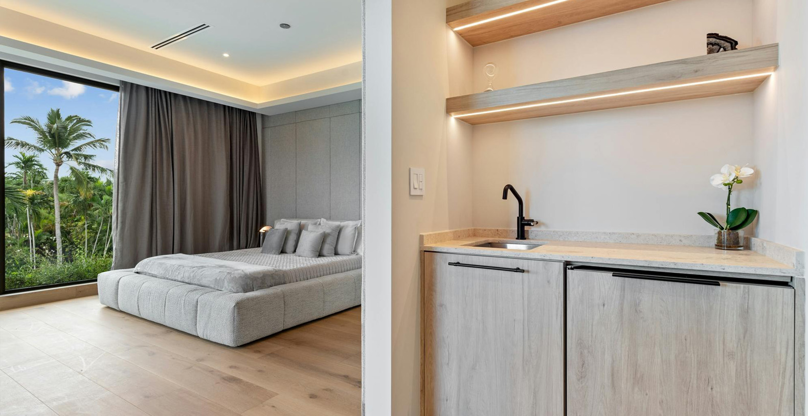 Water Lily is a beautiful vacation rental with amazing water frontage and luxury interior in Miami Shore, Florida. This property does tick all of the boxes from the inside out, blending design and unique features that make staying here relaxing. The moment you walk in you'll find the house is inspired by comfort and style, with lots of great large sofas and chairs throughout. The light from the large glass sliding doors warm the large living space and frame the beautiful indoor and outdoor feeling the house enjoys The stairway floats above as a feature in the center of the large living and dining areas.