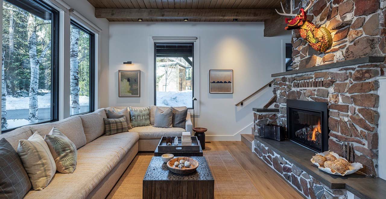 A warm welcome awaits with a bench and small table, leading into the main living space through a glass door. Cozy and inviting, the living area features an L-shaped sofa, a leather armchair with an ottoman, and a fireplace. Relax while streaming shows on the Smart TV with cable (bring your own streaming accounts). Large west-facing windows provide an abundance of natural light and stunning mountain vistas.