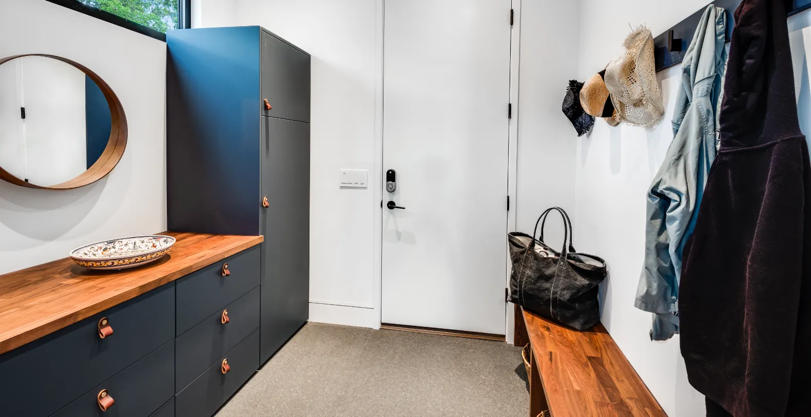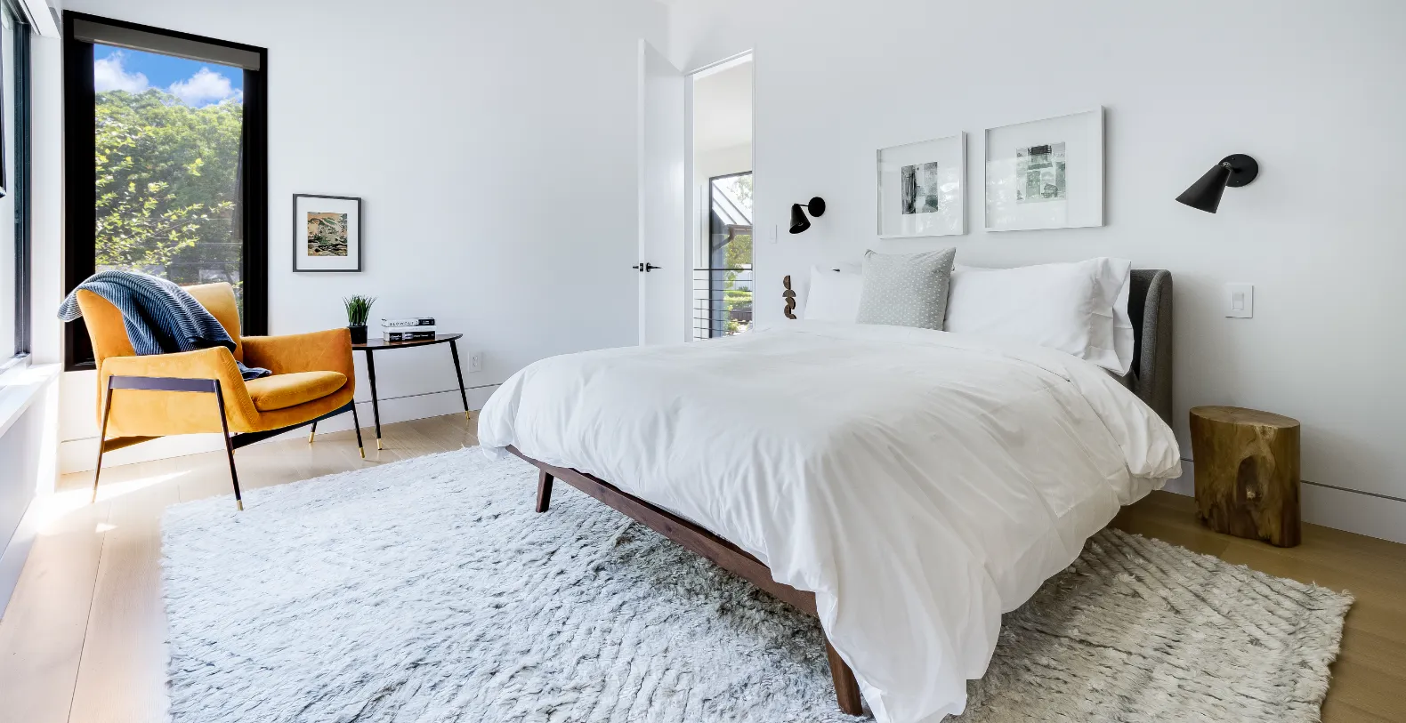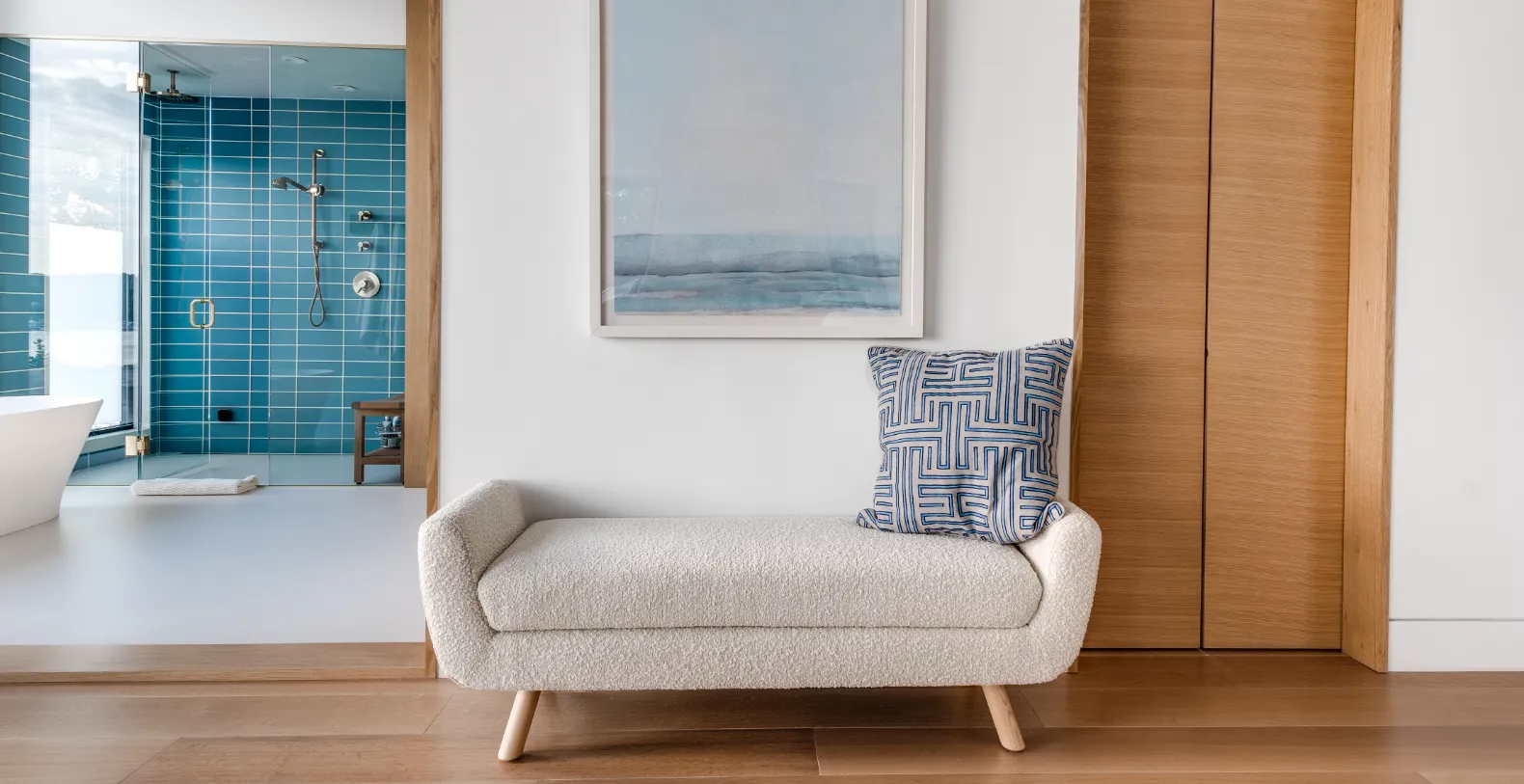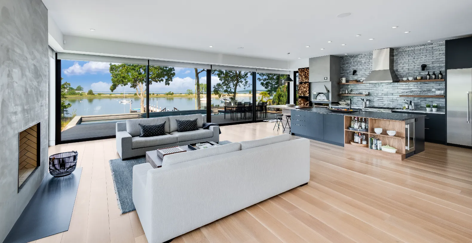 Inside, the home unfolds across beautifully designed living spaces where floor-to-ceiling glass frames uninterrupted water views. The main living area is bright and airy, featuring a stylish lounge, a fully equipped kitchen with breakfast bar, and a dining area that flows seamlessly to the outdoor terrace. High-end finishes, natural textures, and carefully curated furnishings create a relaxed ambience. Hamptons Waterfront accommodates up to eight guests across four elegantly appointed bedrooms, each with its own ensuite bathroom for ultimate privacy and comfort. The master suite features a king-size bed, while the remaining three bedrooms offer queen-size beds, all designed with a calming palette and thoughtful details.