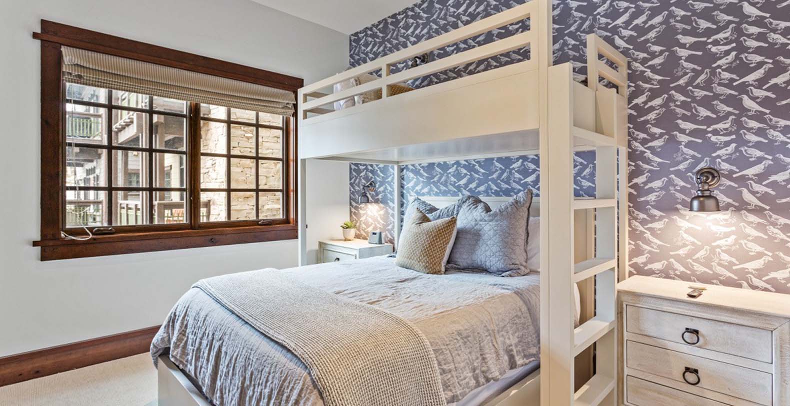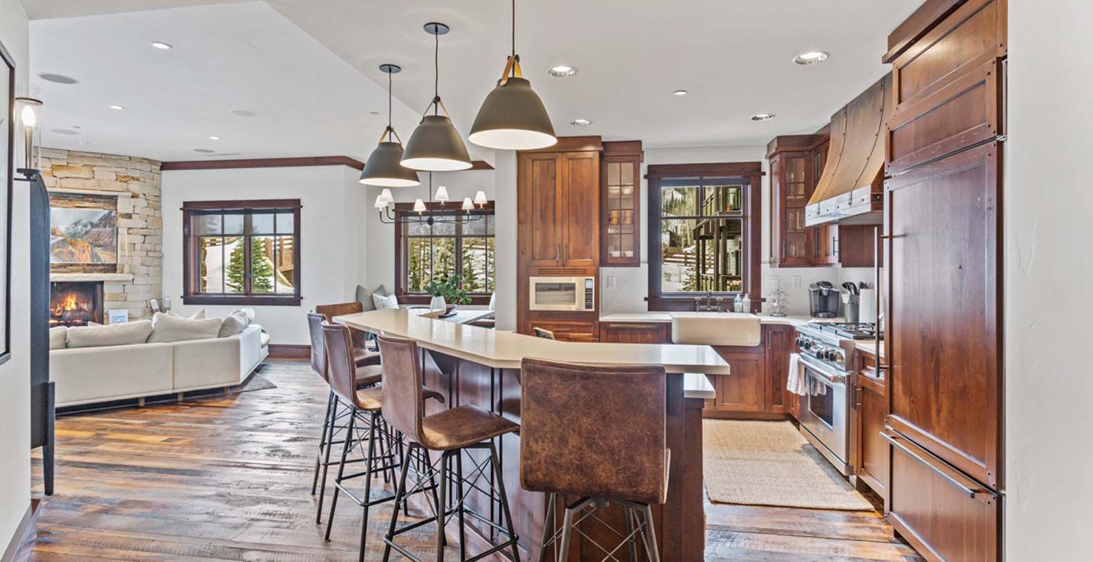 Inside this alpine retreat, beautiful reclaimed hardwood floors shine under the warm natural light pouring in through large windows. The open layout ensures seamless conversation between the kitchen, dining, and living areas. Relax on the plush sectional or in one of the two upholstered armchairs while enjoying a movie on the 60” Samsung TV or basking in the glow of the cozy gas fireplace. Step out onto the balcony to find two patio chairs, a natural gas grill, and stunning mountain views. After an exhilarating day on the slopes, sip a glass of wine at the 5-seat bar in the chef’s kitchen, fully equipped with high-end appliances and a Wolf stovetop. Gather around the charming dining area that features bench seating and four chairs nestled in a picturesque windowed alcove, perfect for lively meals or board games. The bright primary bedroom overlooks the mountains and includes a king bed, a 50” TV, and direct access to the deck. Additionally, the two guest bedrooms consist of one with a comfortable twin-over-queen bunk bed and the other with two twin-over-twin bunk beds, providing ample space for family and friends.