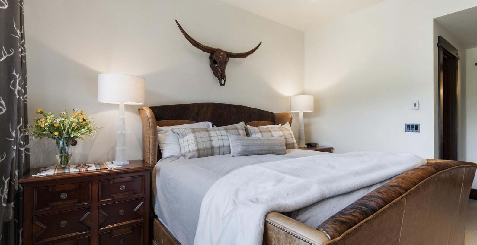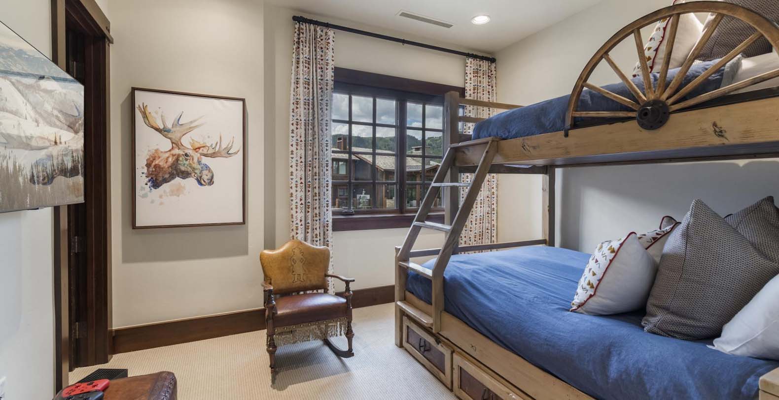 The spacious great room welcomes guests with a cozy mountain lodge ambiance, featuring beautiful hardwood floors, natural textures, and earthy colors. The focal point is a wall of windows offering breathtaking views of the outdoors. Relax on a plush couch and four armchairs in front of the TV, basking in the warm glow of the stacked-stone fireplace. The adjacent kitchen is equipped with high-end appliances, granite countertops, and dark wood cabinetry, perfect for preparing home-cooked meals. Gather around the traditional dining table that seats 8 beneath an antler chandelier, or enjoy casual bites at the 3 stool breakfast bar. From the great room, step out onto the outdoor balcony to enjoy incredible alpine views—lush green forests in summer and snowcapped mountains in winter. The condo offers a variety of private sleeping accommodations with bathrooms, including a primary bedroom with a king bed and jetted soaking tub, a guest bedroom with a queen bed, and a bunk room with a twin-over-full bed.