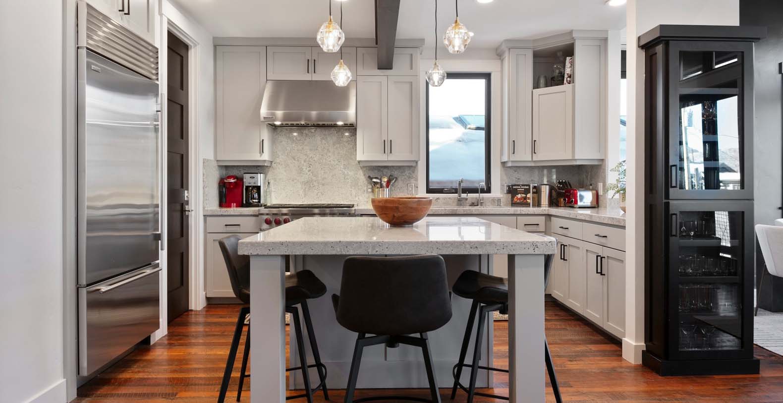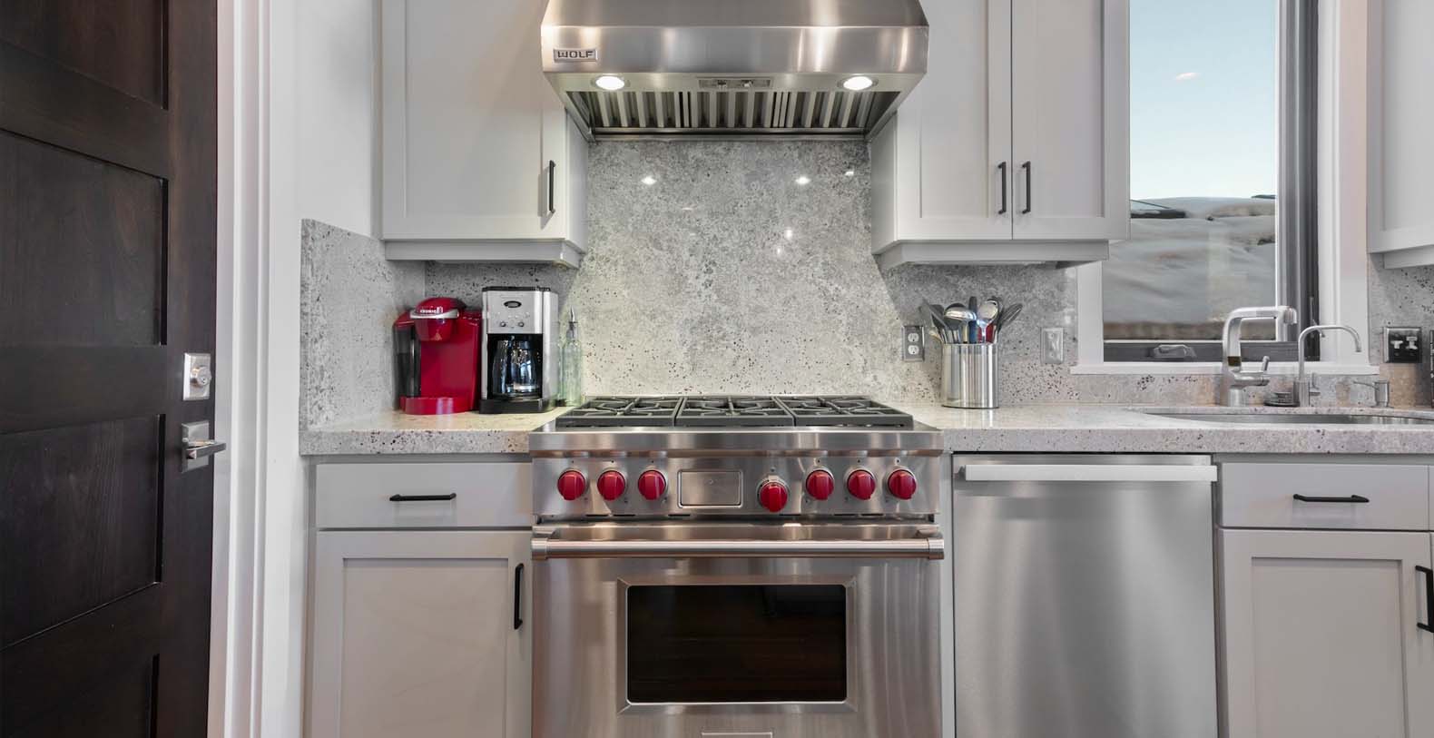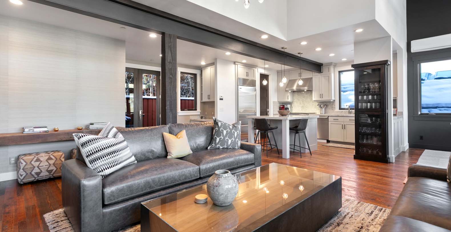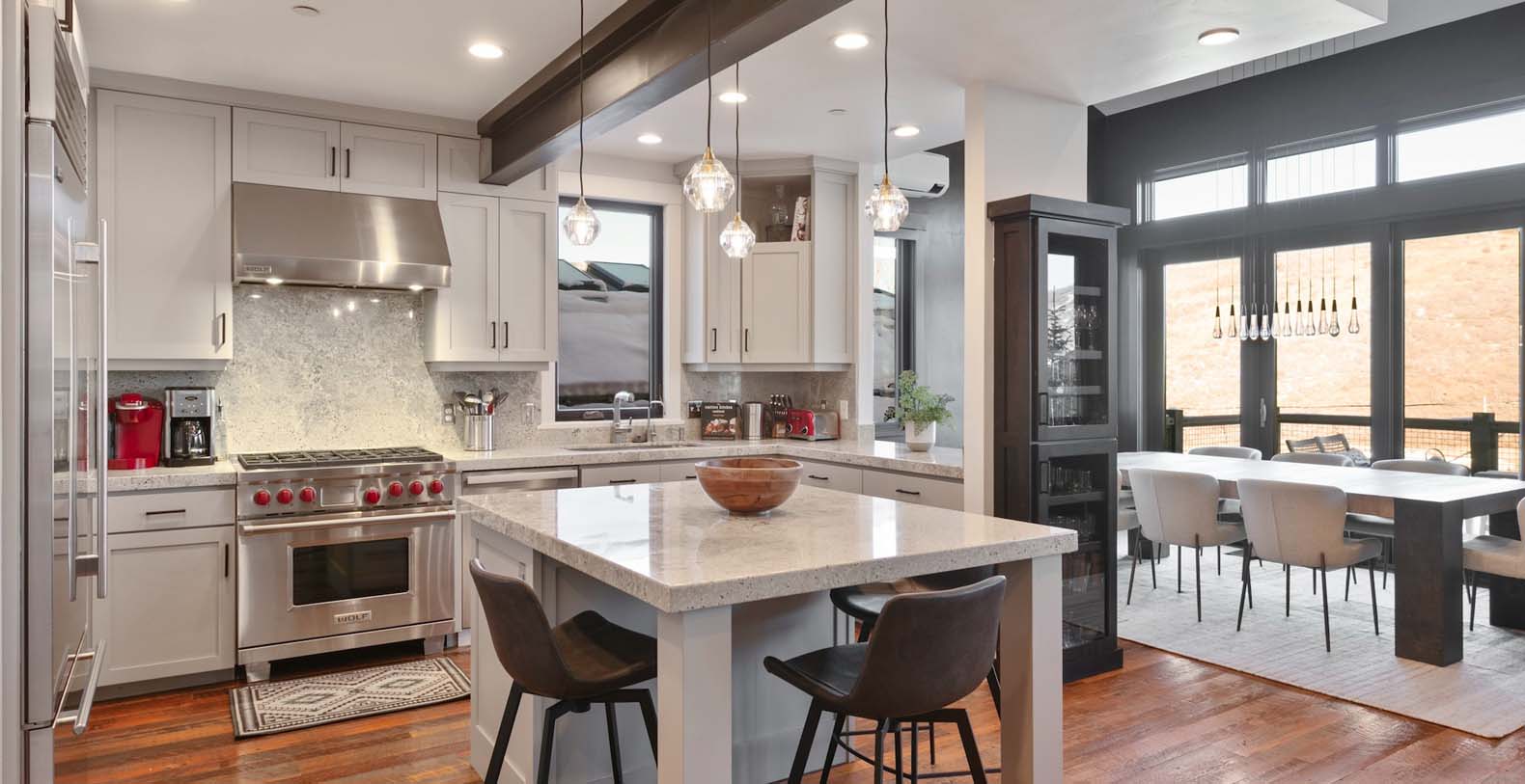 Inside, the third-floor great room showcases spectacular mountain views, warm décor, and modern accents. Unwind on two matching leather sofas beside the gas fireplace, or enjoy cocktails and cocoa in the cozy ambiance. The fully equipped corner kitchen features high-end appliances, including a Wolf stove, ideal for preparing après-ski snacks. Gather around the center island seating three or enjoy meals at the dining table for ten with breathtaking mountain vistas. Step outside to the patio for grilling or soak in the private hot tub overlooking the beautiful landscape.