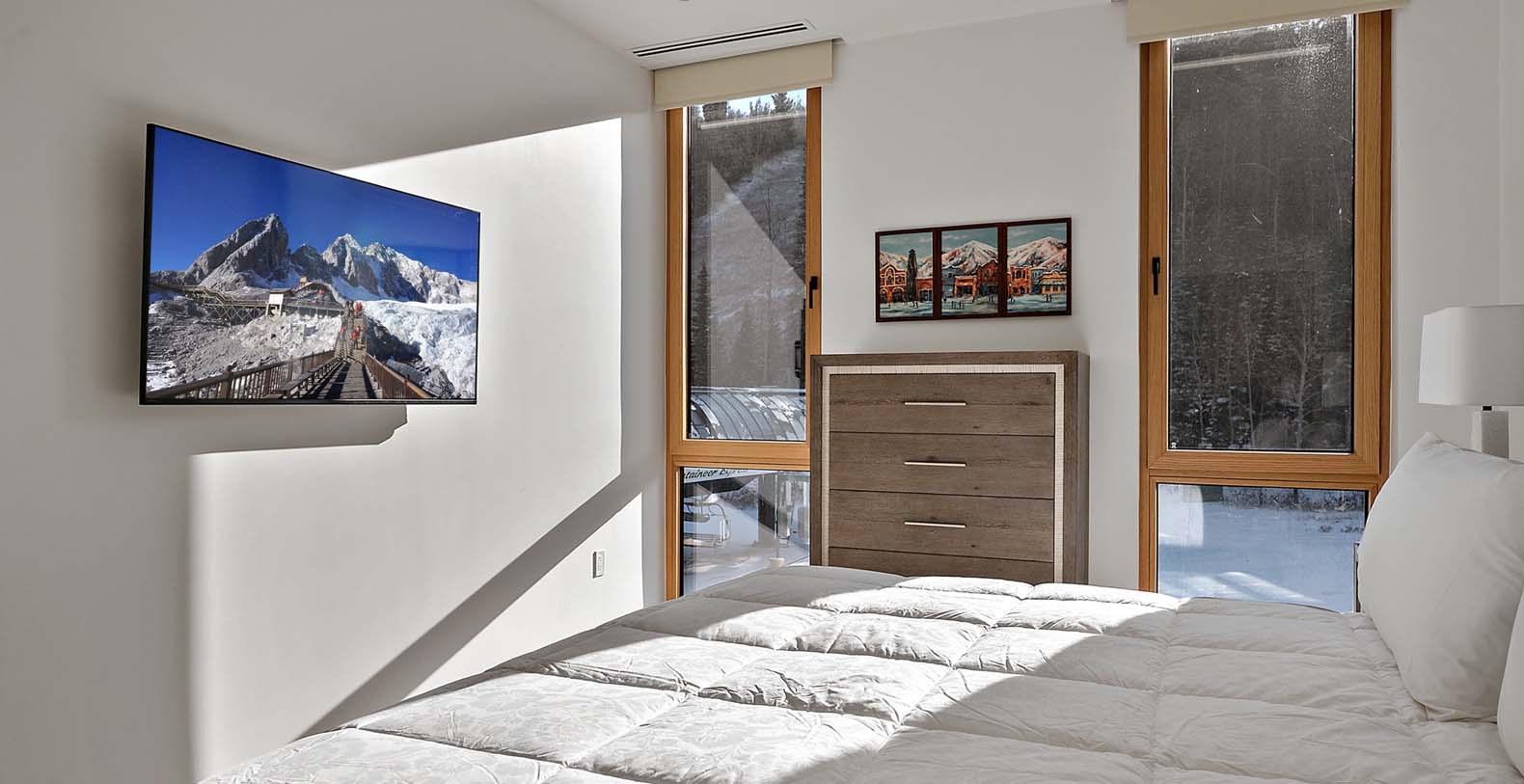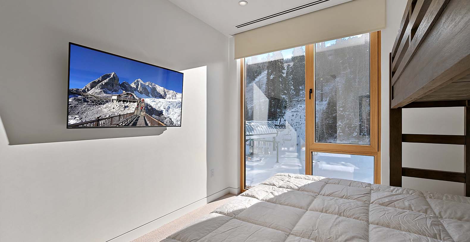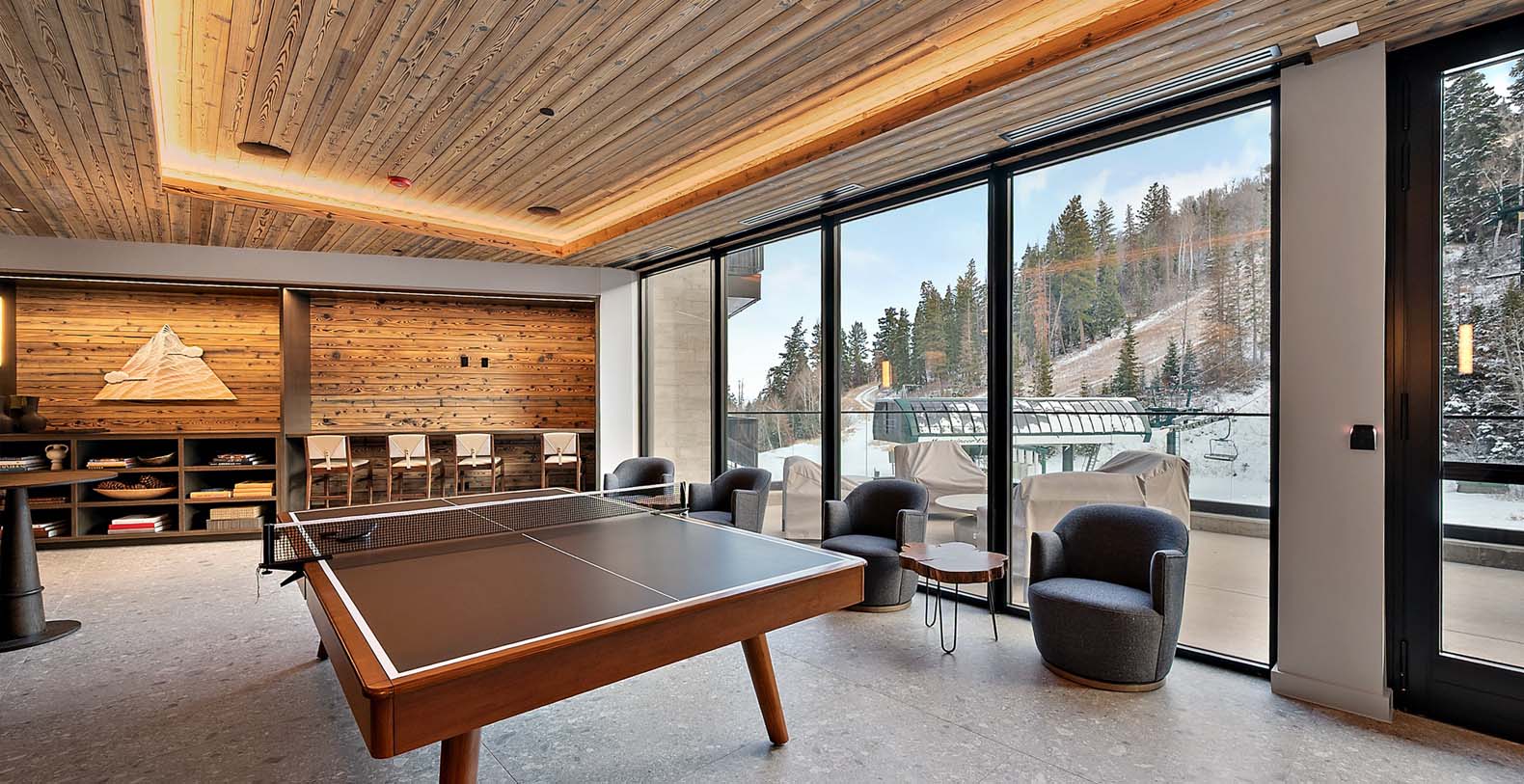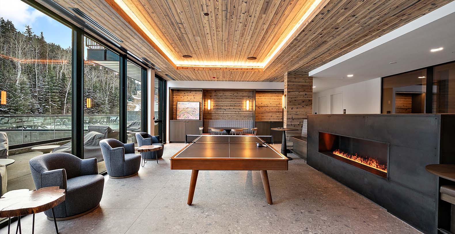 This stunning single-story condo showcases a blend of dark wood and stone, featuring a flowing floor plan that creates a seamless space for gathering. In the living area, floor-to-ceiling windows bathe the elegant furnishings and plank floors in golden sunlight. The gourmet kitchen boasts custom cabinetry and premium appliances, including a wine cooler, fostering a warm atmosphere ideal for cozy culinary evenings and cocktails at the 4-stool bar. A dining table positioned before a picture window invites 8 guests to relish meals amidst the surrounding natural beauty. After dining, sink into the plush comfort of the generous curved sectional and 2 barrel chairs, perfect for watching TV or enjoying the warmth of the steam fireplace. The expansive balcony extends from the living area, ideal for morning yoga during warmer months. The primary bedroom and guest bedroom both offer lavish king beds and private bathrooms; the primary bedroom also features a spacious balcony for refreshing morning air. Perfect for small families, the well-appointed bunk room includes a full-over-king bunk bed and a private bathroom. A convenient laundry room rounds out this exceptional condo.